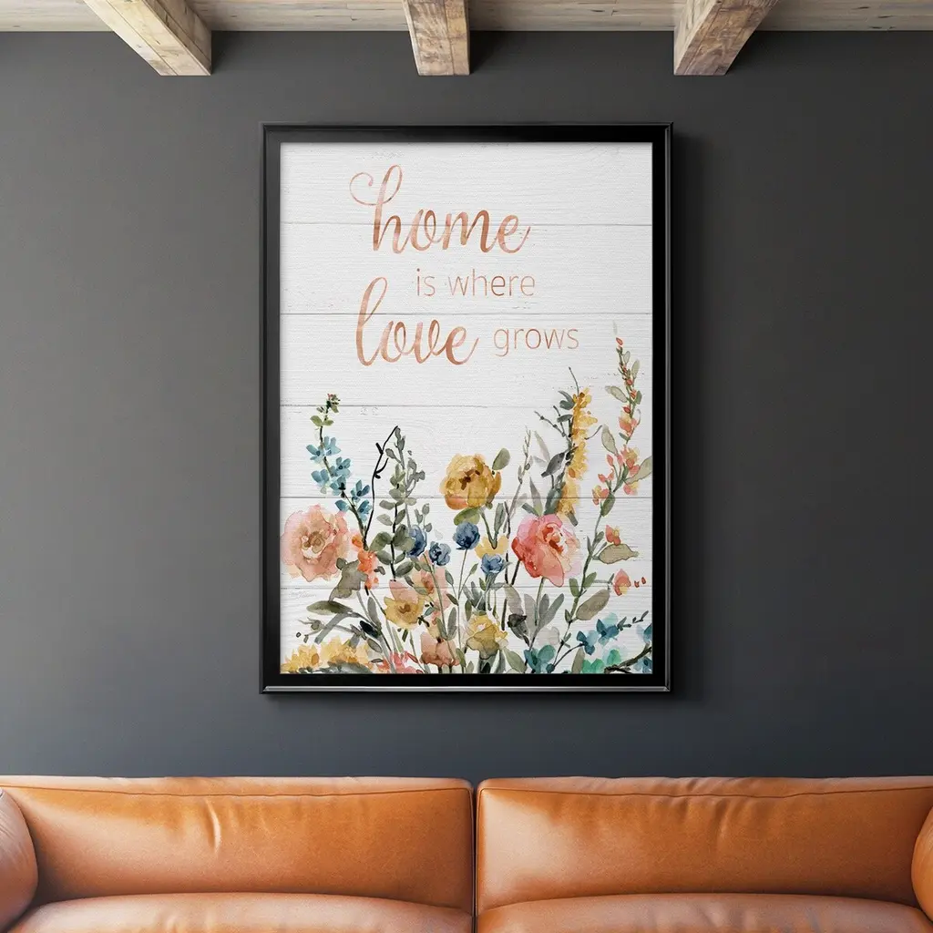 Home is Where Love Grows Premium Framed Print - Ready to Hang A Premium Framed Print created to last. Framed in distressed wood and available in an array of sizes and colors Featuring a beveled a solid wood stretcher bar, each piece comes ready to hand 4 SIZES AVAILABLE 30.5''X42.5'' - Overall Size 26.5'X36.5'' - Overall Size 22.5''x30.5'' - Overall Size 18.5''x24.5'' - Overall Size Each piece is made to order. Each piece comes with hanging hardware. Made in the USA Ready to Hang
