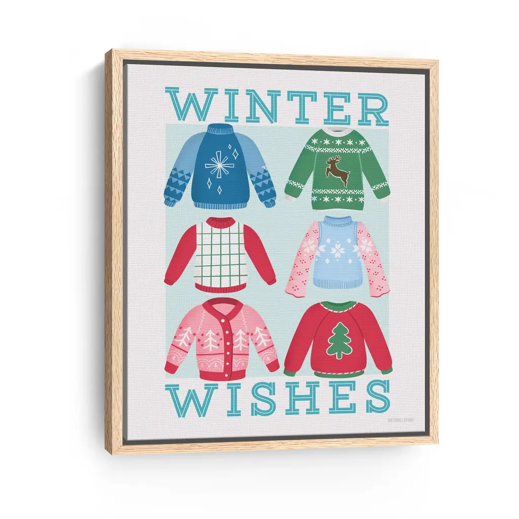 Celebrate the cozy charm of the season with this festive canvas print featuring colorful holiday sweaters and cheerful winter vibes. The playful patterns and vibrant palette bring warmth and personality to your Christmas decor. Our Gallery Wrap Canvas Prints are proudly assembled with high quality materials in California, USA. Each piece is printed on a thick, archival grade canvas using Giclee technology. It is then hand-stretched by our experienced artisans over solid wood bars, which will not warp over time. The final product is a piece personally crafted for you to confidently display on your wall. Care and Assembly: Ensure that the location of your piece has little to no exposure to heat, sunlight, and moisture. Wipe clean, only if needed. Each piece includes hanging hardware to hang on your wall vertically.