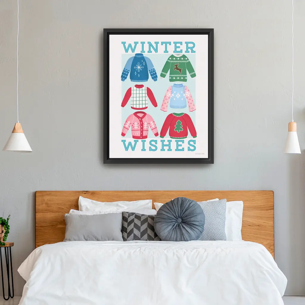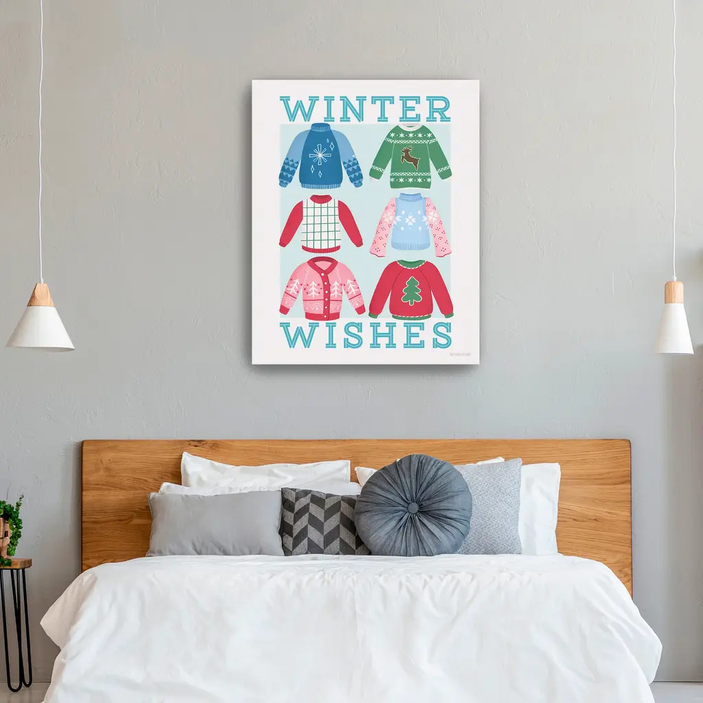 Celebrate the cozy charm of the season with this festive canvas print featuring colorful holiday sweaters and cheerful winter vibes. The playful patterns and vibrant palette bring warmth and personality to your Christmas decor. Our Gallery Wrap Canvas Prints are proudly assembled with high quality materials in California, USA. Each piece is printed on a thick, archival grade canvas using Giclee technology. It is then hand-stretched by our experienced artisans over solid wood bars, which will not warp over time. The final product is a piece personally crafted for you to confidently display on your wall. Care and Assembly: Ensure that the location of your piece has little to no exposure to heat, sunlight, and moisture. Wipe clean, only if needed. Each piece includes hanging hardware to hang on your wall vertically.