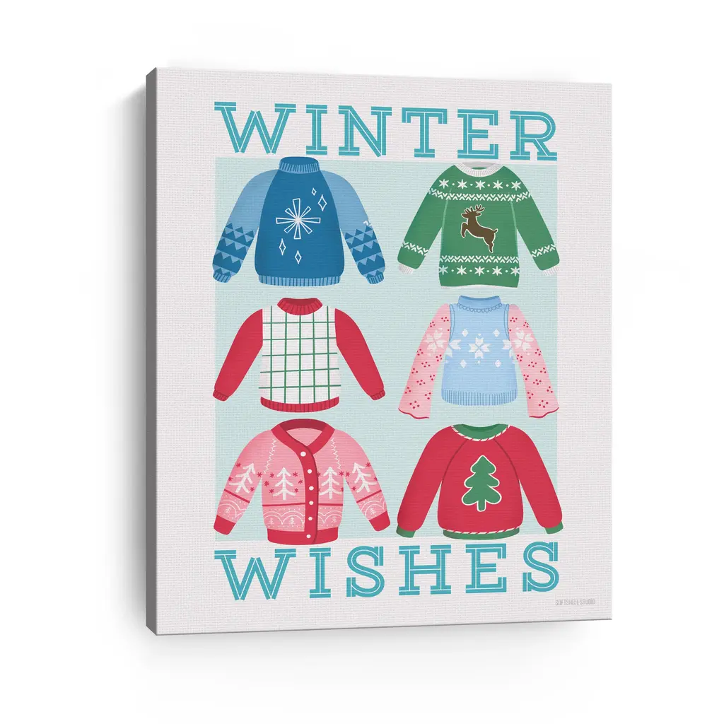 Celebrate the cozy charm of the season with this festive canvas print featuring colorful holiday sweaters and cheerful winter vibes. The playful patterns and vibrant palette bring warmth and personality to your Christmas decor. Our Gallery Wrap Canvas Prints are proudly assembled with high quality materials in California, USA. Each piece is printed on a thick, archival grade canvas using Giclee technology. It is then hand-stretched by our experienced artisans over solid wood bars, which will not warp over time. The final product is a piece personally crafted for you to confidently display on your wall. Care and Assembly: Ensure that the location of your piece has little to no exposure to heat, sunlight, and moisture. Wipe clean, only if needed. Each piece includes hanging hardware to hang on your wall vertically.