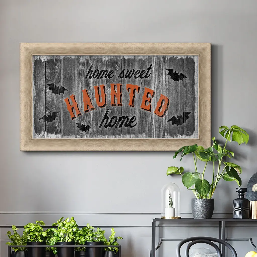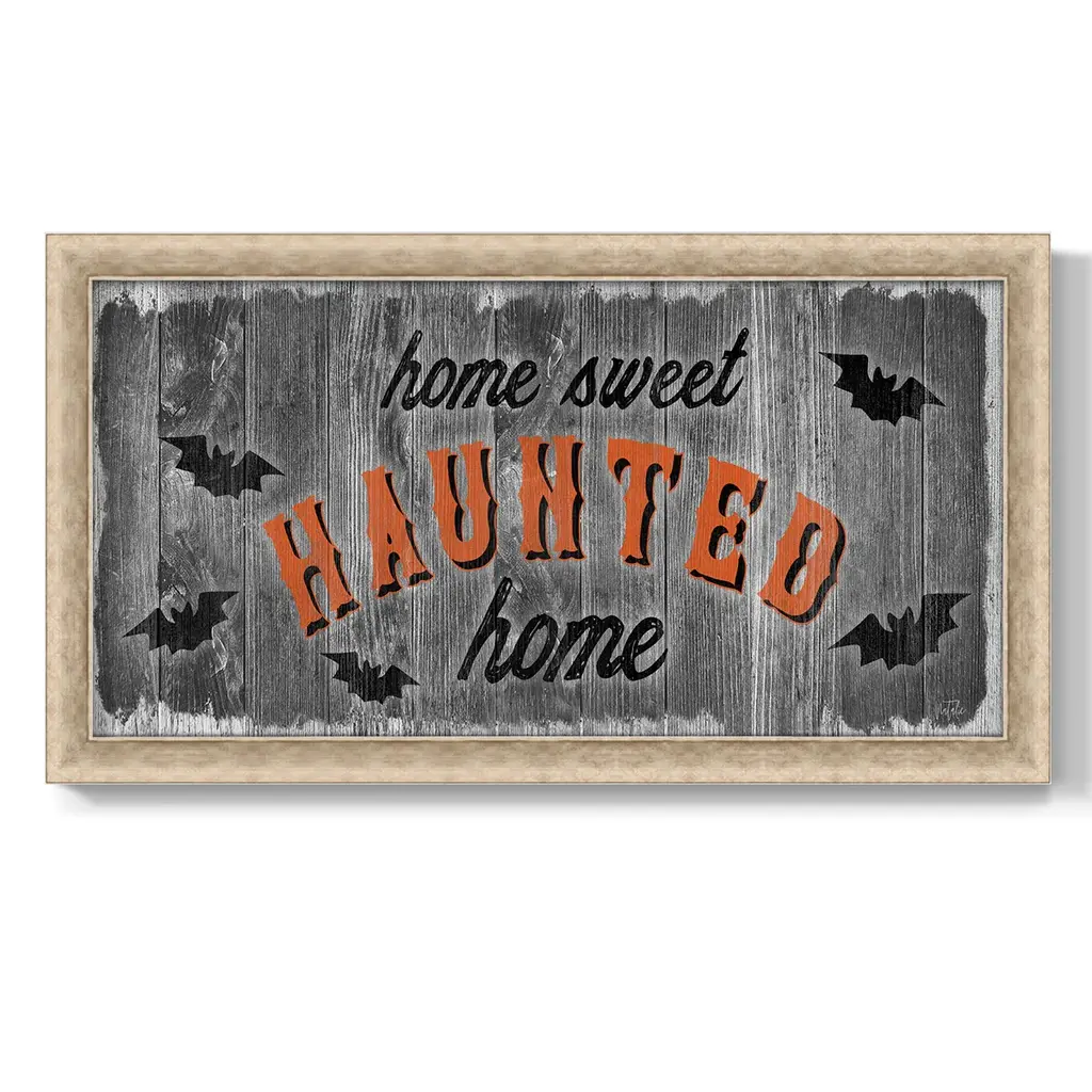 Home Sweet Haunted Premium Framed Canvas- Ready to Hang A Premium Framed Canvas created to last. Framed in distressed wood and available in an array of sizes and colors Featuring a beveled a solid wood stretcher bar, each piece comes ready to hand 3 SIZES AVAILABLE 21''X37'' - Overall Size 25''X45'' - Overall Size 29''x53'' - Overall Size Each piece is made to order. Each piece comes with hanging hardware. Made in the USA Ready to Hang Giclee Paper Print Acrylic Glass Beveled Matt Board