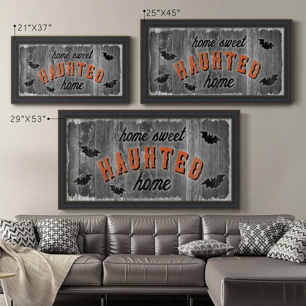 Home Sweet Haunted Premium Framed Canvas- Ready to Hang A Premium Framed Canvas created to last. Framed in distressed wood and available in an array of sizes and colors Featuring a beveled a solid wood stretcher bar, each piece comes ready to hand 3 SIZES AVAILABLE 21''X37'' - Overall Size 25''X45'' - Overall Size 29''x53'' - Overall Size Each piece is made to order. Each piece comes with hanging hardware. Made in the USA Ready to Hang Giclee Paper Print Acrylic Glass Beveled Matt Board