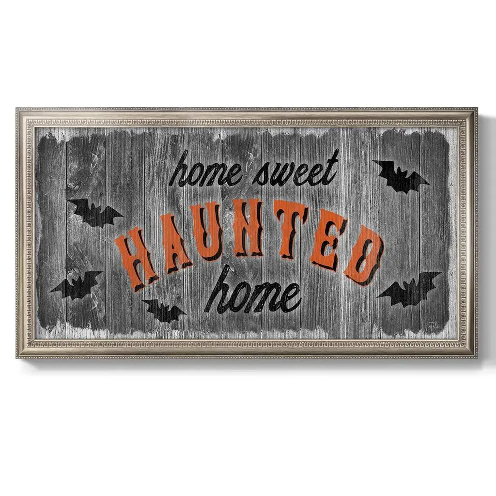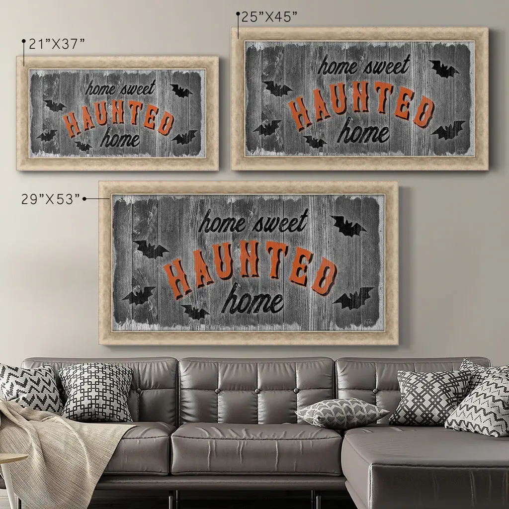 Home Sweet Haunted Premium Framed Canvas- Ready to Hang A Premium Framed Canvas created to last. Framed in distressed wood and available in an array of sizes and colors Featuring a beveled a solid wood stretcher bar, each piece comes ready to hand 3 SIZES AVAILABLE 21''X37'' - Overall Size 25''X45'' - Overall Size 29''x53'' - Overall Size Each piece is made to order. Each piece comes with hanging hardware. Made in the USA Ready to Hang Giclee Paper Print Acrylic Glass Beveled Matt Board