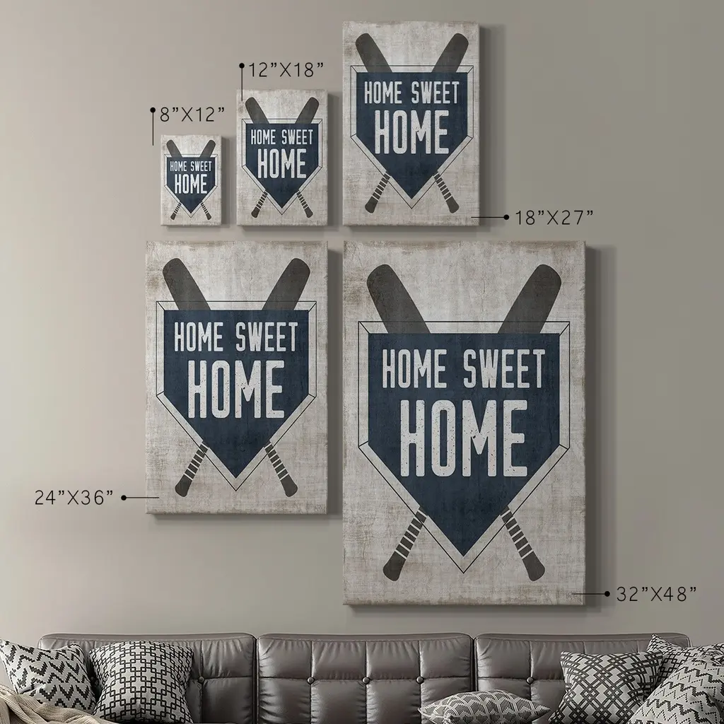 Home Sweet Home Base Premium Gallery Wrapped Canvas - Ready to Hang A premium hand stretched gallery wrapped canvas print created to last. Featuring a beveled a solid wood stretcher bar, each piece comes ready to hand 6 SIZES AVAILABLE 8''X12'' - Overall Size 12''X18'' - Overall Size 18''X27'' - Overall Size 24''x36'' - Overall Size 32''x48'' - Overall Size 40''x60'' - Overall Size Each piece is made to order. Built to Last Each piece comes ready to hang Solid wood stretcher Fade and Water resistant Made domestically