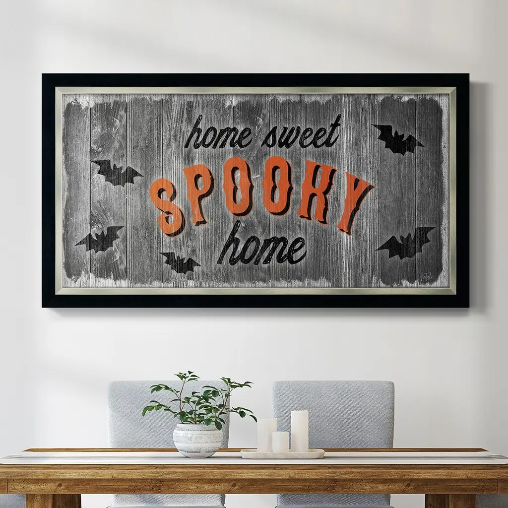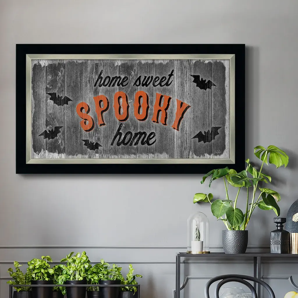 Home Sweet Spooky Premium Framed Canvas- Ready to Hang A Premium Framed Canvas created to last. Framed in distressed wood and available in an array of sizes and colors Featuring a beveled a solid wood stretcher bar, each piece comes ready to hand 3 SIZES AVAILABLE 21''X37'' - Overall Size 25''X45'' - Overall Size 29''x53'' - Overall Size Each piece is made to order. Each piece comes with hanging hardware. Made in the USA Ready to Hang Giclee Paper Print Acrylic Glass Beveled Matt Board