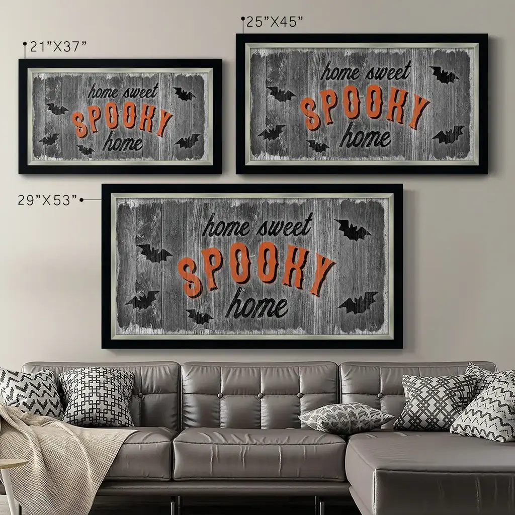 Home Sweet Spooky Premium Framed Canvas- Ready to Hang A Premium Framed Canvas created to last. Framed in distressed wood and available in an array of sizes and colors Featuring a beveled a solid wood stretcher bar, each piece comes ready to hand 3 SIZES AVAILABLE 21''X37'' - Overall Size 25''X45'' - Overall Size 29''x53'' - Overall Size Each piece is made to order. Each piece comes with hanging hardware. Made in the USA Ready to Hang Giclee Paper Print Acrylic Glass Beveled Matt Board