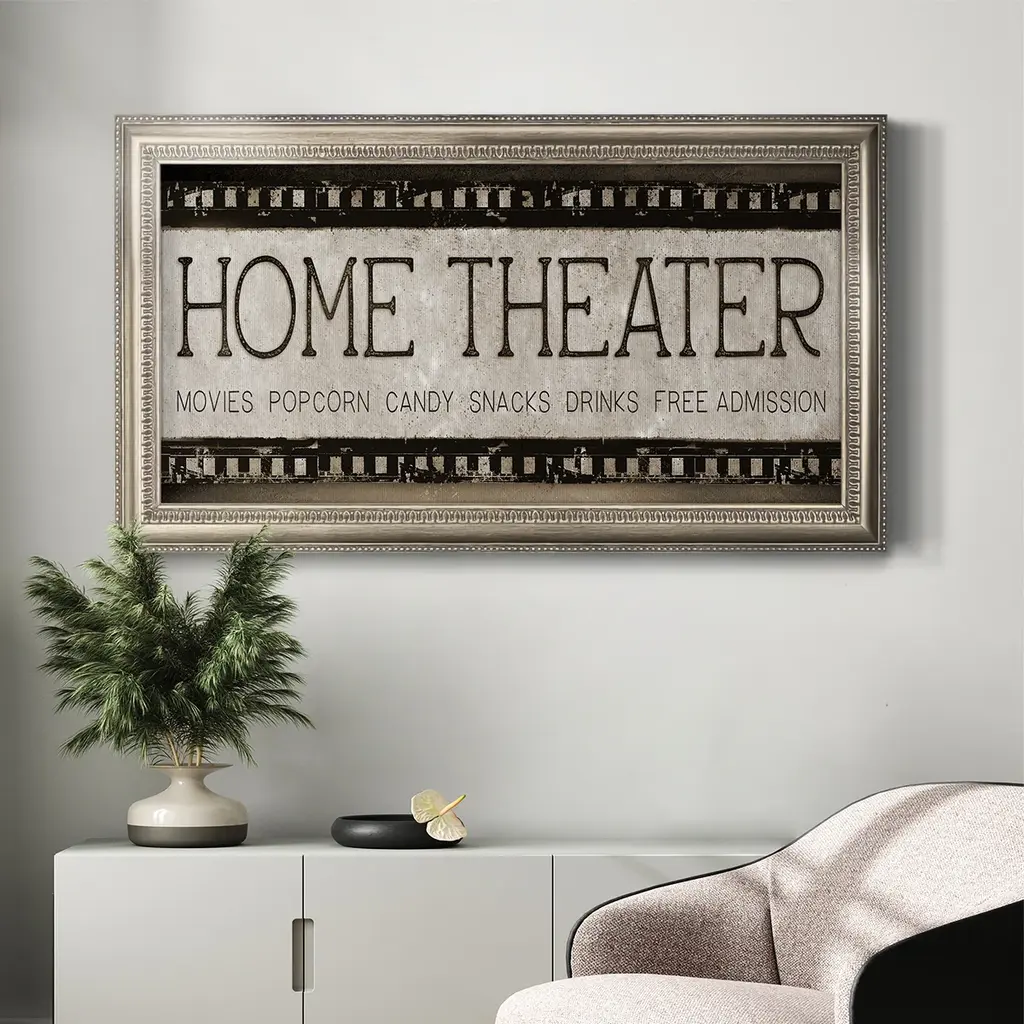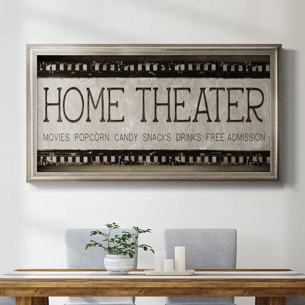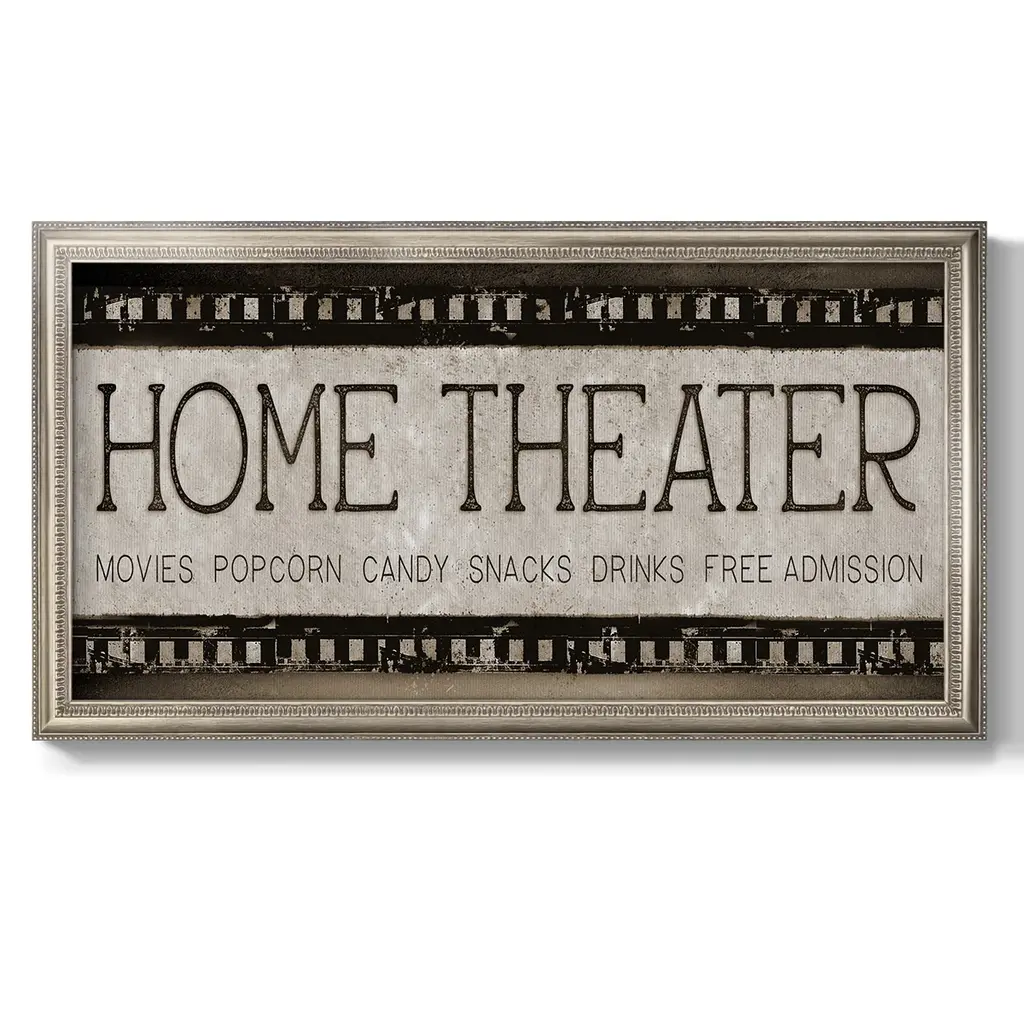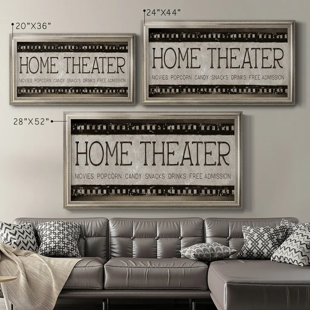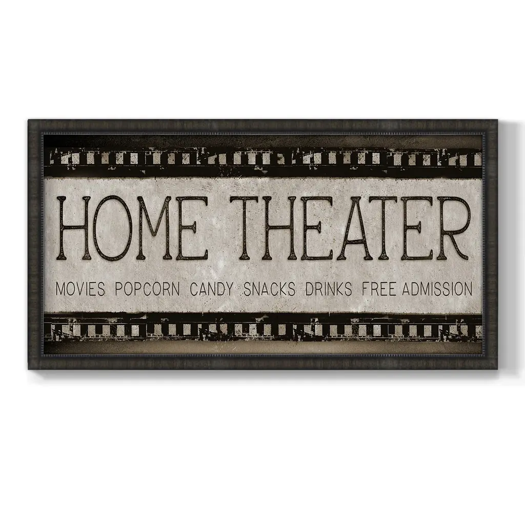 Home Theater Premium Framed Canvas- Ready to Hang A Premium Framed Canvas created to last. Framed in distressed wood and available in an array of sizes and colors Featuring a beveled a solid wood stretcher bar, each piece comes ready to hand 3 SIZES AVAILABLE 21''X37'' - Overall Size 25''X45'' - Overall Size 29''x53'' - Overall Size Each piece is made to order. Each piece comes with hanging hardware. Made in the USA Ready to Hang Giclee Paper Print Acrylic Glass Beveled Matt Board