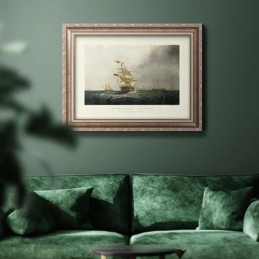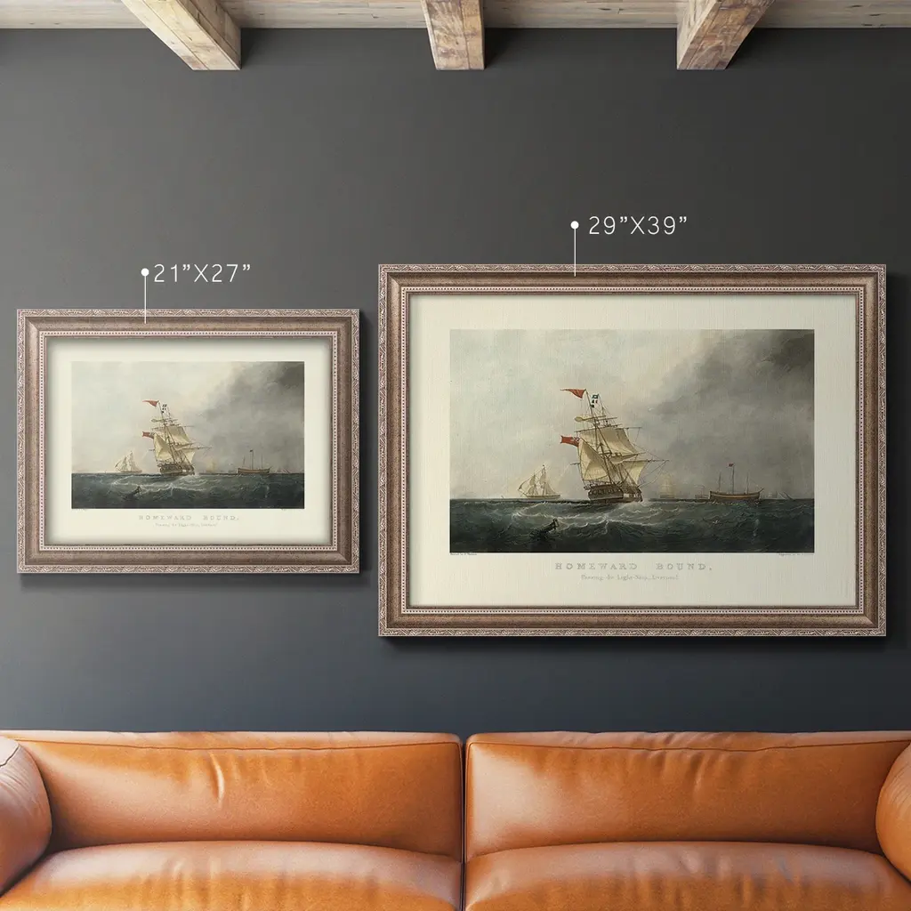Homeward Bound Premium Framed Canvas- Ready to Hang A Premium Framed Canvas created to last. Framed in distressed wood and available in an array of sizes and colors Featuring a beveled a solid wood stretcher bar, each piece comes ready to hand 3 SIZES AVAILABLE 16''X20'' - Overall Size 18'X27'' - Overall Size 24''x36'' - Overall Size Each piece is made to order. Each piece comes with hanging hardware. Made in the USA Ready to Hang Giclee Paper Print Acrylic Glass Beveled Matt Board
