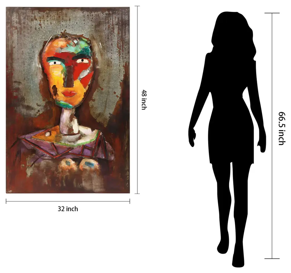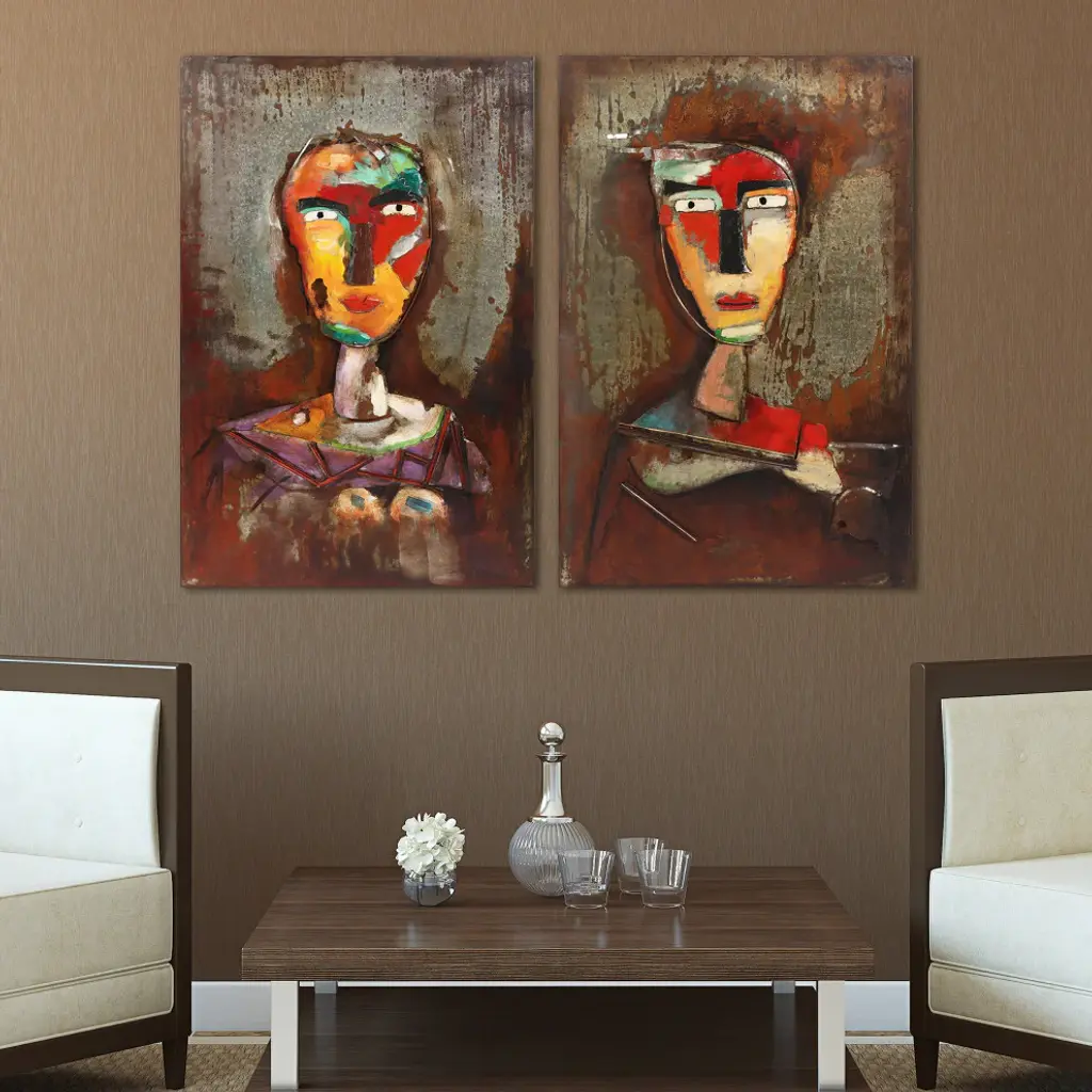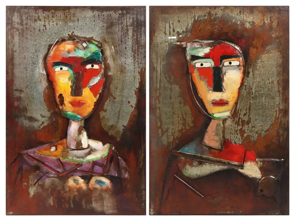 Diptych Set - 32" x 2.2" x 48" each. In the tradition of Picasso, this painted wall sculpture brings to mind the works of the famous Spanish artist. Done in an almost cubist style, this piece delivers different facets as it is viewed from different angles. Primo achieves this three dimensional feel using molded pieces of metal and painting effects.