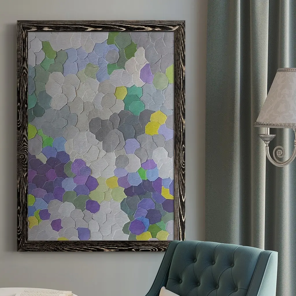 Contemporary patterned artwork of a honeycomb structures in different colors against a neutral background.