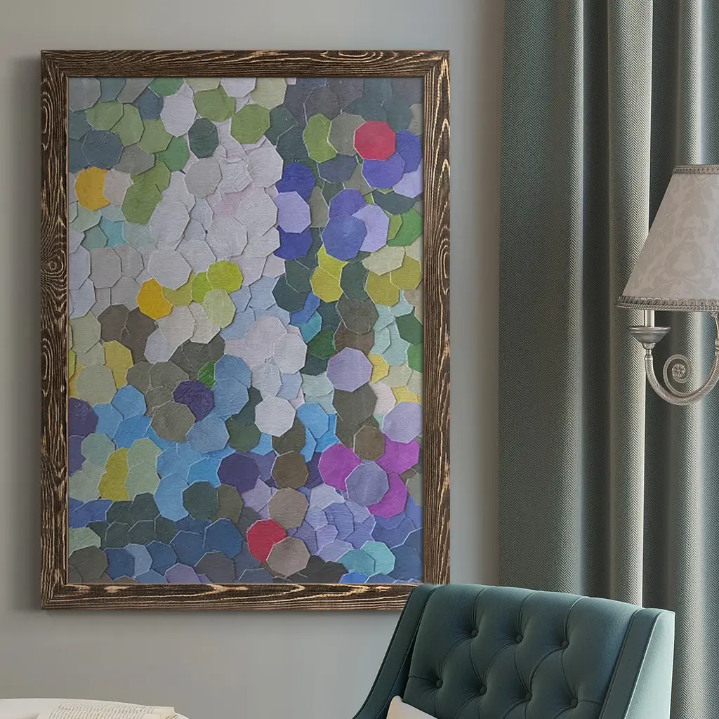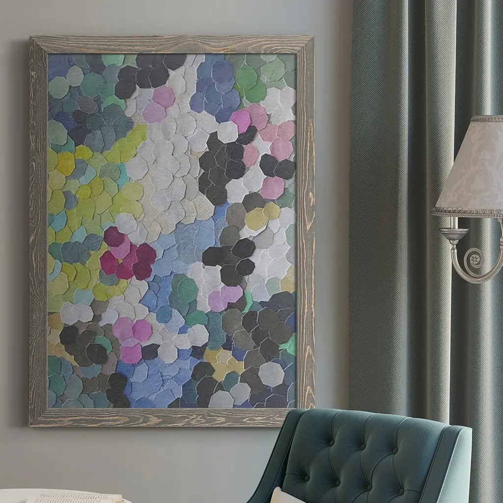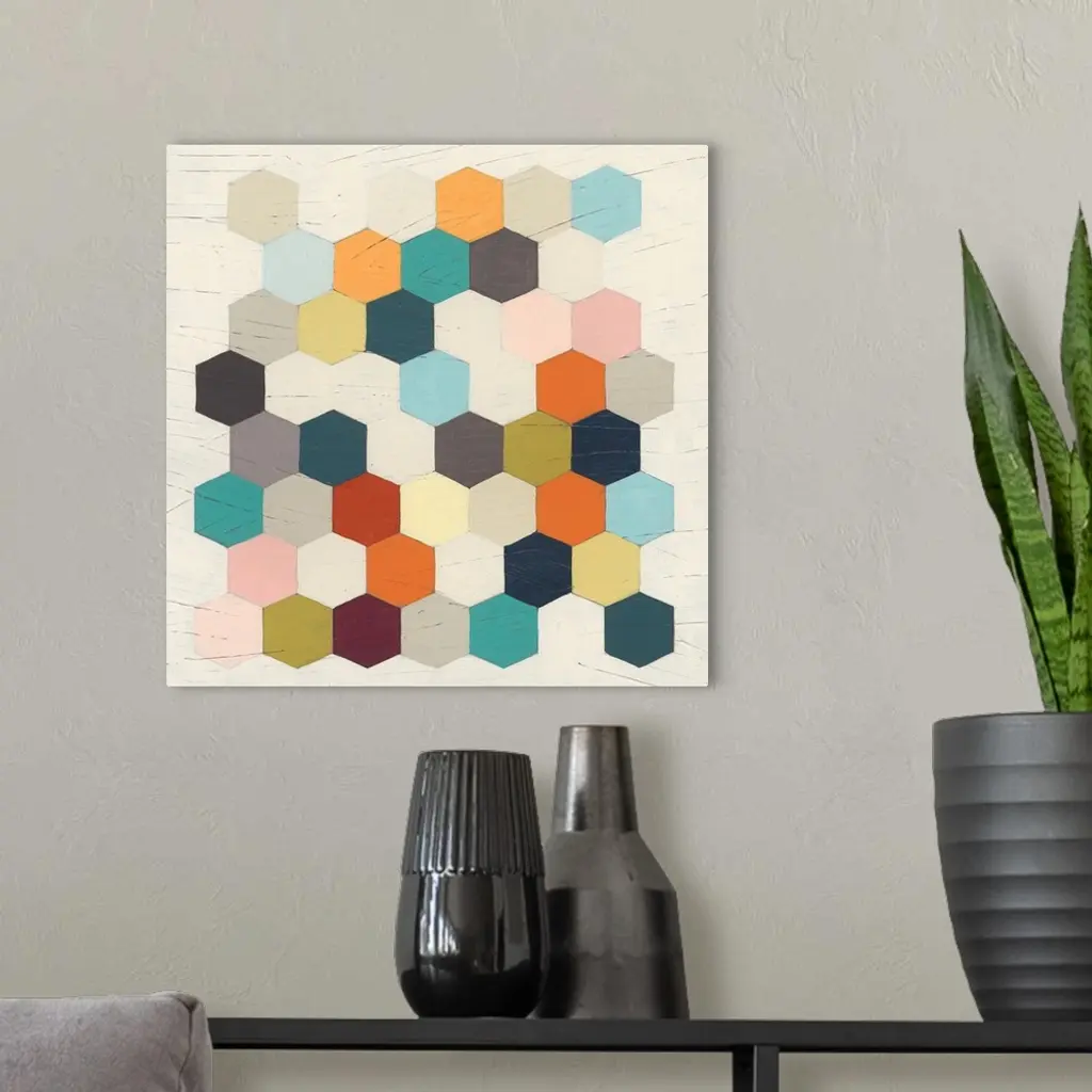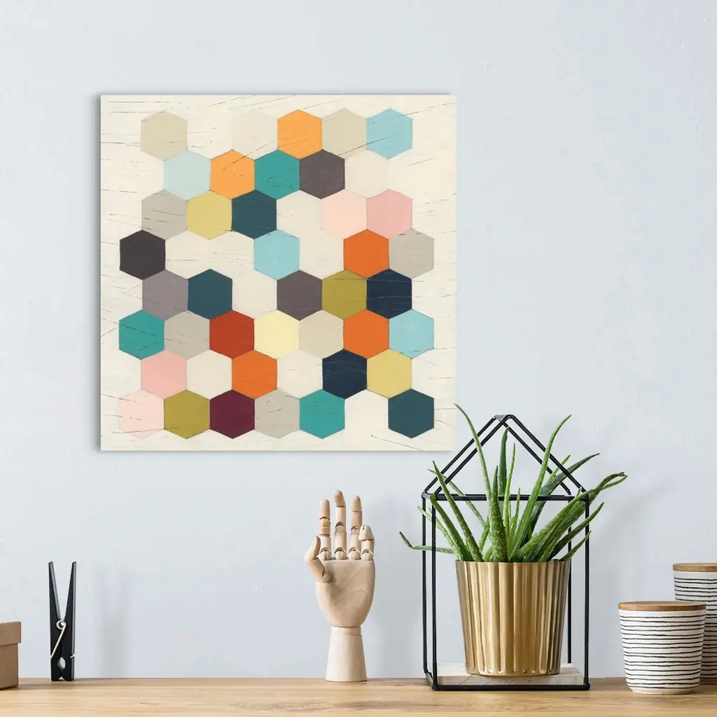 Contemporary patterned artwork of a honeycomb structures in different colors against a neutral background.