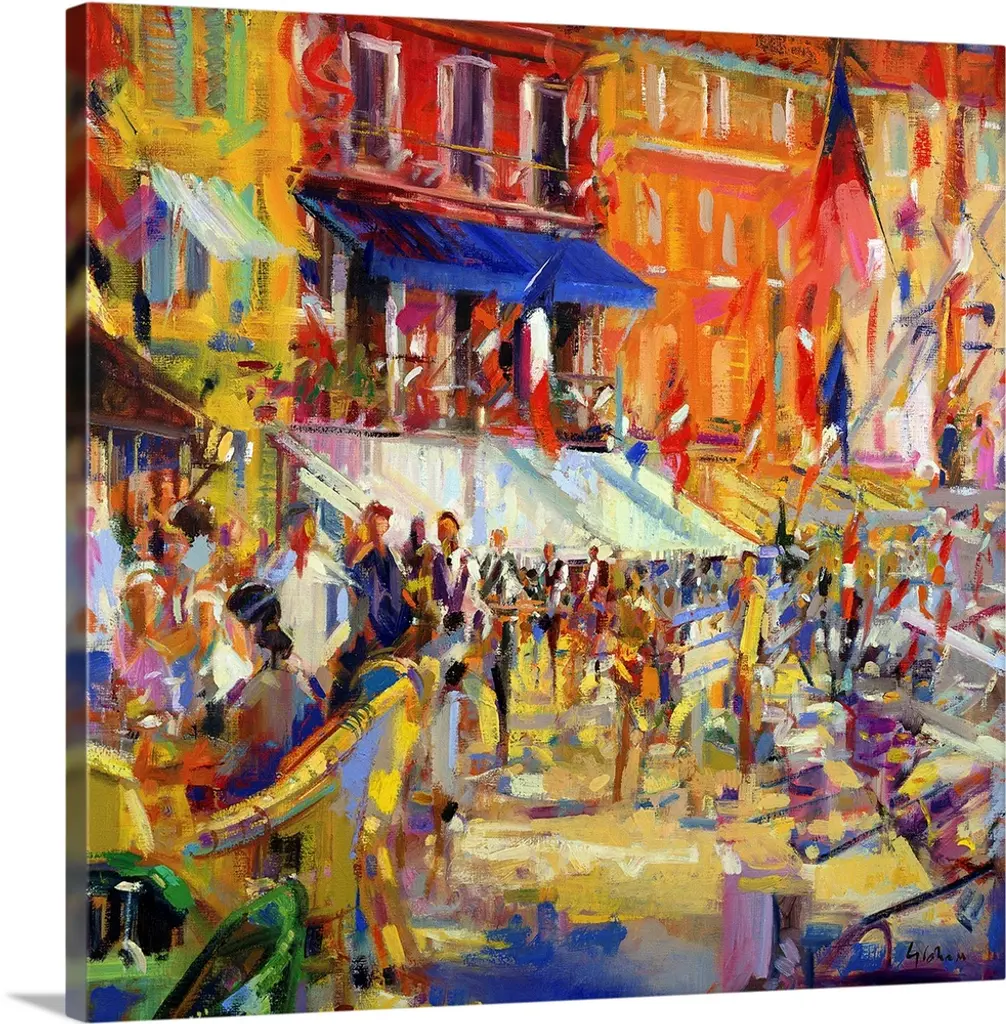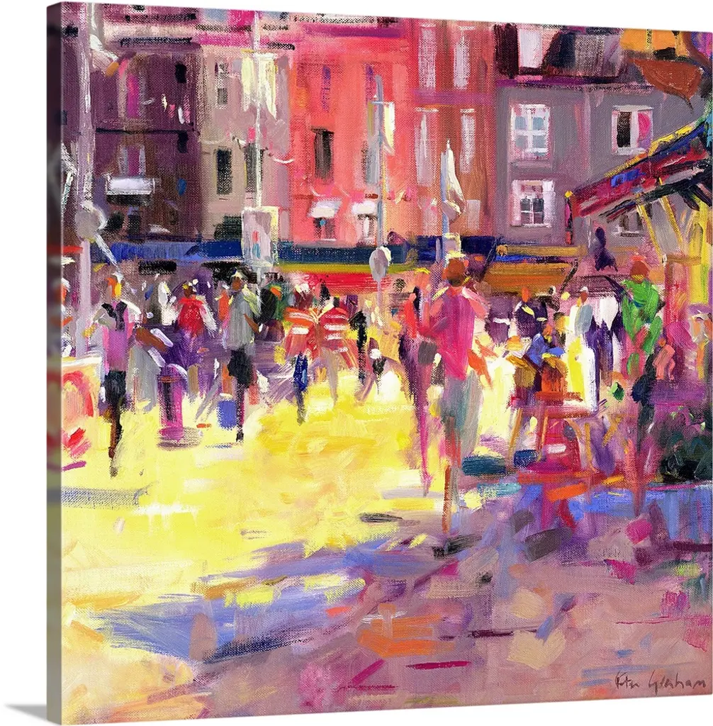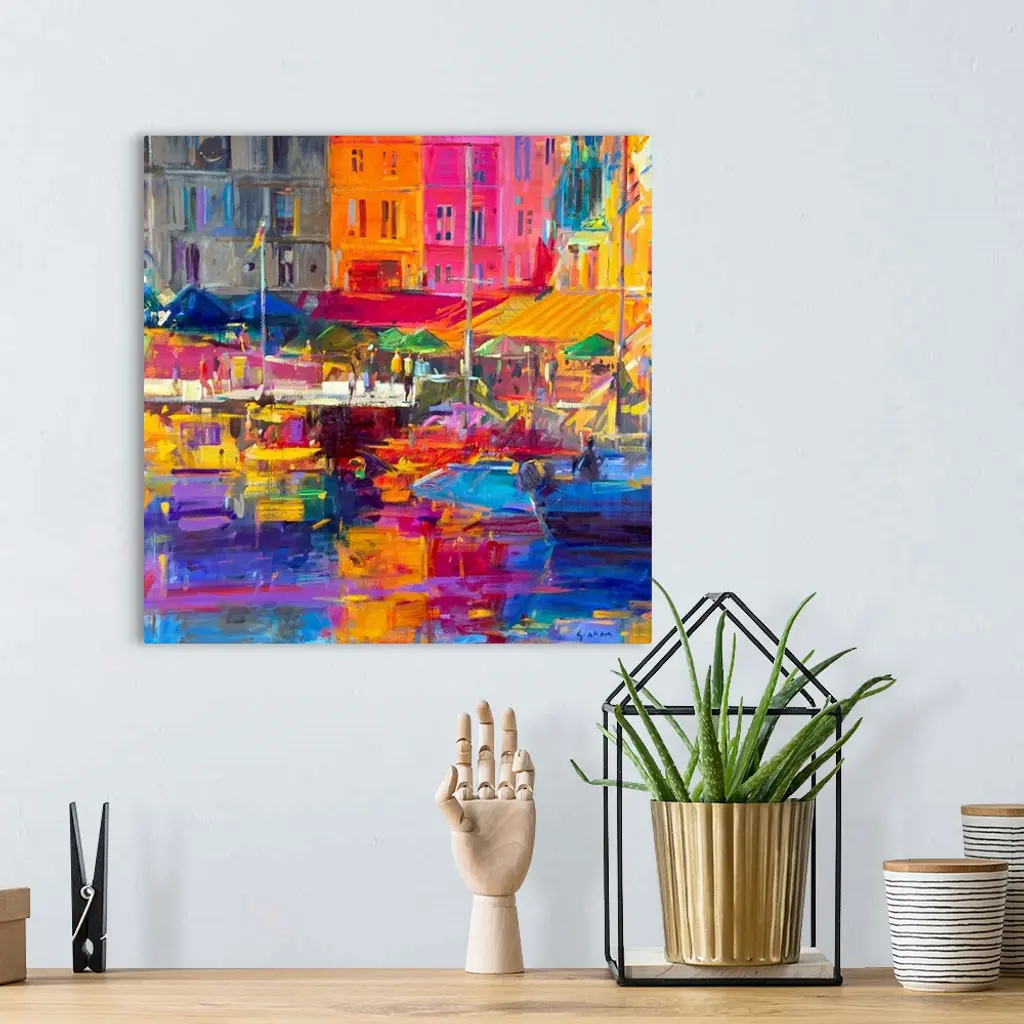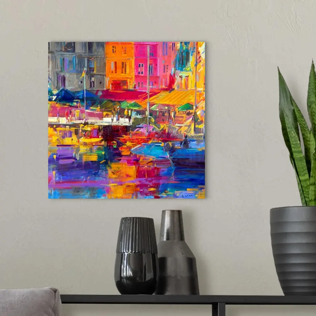 A landscape painting of a harbor painted with impressionistic brushstrokes and vivid unnatural hues.