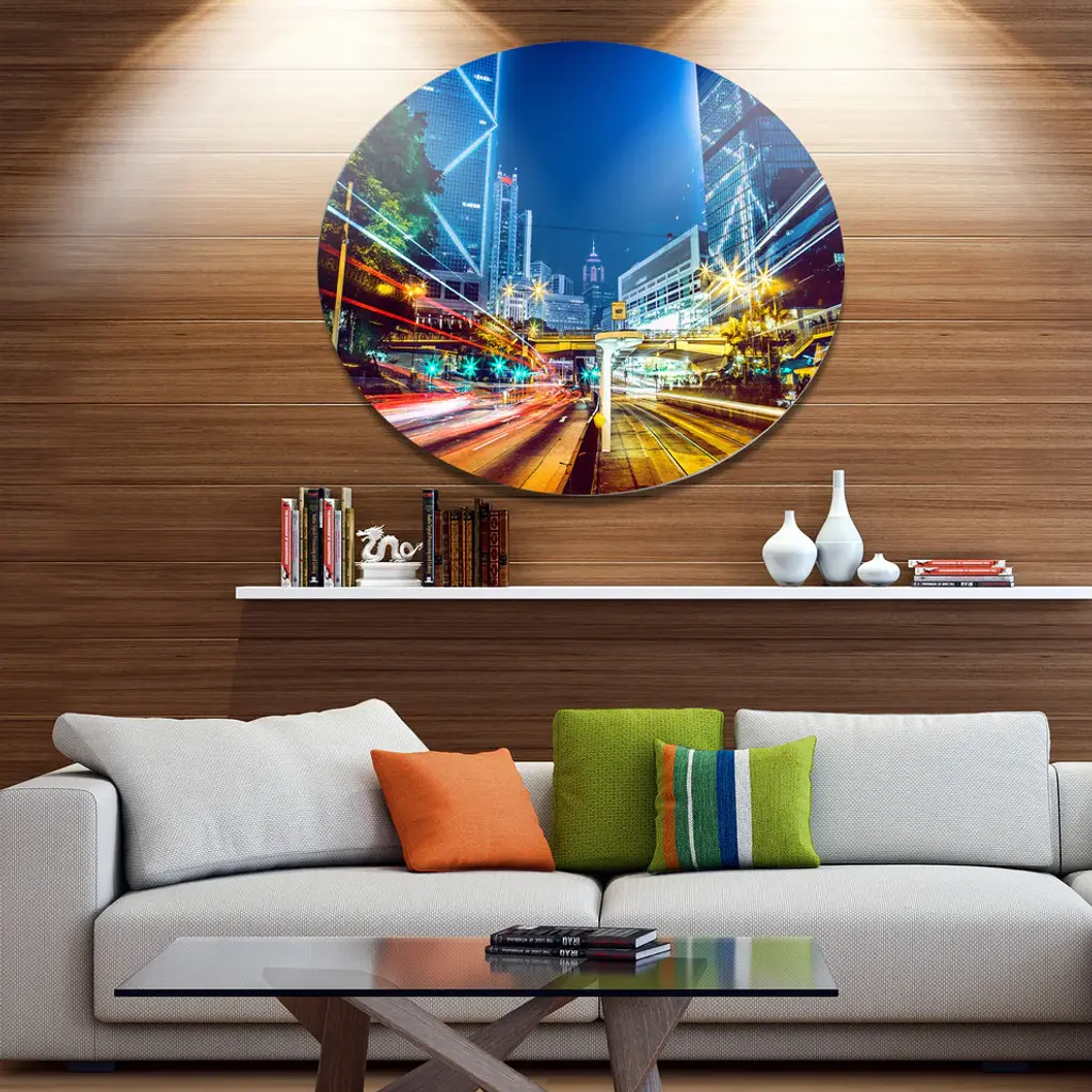 Bring Contemporary Abstraction to your home with this large Circle Metal wall art. This Hong Kong City Night Scene Metal Artwork makes it the focal point of any room or office. - White Gloss Coating ensures colors are extra vibrant with light reflection.- Aluminum grade Sheet Metal with 1 inch mounting frame on the back giving the illusion that the artwork is floating on the wall..- Mounting Brackets are included along with instructions.- High Quality Digital images are created directly into a glossy aluminum panel producing a stunning and captivating print into the glossy finish of the metal.- Water, Fire and Scratch resistant HD Aluminum panels.- Looks better than any photo paper and guaranteed to last at least 20 years- Easy to clean with a microfiber cloth. Colors are far superior to regular Canvas Art. - Easy to Hang