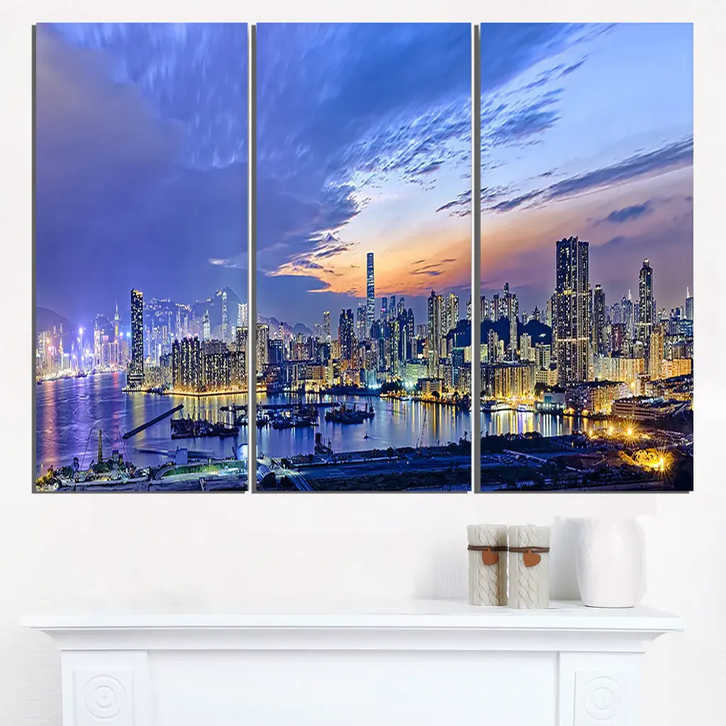Bring contemporary abstraction to your home with this large 36W x 28H Metal Wall Art. This Hong Kong City Sunset Panorama Metal Artwork makes it the focal point of any room or office. - White gloss coating ensures colors are extra vibrant with light reflection.- Aluminum grade sheet metal with 1-inch mounting frame on the back giving the illusion that the artwork is floating on the wall.- Mounting brackets are included along with instructions.- High quality digital images are created directly into a glossy aluminum panel producing a stunning and captivating print into the glossy finish of the metal.- Water, fire and scratch resistant HD aluminum panels.- Looks better than any photo paper and guaranteed to last at least 20 years- Easy to clean with a microfiber cloth. Colors are far superior to regular canvas art. - Easy to hang