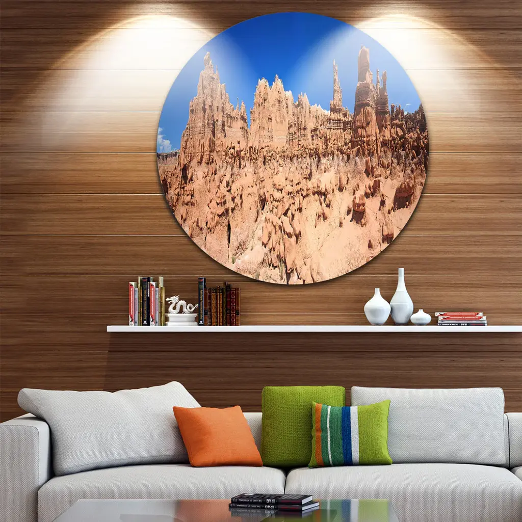 Bring Contemporary Abstraction to your home with this large Circle Metal wall art. This Hoodoo Rock Pinnacles in Goblin Valley Metal Artwork makes it the focal point of any room or office. - White Gloss Coating ensures colors are extra vibrant with light reflection.- Aluminum grade Sheet Metal with 1 inch mounting frame on the back giving the illusion that the artwork is floating on the wall..- Mounting Brackets are included along with instructions.- High Quality Digital images are created directly into a glossy aluminum panel producing a stunning and captivating print into the glossy finish of the metal.- Water, Fire and Scratch resistant HD Aluminum panels.- Looks better than any photo paper and guaranteed to last at least 20 years- Easy to clean with a microfiber cloth. Colors are far superior to regular Canvas Art. - Easy to Hang