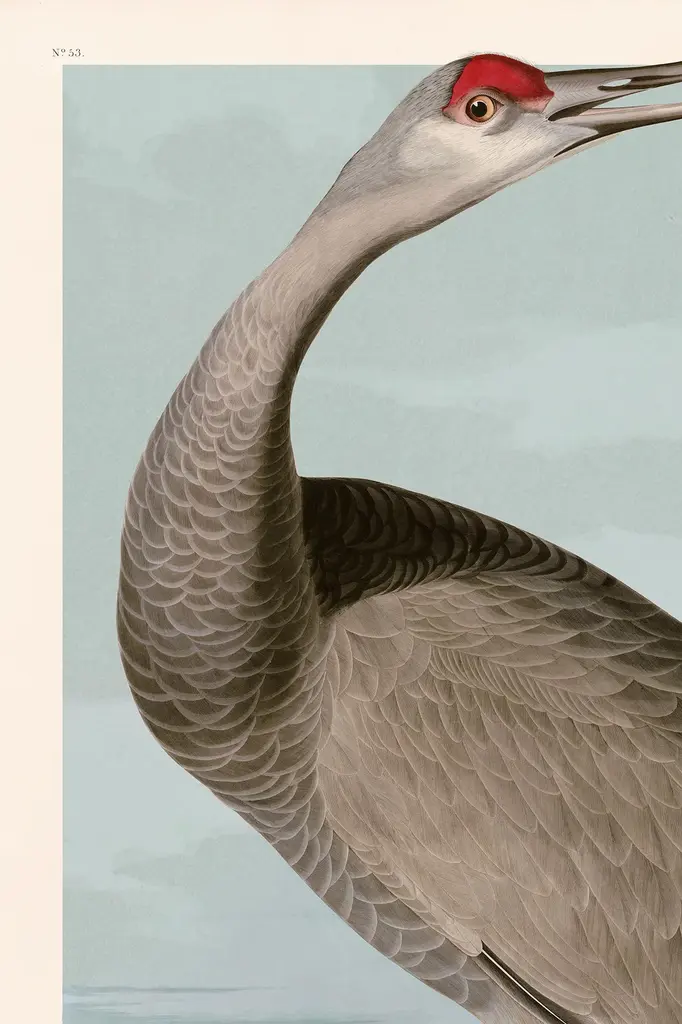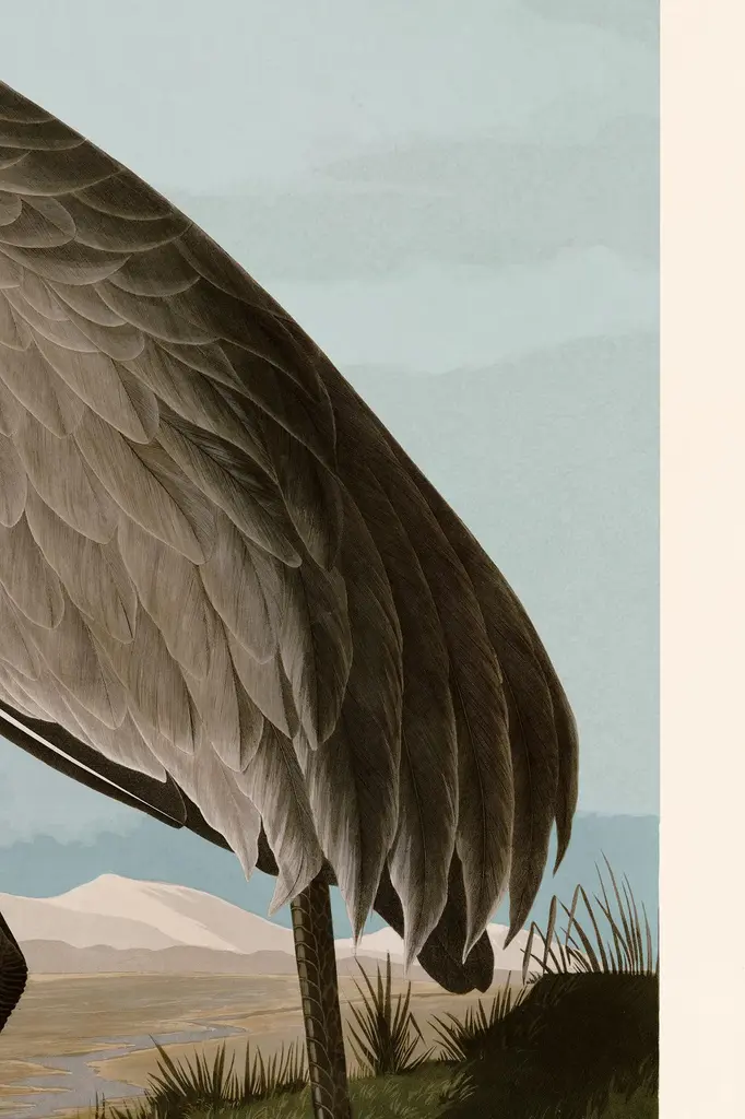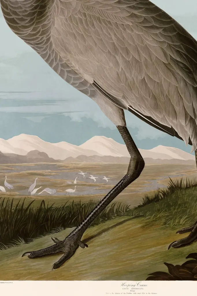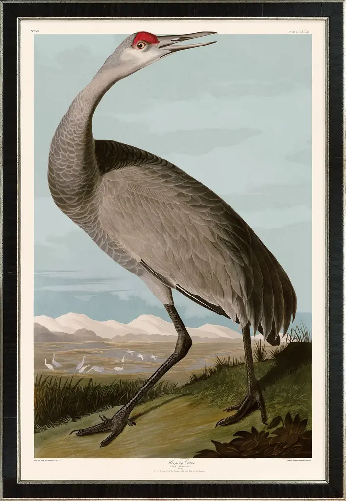 Giclee reproduction Hooping Crane Young from John J. Audubon's The Birds of North America Double Elephant Folio. Framed in a beautiful black wood moulding with acrylic glazing. The moulding is a real wood veneer moulding the is hand finished and made in Italy. Framed using archival acid free foam core and acrylic this giclee reproduction is the highest quality. The back has a dust cover and hooks and wire to easily hang on the wall. Please note that colors on your computer screen with vary slightly from what it actually is. The image is printed on acid free cotton rag paper with archival inks that have a light-fastness of over 140 years so it will not fade for a very, very long time. This has been produced and framed just outside of Atlanta Georgia in the USA.
