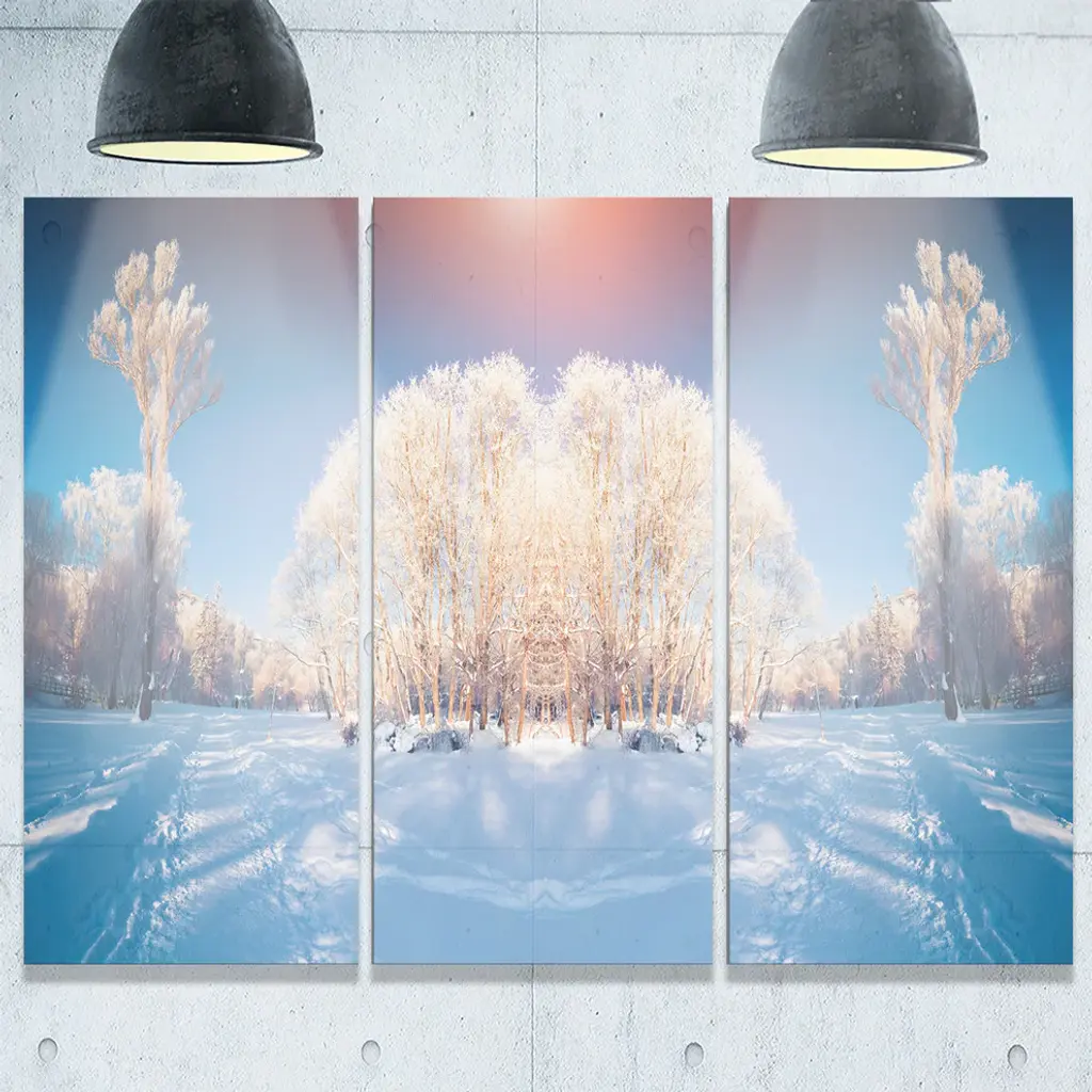 Bring contemporary abstraction to your home with this large 36W x 28H Metal Wall Art. This Horizontally Flipped Winter Trees Metal Artwork makes it the focal point of any room or office. - White gloss coating ensures colors are extra vibrant with light reflection.- Aluminum grade sheet metal with 1-inch mounting frame on the back giving the illusion that the artwork is floating on the wall.- Mounting brackets are included along with instructions.- High quality digital images are created directly into a glossy aluminum panel producing a stunning and captivating print into the glossy finish of the metal.- Water, fire and scratch resistant HD aluminum panels.- Looks better than any photo paper and guaranteed to last at least 20 years- Easy to clean with a microfiber cloth. Colors are far superior to regular canvas art. - Easy to hang