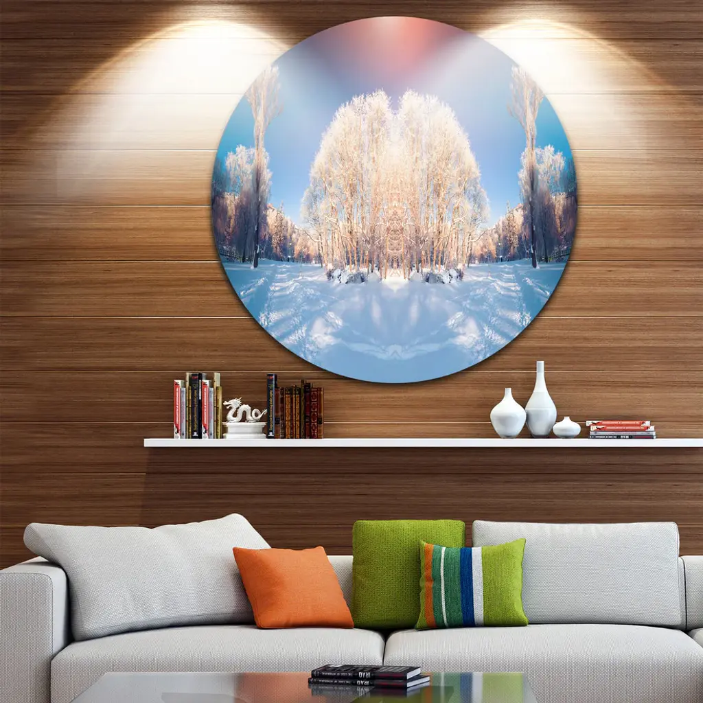 Bring Contemporary Abstraction to your home with this large Circle Metal wall art. This Horizontally Flipped Winter Trees Metal Artwork makes it the focal point of any room or office. - White Gloss Coating ensures colors are extra vibrant with light reflection.- Aluminum grade Sheet Metal with 1 inch mounting frame on the back giving the illusion that the artwork is floating on the wall..- Mounting Brackets are included along with instructions.- High Quality Digital images are created directly into a glossy aluminum panel producing a stunning and captivating print into the glossy finish of the metal.- Water, Fire and Scratch resistant HD Aluminum panels.- Looks better than any photo paper and guaranteed to last at least 20 years- Easy to clean with a microfiber cloth. Colors are far superior to regular Canvas Art. - Easy to Hang