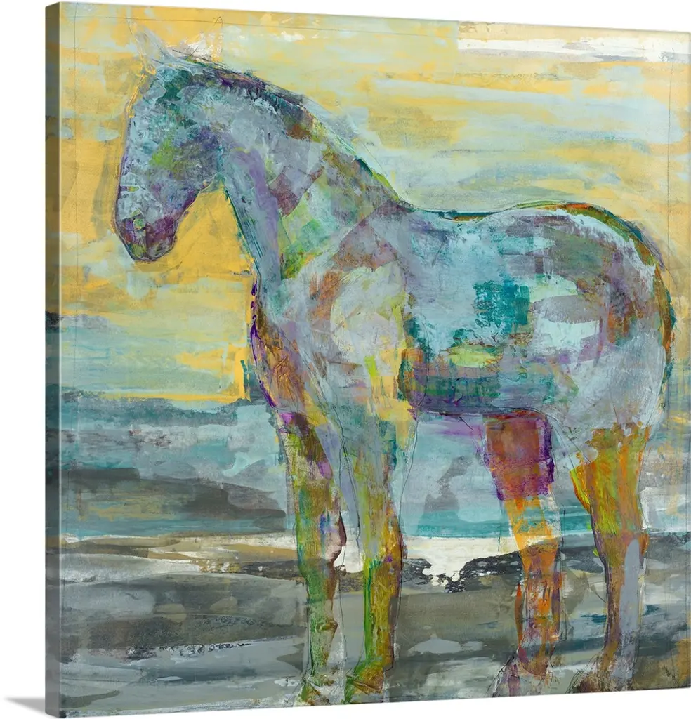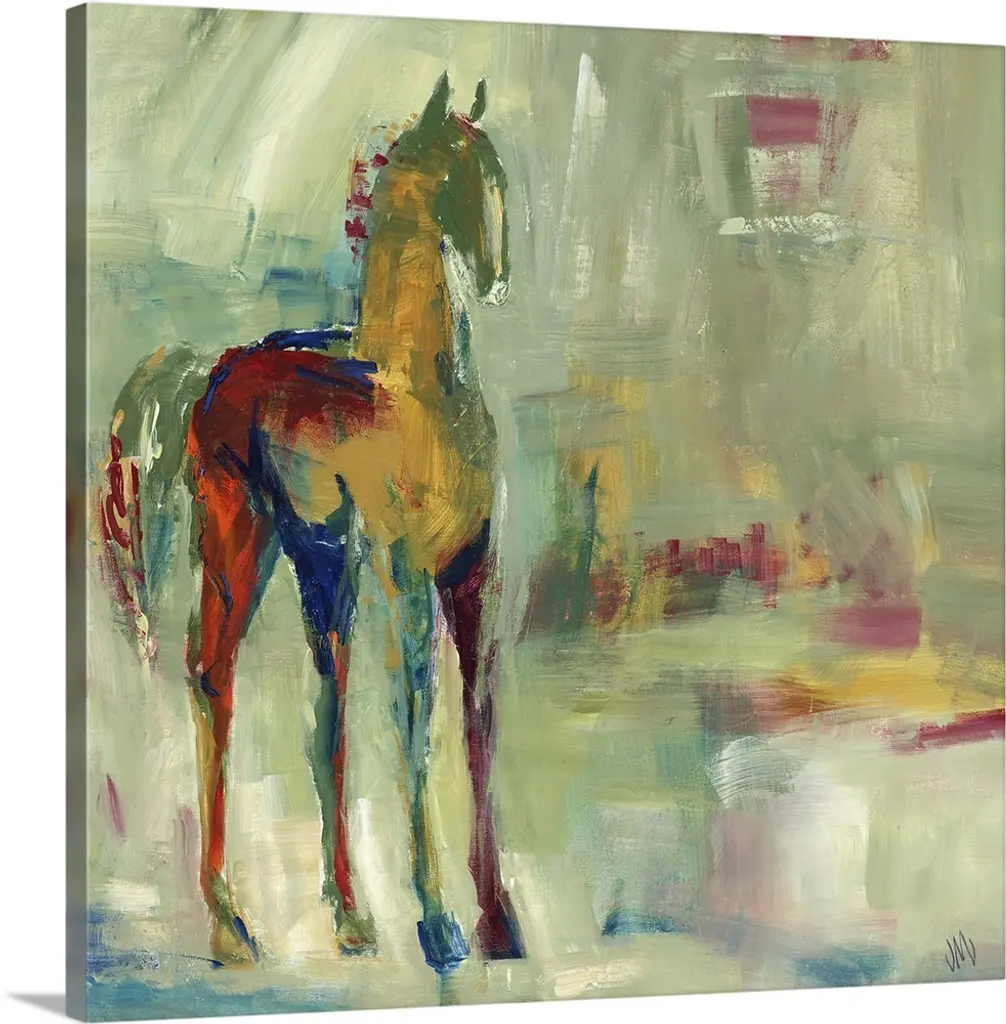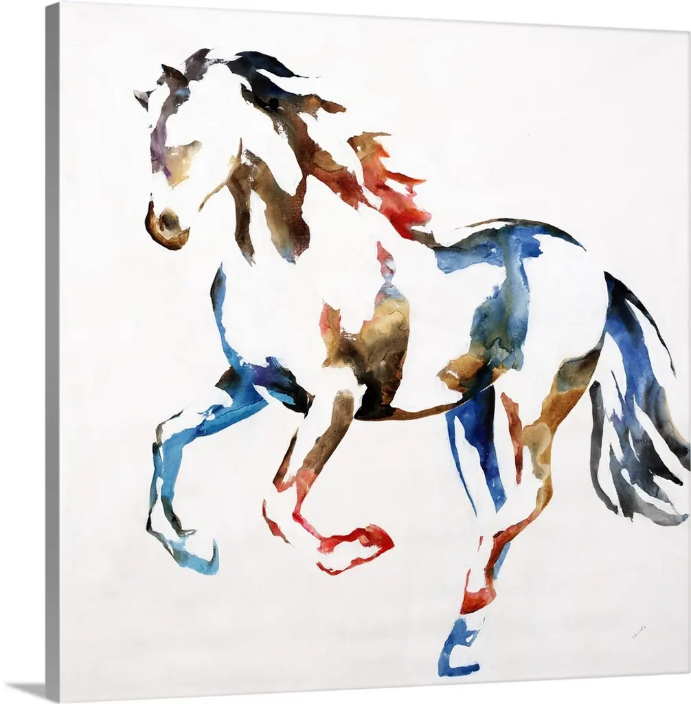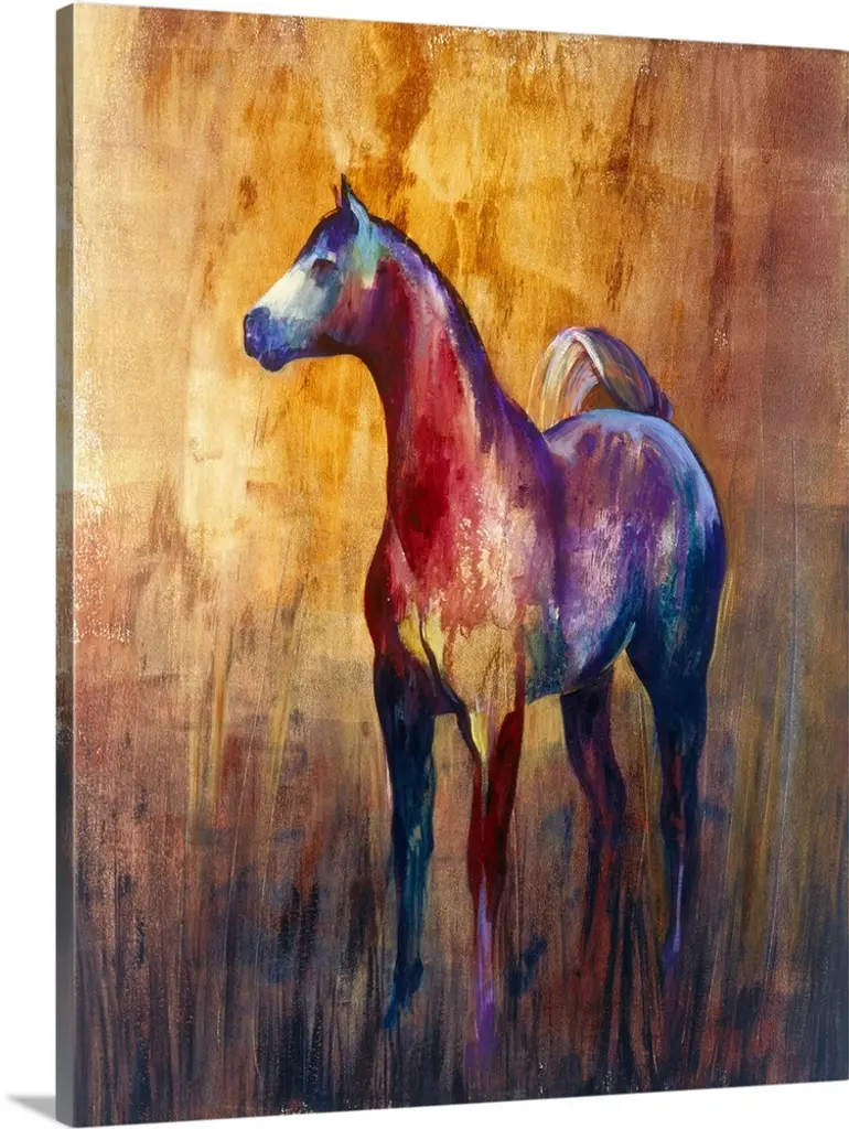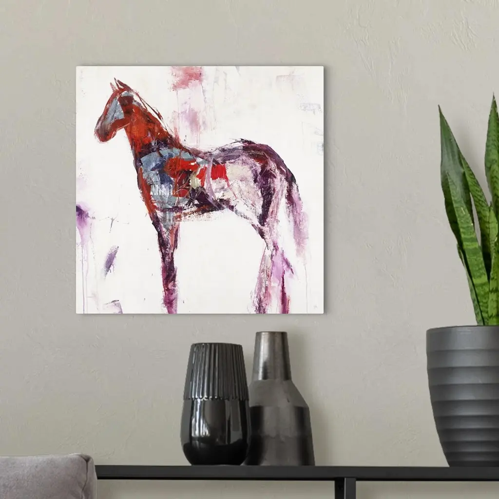 An abstract painting in the form of a horse using bold brush strokes of warm colors of red, magenta and blues.