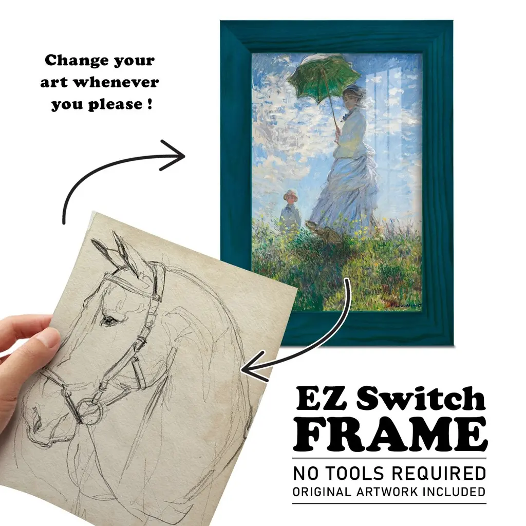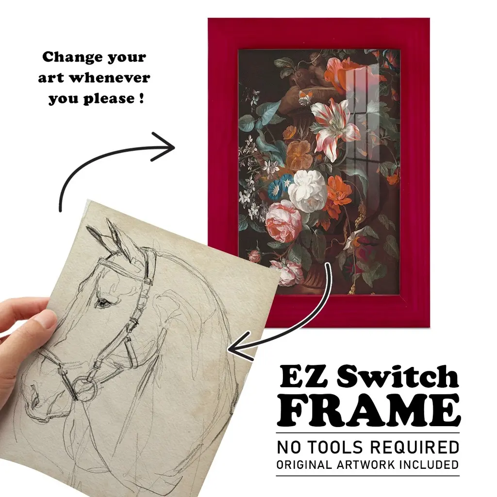 Horse in Bridle Sketch II -EZ SWITCH Framed Print w/glass-Cherry Red A delightful, framed print. Featuring a solid wood frame with real wood glass. This premium print is giclee quality. In addition, every frame features a removable back and table top stand. This allows you to change your art in the future or to just stand the art on a table for a new look. We are sure you'll enjoy our new series of EZ SWITCH Framed Art. Solid Wood Frame Real Glass Removable / Replaceable Art Built in Tabletop Stand Sizes range from 4x6 up to 12x15 - buy just one or pair them up as sets as you see fit.