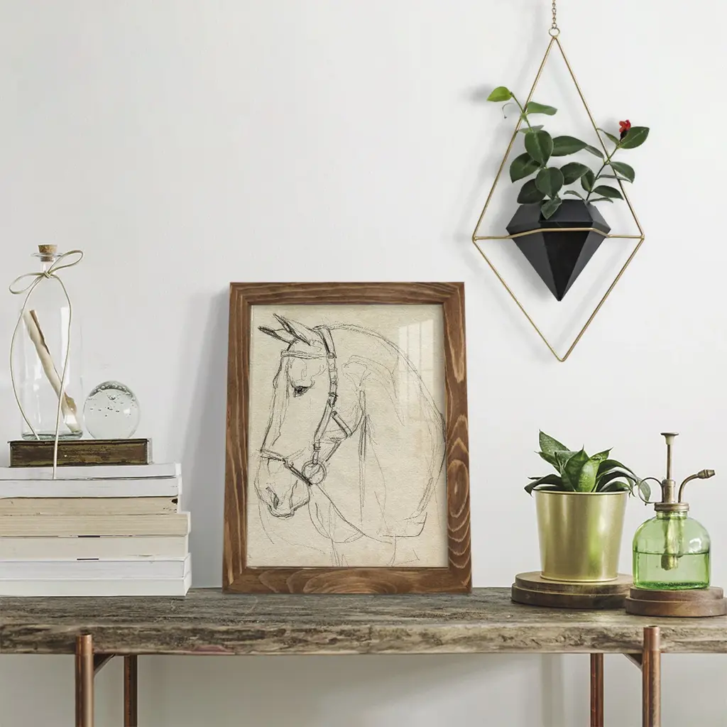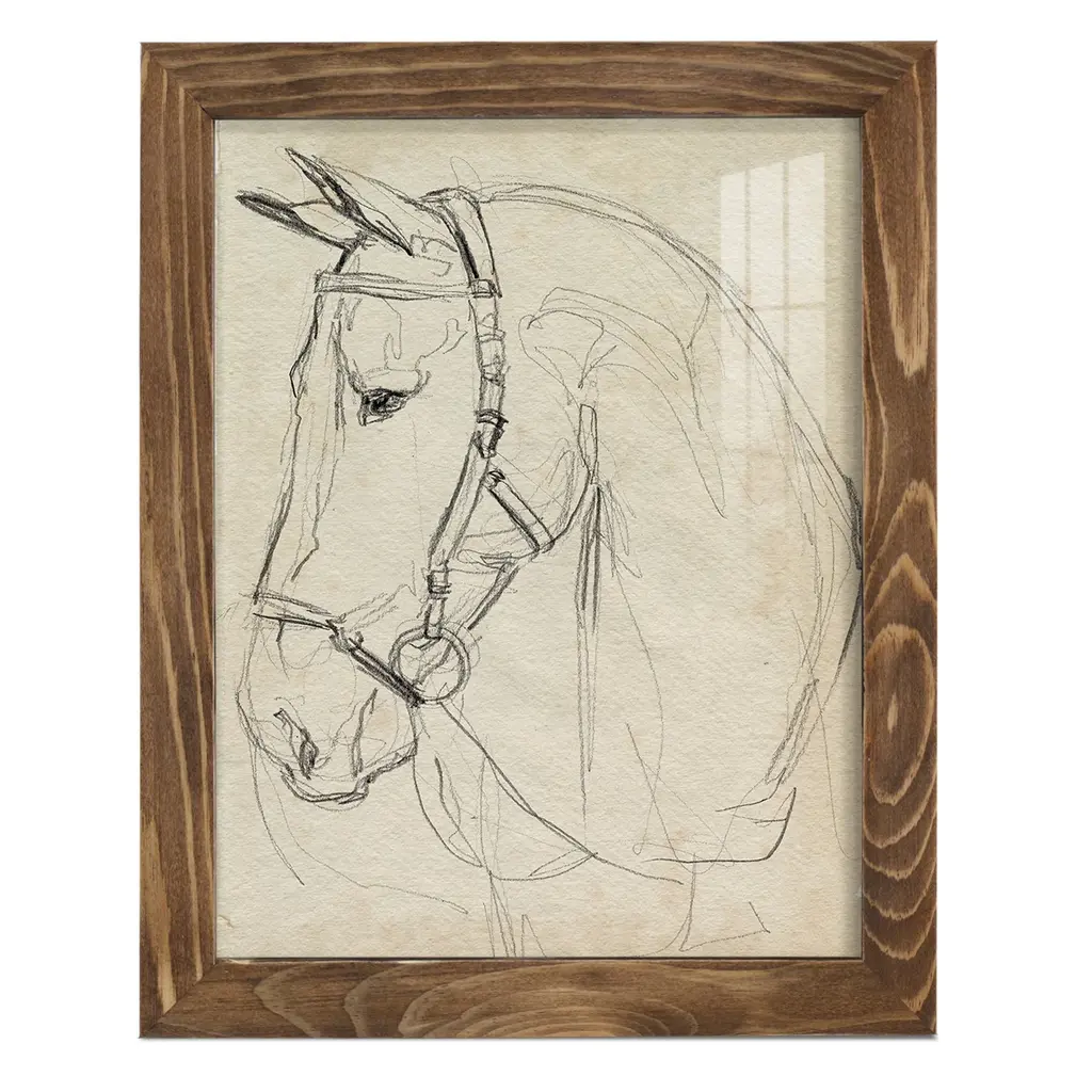 Horse in Bridle Sketch II -EZ SWITCH Framed Print w/glass-Cherry Red A delightful, framed print. Featuring a solid wood frame with real wood glass. This premium print is giclee quality. In addition, every frame features a removable back and table top stand. This allows you to change your art in the future or to just stand the art on a table for a new look. We are sure you'll enjoy our new series of EZ SWITCH Framed Art. Solid Wood Frame Real Glass Removable / Replaceable Art Built in Tabletop Stand Sizes range from 4x6 up to 12x15 - buy just one or pair them up as sets as you see fit.