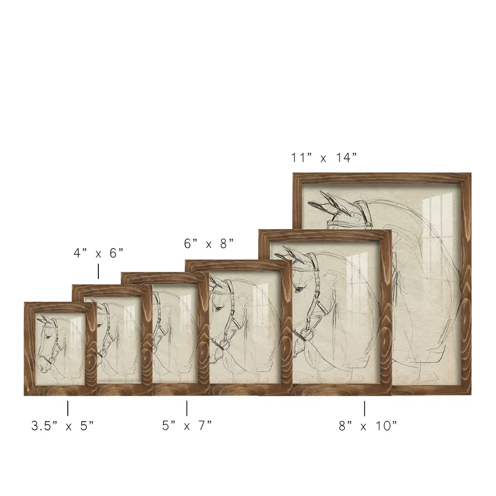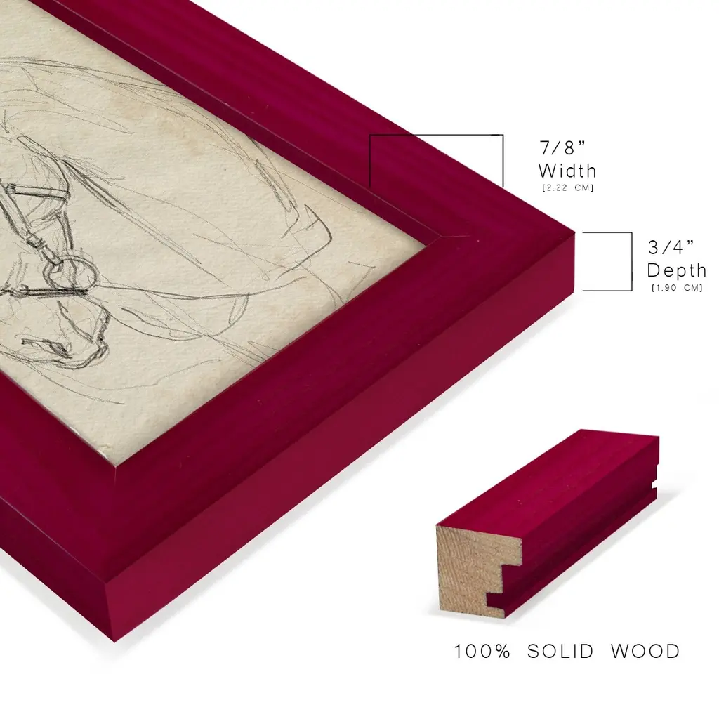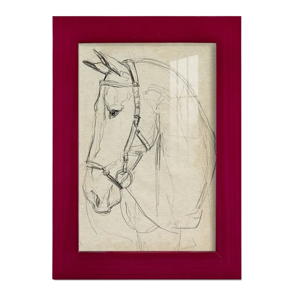 Horse in Bridle Sketch II -EZ SWITCH Framed Print w/glass-Cherry Red A delightful, framed print. Featuring a solid wood frame with real wood glass. This premium print is giclee quality. In addition, every frame features a removable back and table top stand. This allows you to change your art in the future or to just stand the art on a table for a new look. We are sure you'll enjoy our new series of EZ SWITCH Framed Art. Solid Wood Frame Real Glass Removable / Replaceable Art Built in Tabletop Stand Sizes range from 4x6 up to 12x15 - buy just one or pair them up as sets as you see fit.