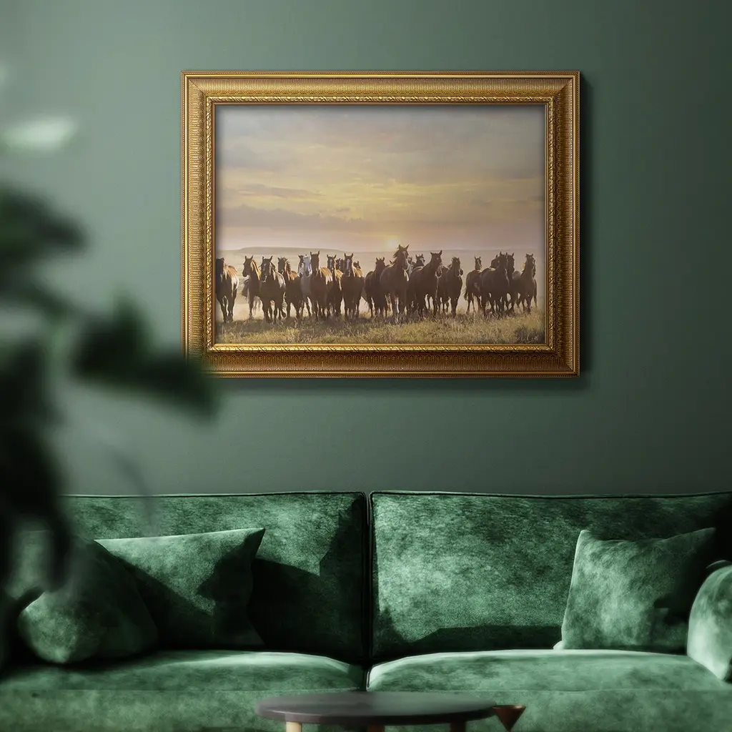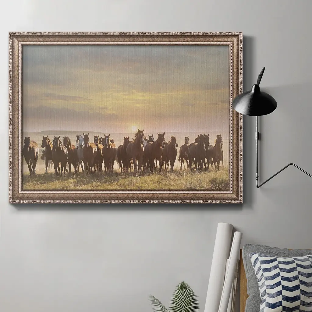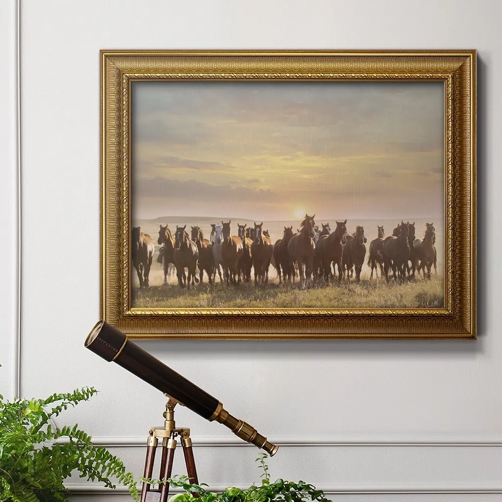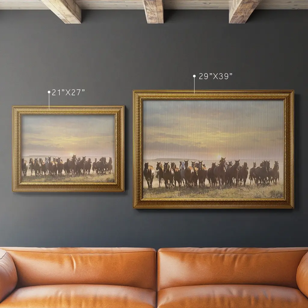 Horse Motion I Premium Framed Canvas- Ready to Hang A Premium Framed Canvas created to last. Framed in distressed wood and available in an array of sizes and colors Featuring a beveled a solid wood stretcher bar, each piece comes ready to hand 3 SIZES AVAILABLE 16''X20'' - Overall Size 18'X27'' - Overall Size 24''x36'' - Overall Size Each piece is made to order. Each piece comes with hanging hardware. Made in the USA Ready to Hang Giclee Paper Print Acrylic Glass Beveled Matt Board