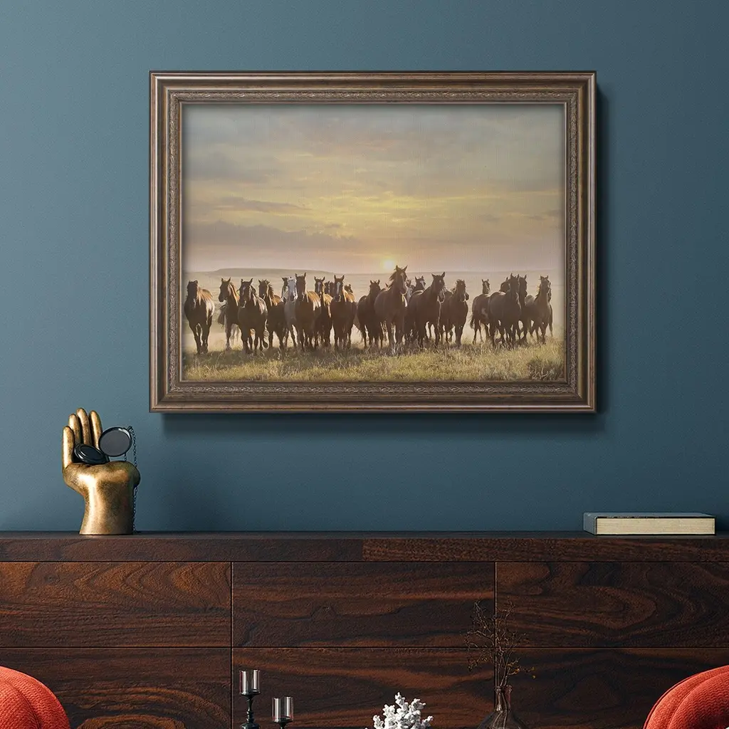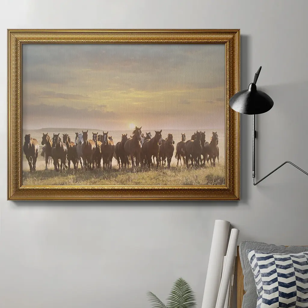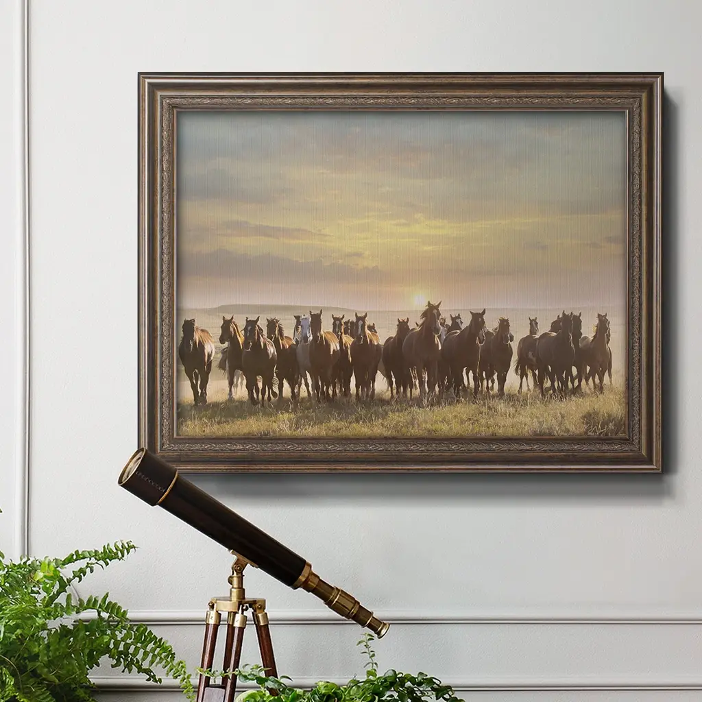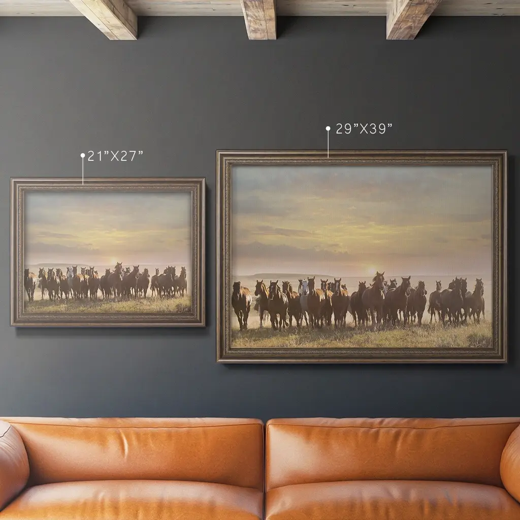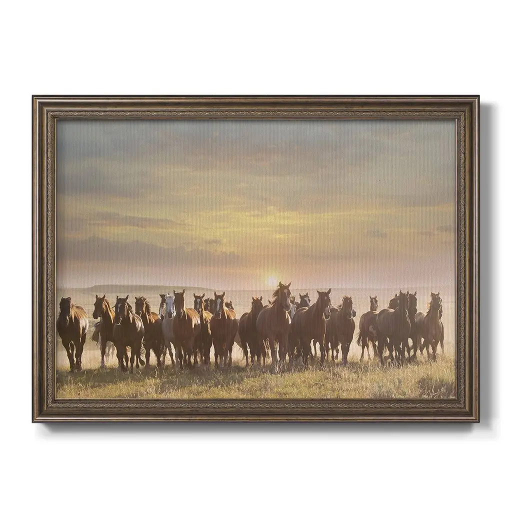 Horse Motion I Premium Framed Canvas- Ready to Hang A Premium Framed Canvas created to last. Framed in distressed wood and available in an array of sizes and colors Featuring a beveled a solid wood stretcher bar, each piece comes ready to hand 3 SIZES AVAILABLE 16''X20'' - Overall Size 18'X27'' - Overall Size 24''x36'' - Overall Size Each piece is made to order. Each piece comes with hanging hardware. Made in the USA Ready to Hang Giclee Paper Print Acrylic Glass Beveled Matt Board