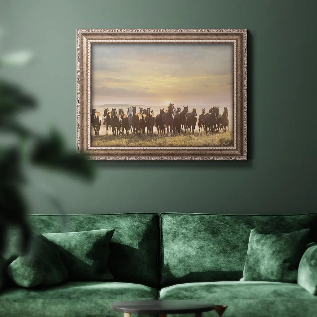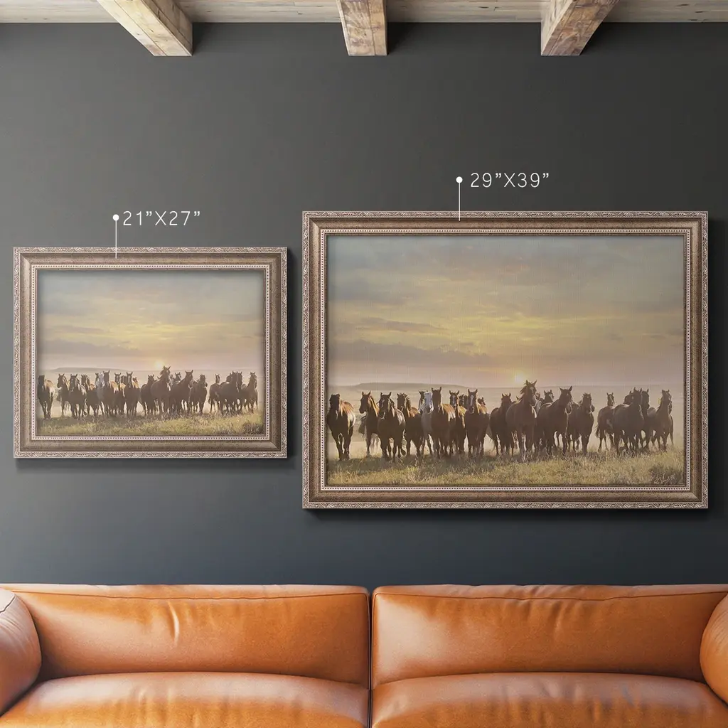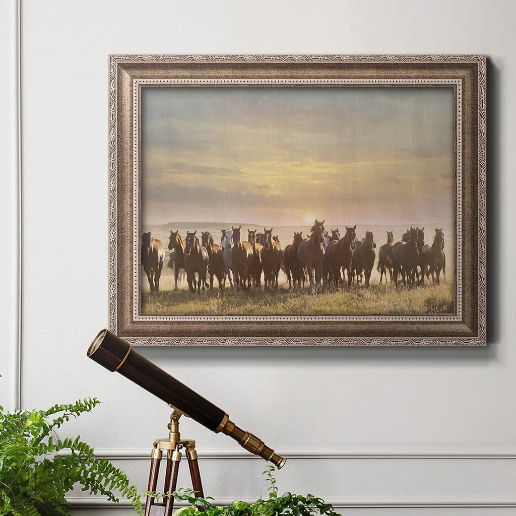 Horse Motion I Premium Framed Canvas- Ready to Hang A Premium Framed Canvas created to last. Framed in distressed wood and available in an array of sizes and colors Featuring a beveled a solid wood stretcher bar, each piece comes ready to hand 3 SIZES AVAILABLE 16''X20'' - Overall Size 18'X27'' - Overall Size 24''x36'' - Overall Size Each piece is made to order. Each piece comes with hanging hardware. Made in the USA Ready to Hang Giclee Paper Print Acrylic Glass Beveled Matt Board