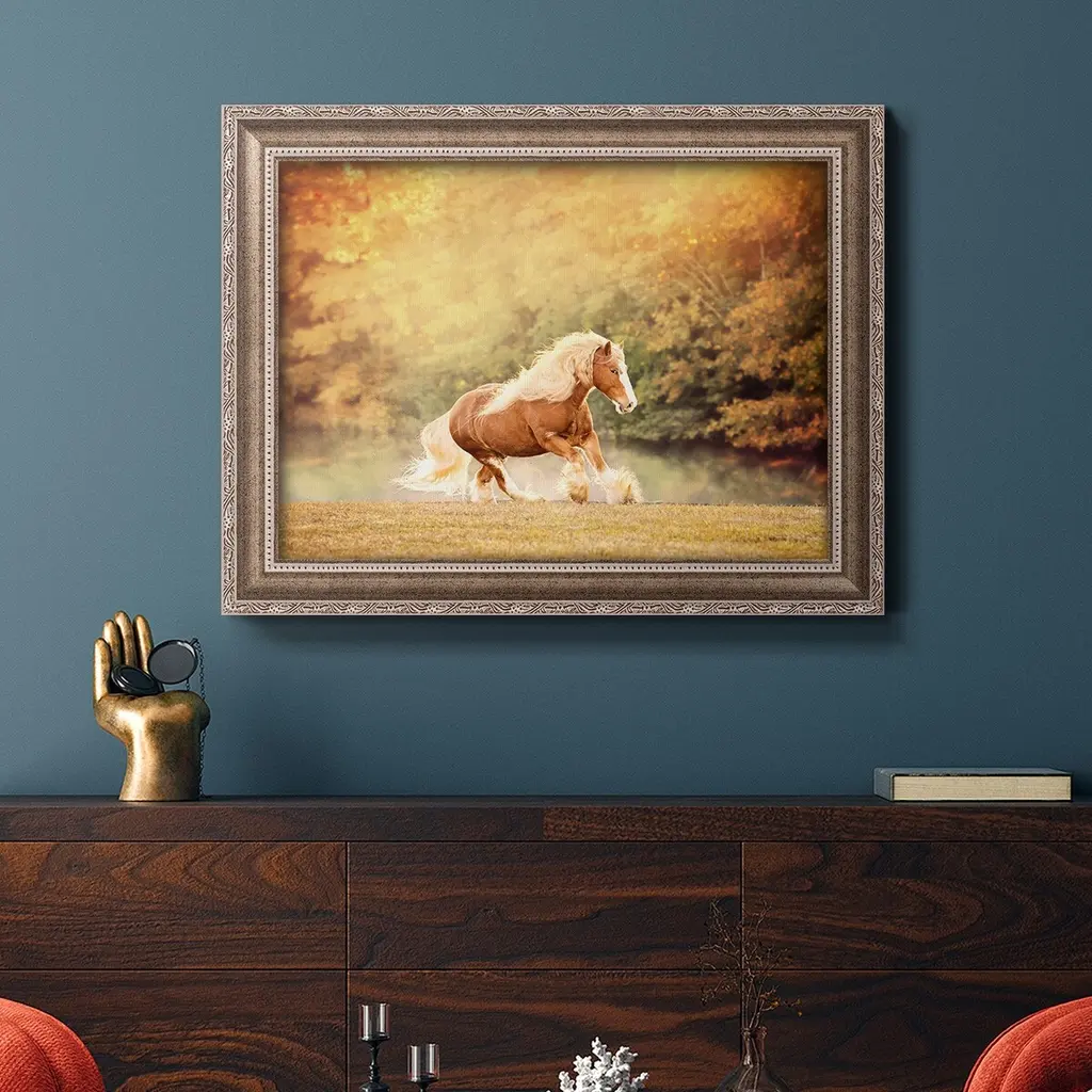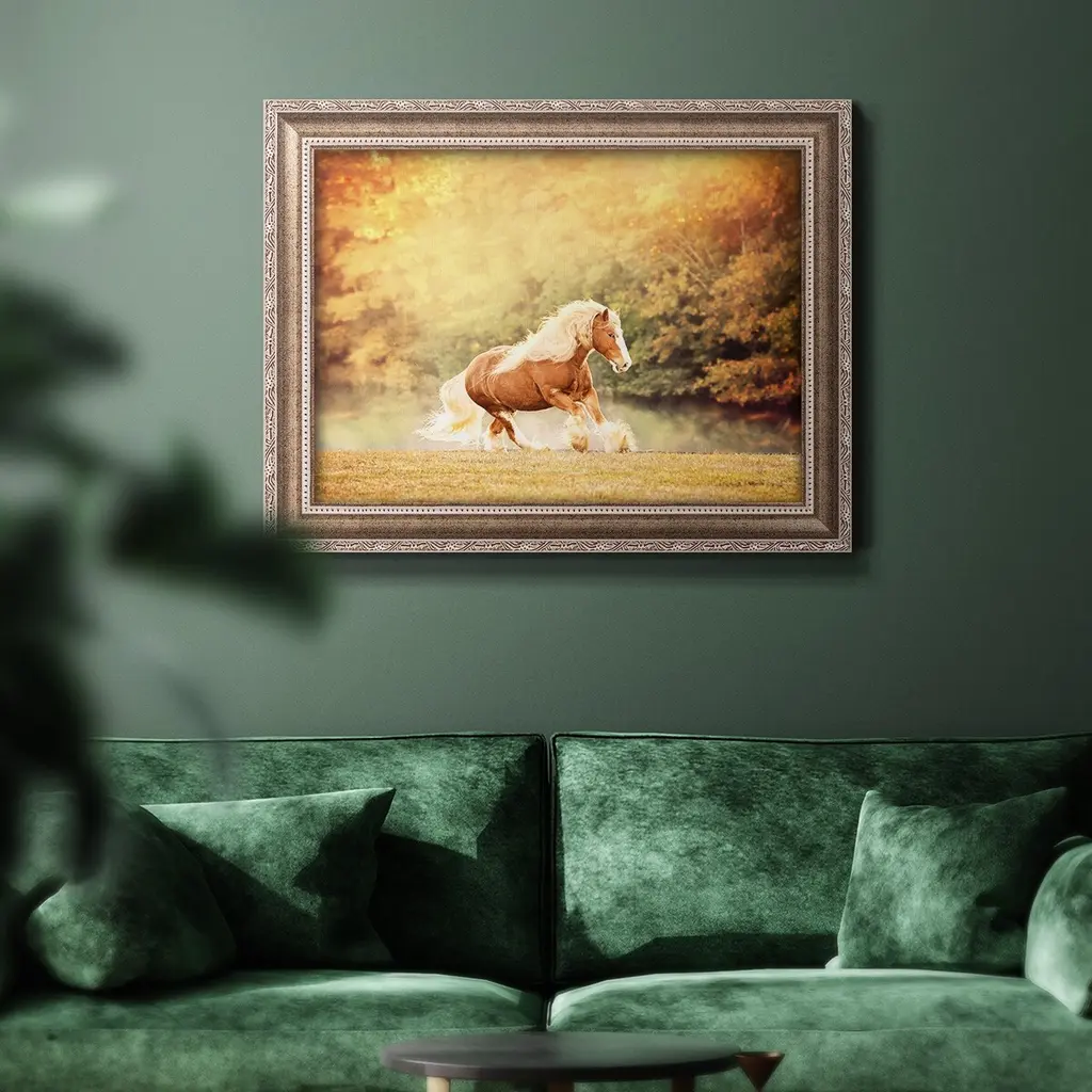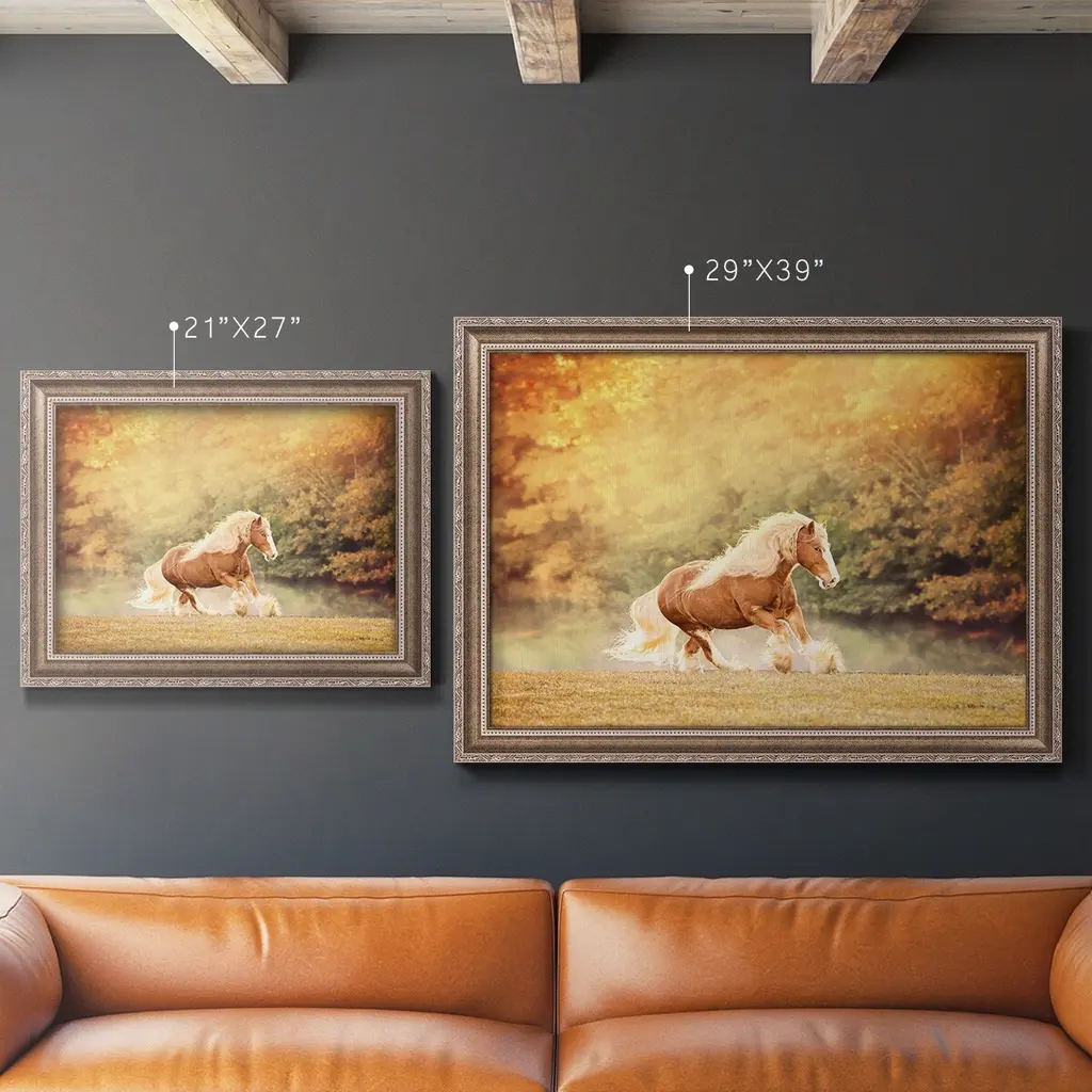 Horse Motion II Premium Framed Canvas- Ready to Hang A Premium Framed Canvas created to last. Framed in distressed wood and available in an array of sizes and colors Featuring a beveled a solid wood stretcher bar, each piece comes ready to hand 3 SIZES AVAILABLE 16''X20'' - Overall Size 18'X27'' - Overall Size 24''x36'' - Overall Size Each piece is made to order. Each piece comes with hanging hardware. Made in the USA Ready to Hang Giclee Paper Print Acrylic Glass Beveled Matt Board
