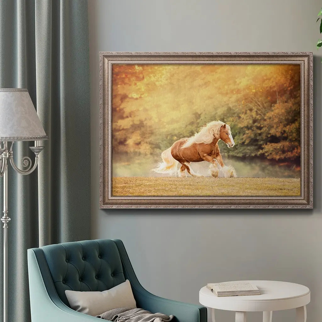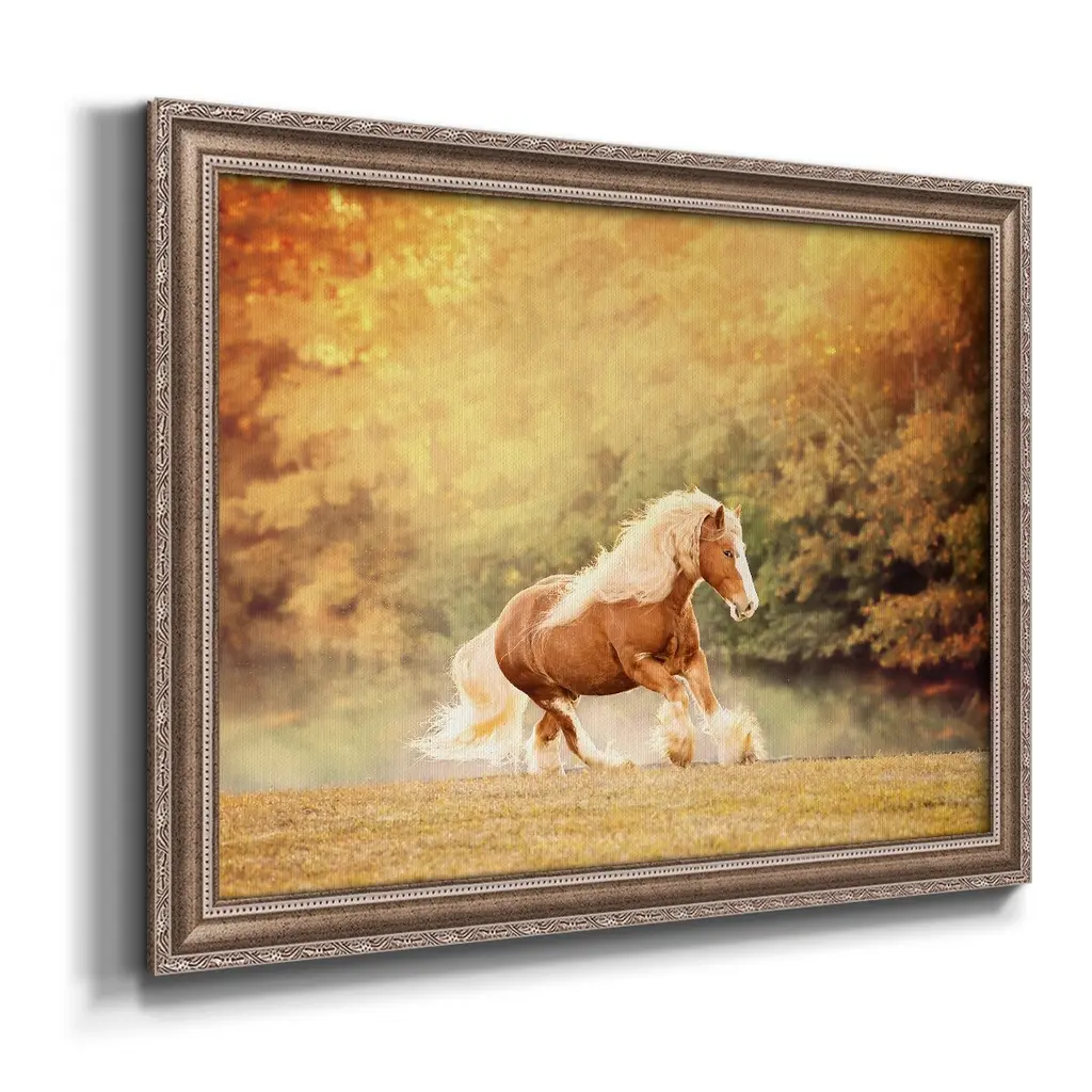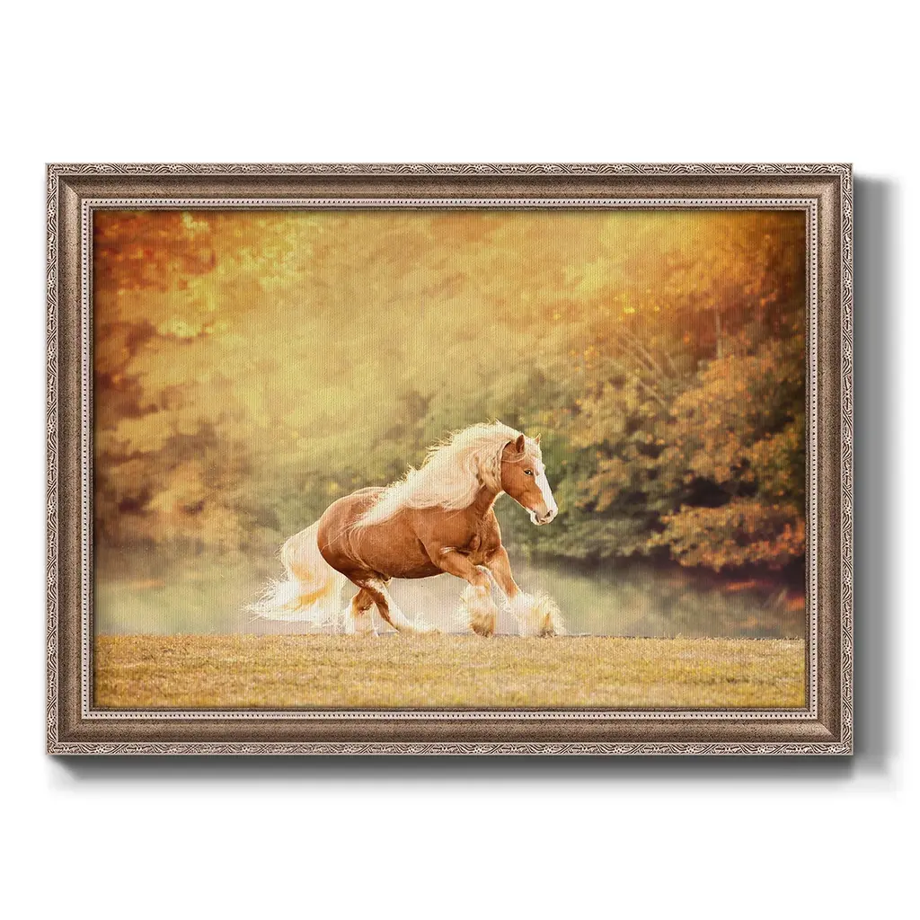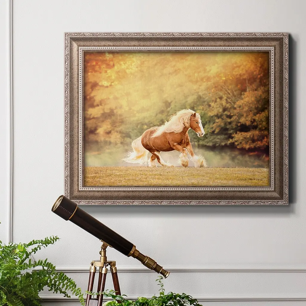 Horse Motion II Premium Framed Canvas- Ready to Hang A Premium Framed Canvas created to last. Framed in distressed wood and available in an array of sizes and colors Featuring a beveled a solid wood stretcher bar, each piece comes ready to hand 3 SIZES AVAILABLE 16''X20'' - Overall Size 18'X27'' - Overall Size 24''x36'' - Overall Size Each piece is made to order. Each piece comes with hanging hardware. Made in the USA Ready to Hang Giclee Paper Print Acrylic Glass Beveled Matt Board