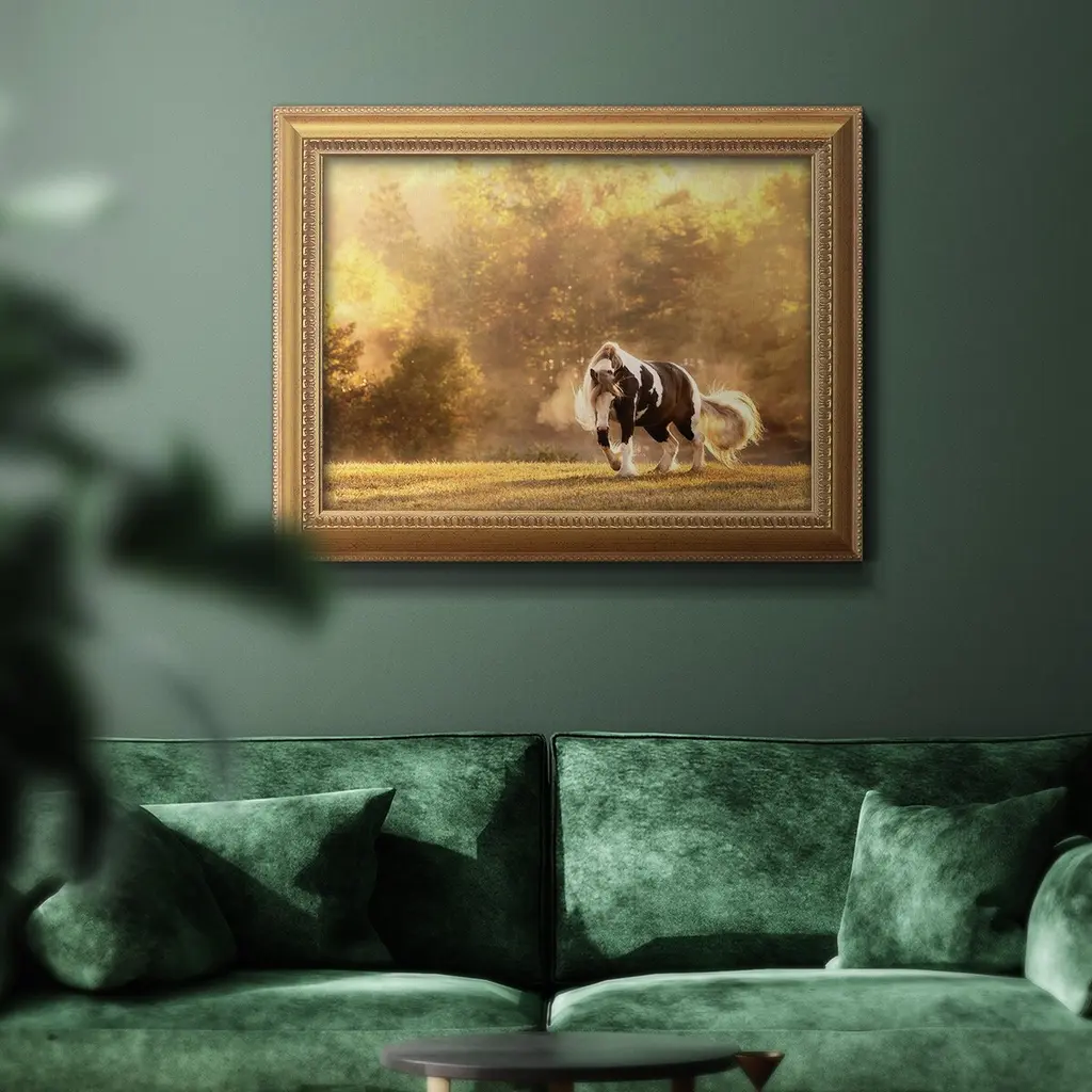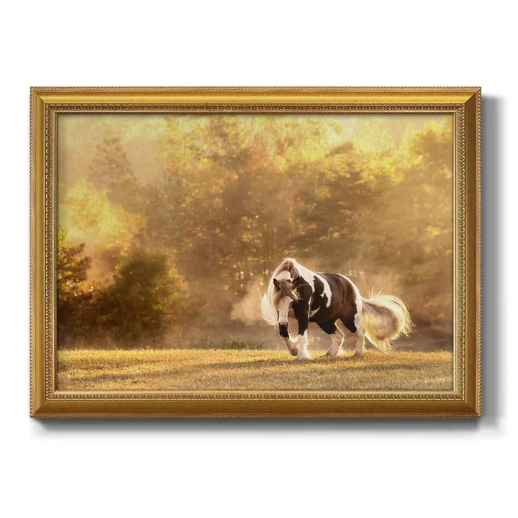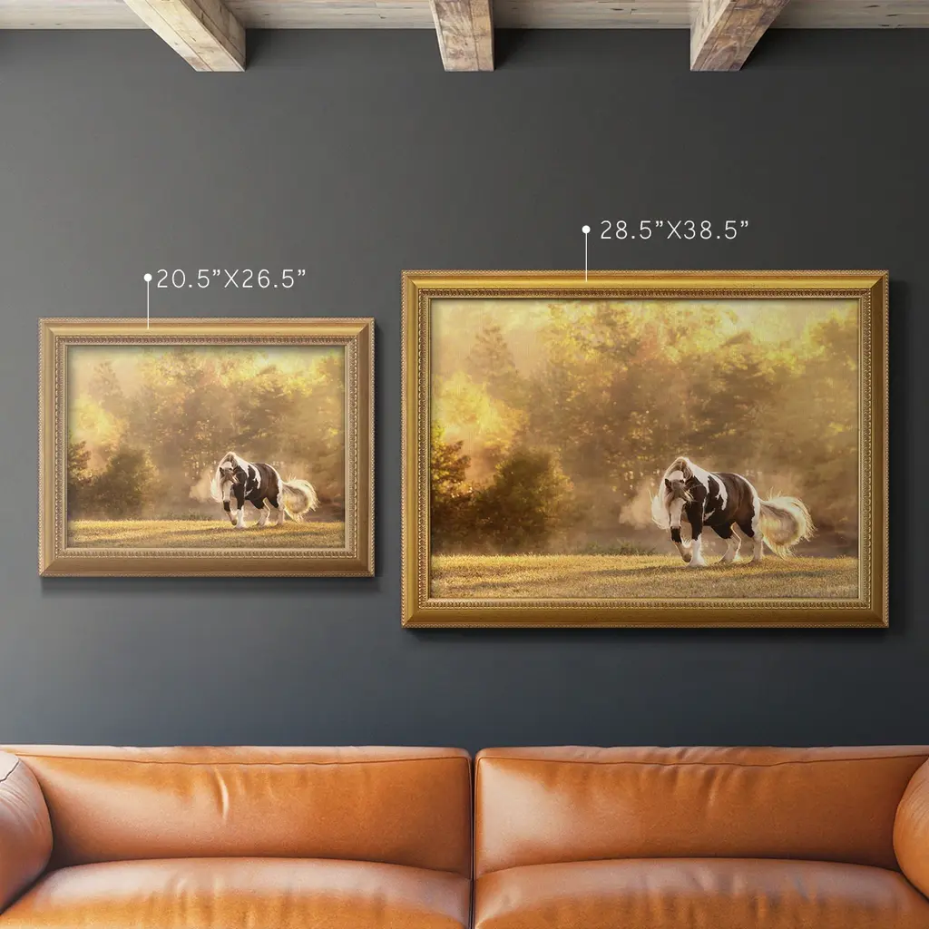 Horse Motion III Premium Framed Canvas- Ready to Hang A Premium Framed Canvas created to last. Framed in distressed wood and available in an array of sizes and colors Featuring a beveled a solid wood stretcher bar, each piece comes ready to hand 3 SIZES AVAILABLE 16''X20'' - Overall Size 18'X27'' - Overall Size 24''x36'' - Overall Size Each piece is made to order. Each piece comes with hanging hardware. Made in the USA Ready to Hang Giclee Paper Print Acrylic Glass Beveled Matt Board