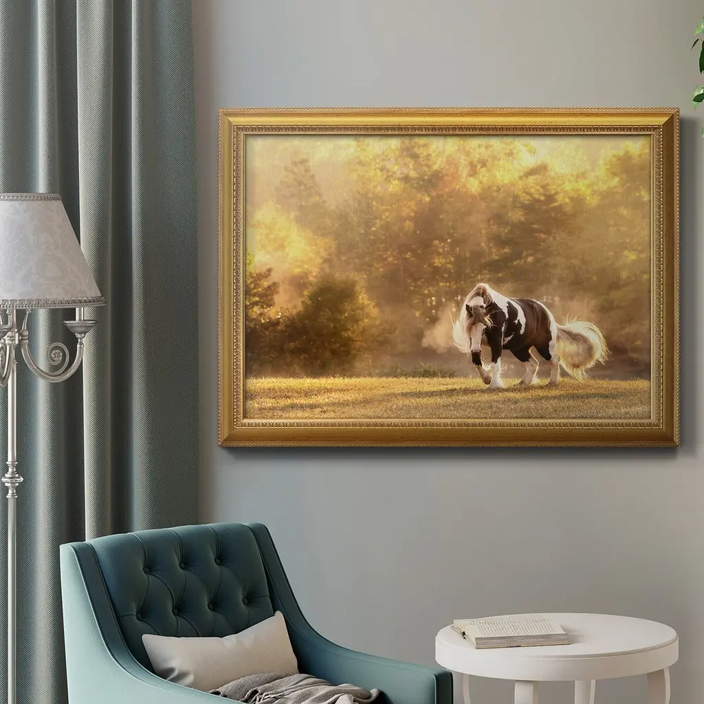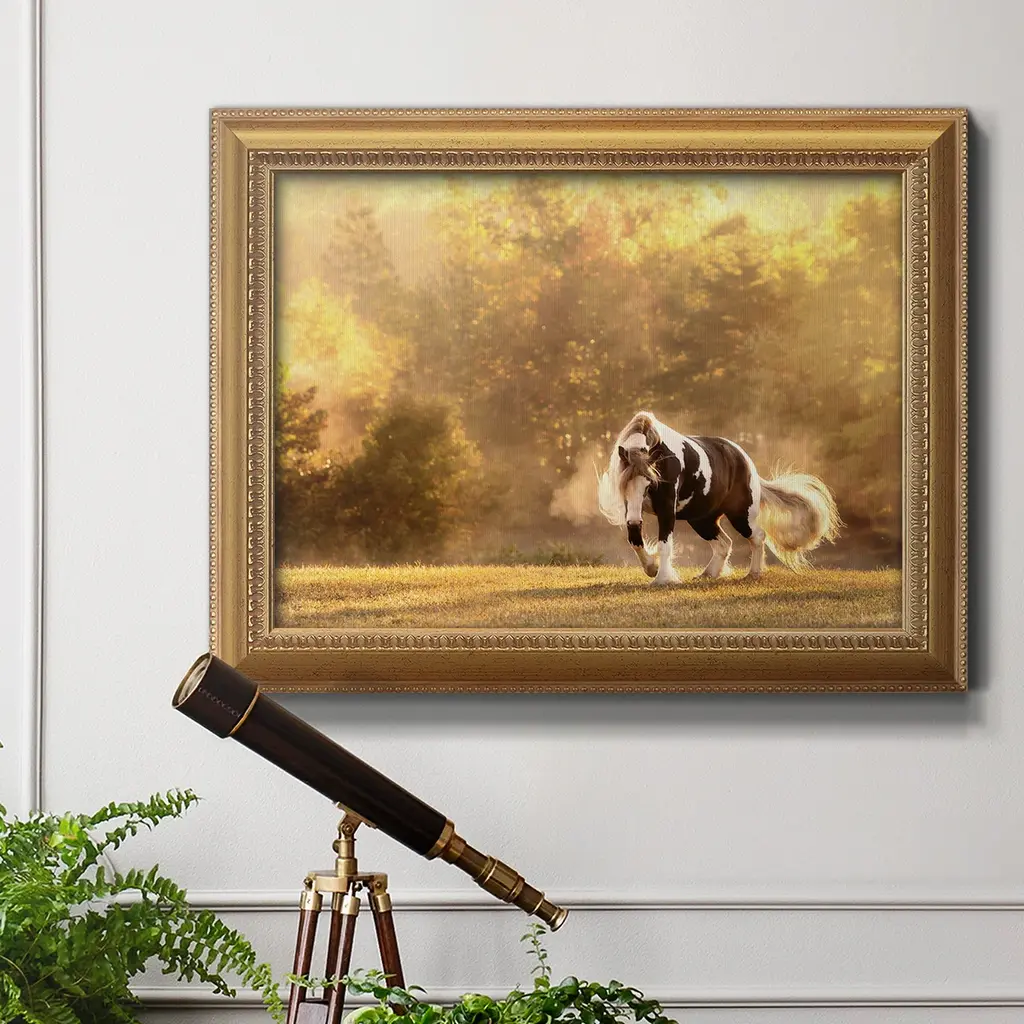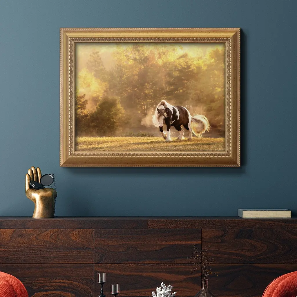 Horse Motion III Premium Framed Canvas- Ready to Hang A Premium Framed Canvas created to last. Framed in distressed wood and available in an array of sizes and colors Featuring a beveled a solid wood stretcher bar, each piece comes ready to hand 3 SIZES AVAILABLE 16''X20'' - Overall Size 18'X27'' - Overall Size 24''x36'' - Overall Size Each piece is made to order. Each piece comes with hanging hardware. Made in the USA Ready to Hang Giclee Paper Print Acrylic Glass Beveled Matt Board