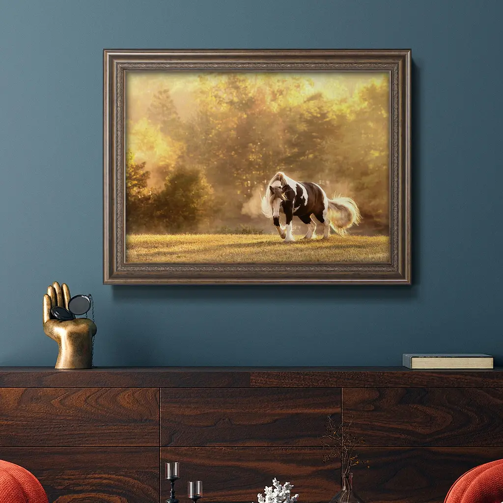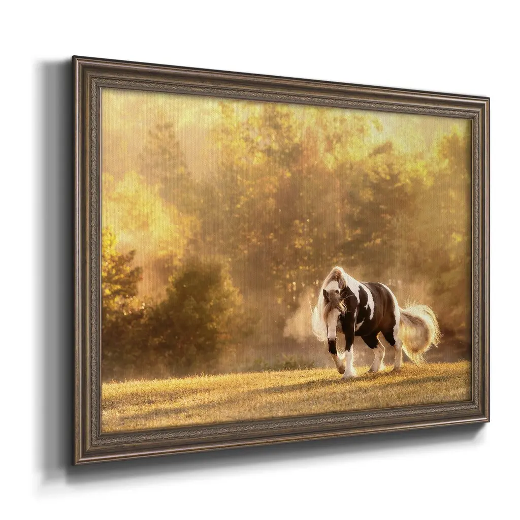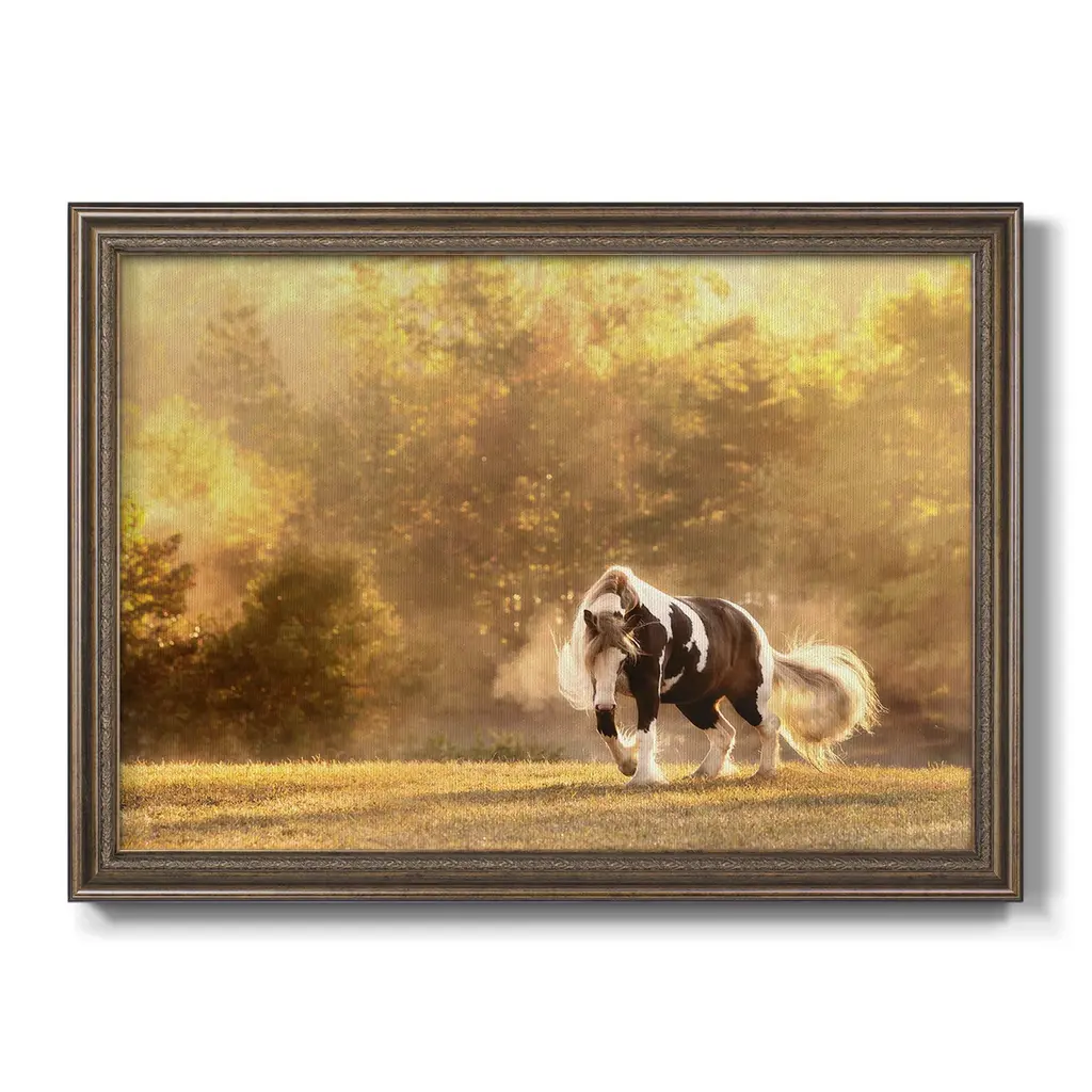 Horse Motion III Premium Framed Canvas- Ready to Hang A Premium Framed Canvas created to last. Framed in distressed wood and available in an array of sizes and colors Featuring a beveled a solid wood stretcher bar, each piece comes ready to hand 3 SIZES AVAILABLE 16''X20'' - Overall Size 18'X27'' - Overall Size 24''x36'' - Overall Size Each piece is made to order. Each piece comes with hanging hardware. Made in the USA Ready to Hang Giclee Paper Print Acrylic Glass Beveled Matt Board