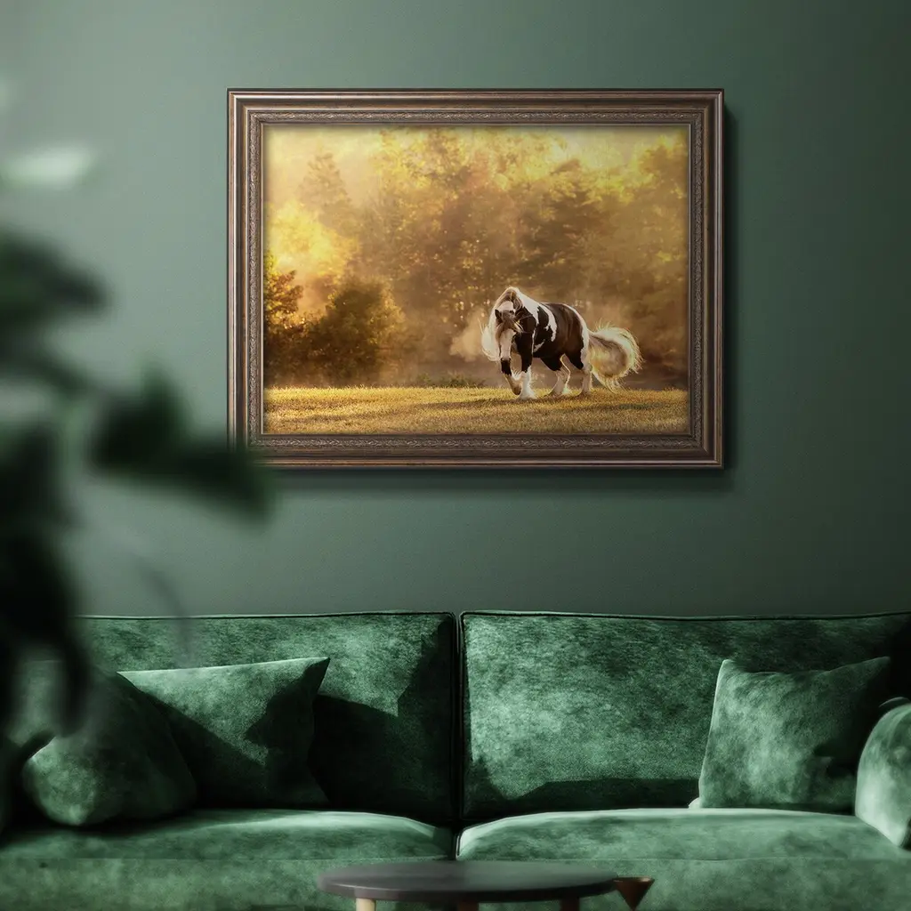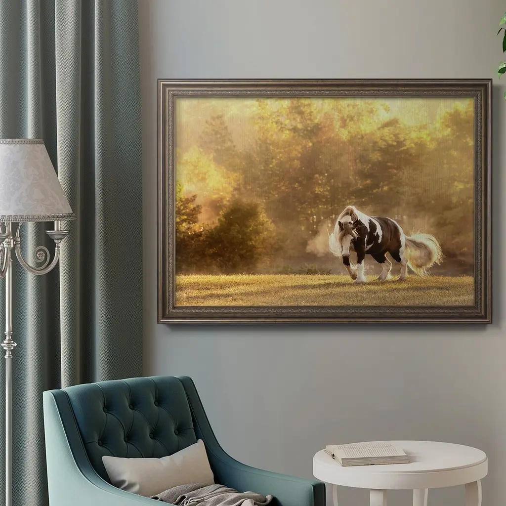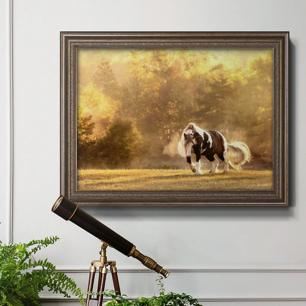 Horse Motion III Premium Framed Canvas- Ready to Hang A Premium Framed Canvas created to last. Framed in distressed wood and available in an array of sizes and colors Featuring a beveled a solid wood stretcher bar, each piece comes ready to hand 3 SIZES AVAILABLE 16''X20'' - Overall Size 18'X27'' - Overall Size 24''x36'' - Overall Size Each piece is made to order. Each piece comes with hanging hardware. Made in the USA Ready to Hang Giclee Paper Print Acrylic Glass Beveled Matt Board