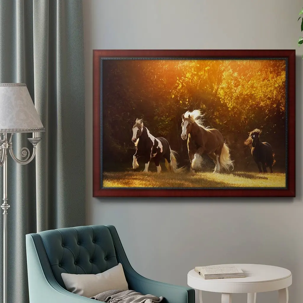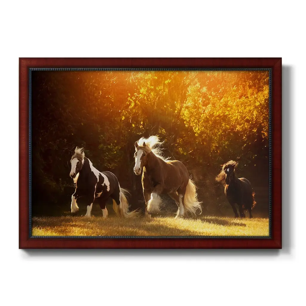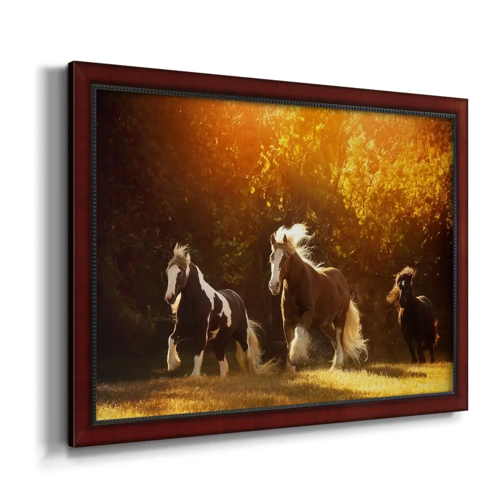 Horse Motion V Premium Framed Canvas- Ready to Hang A Premium Framed Canvas created to last. Framed in distressed wood and available in an array of sizes and colors Featuring a beveled a solid wood stretcher bar, each piece comes ready to hand 3 SIZES AVAILABLE 16''X20'' - Overall Size 18'X27'' - Overall Size 24''x36'' - Overall Size Each piece is made to order. Each piece comes with hanging hardware. Made in the USA Ready to Hang Giclee Paper Print Acrylic Glass Beveled Matt Board