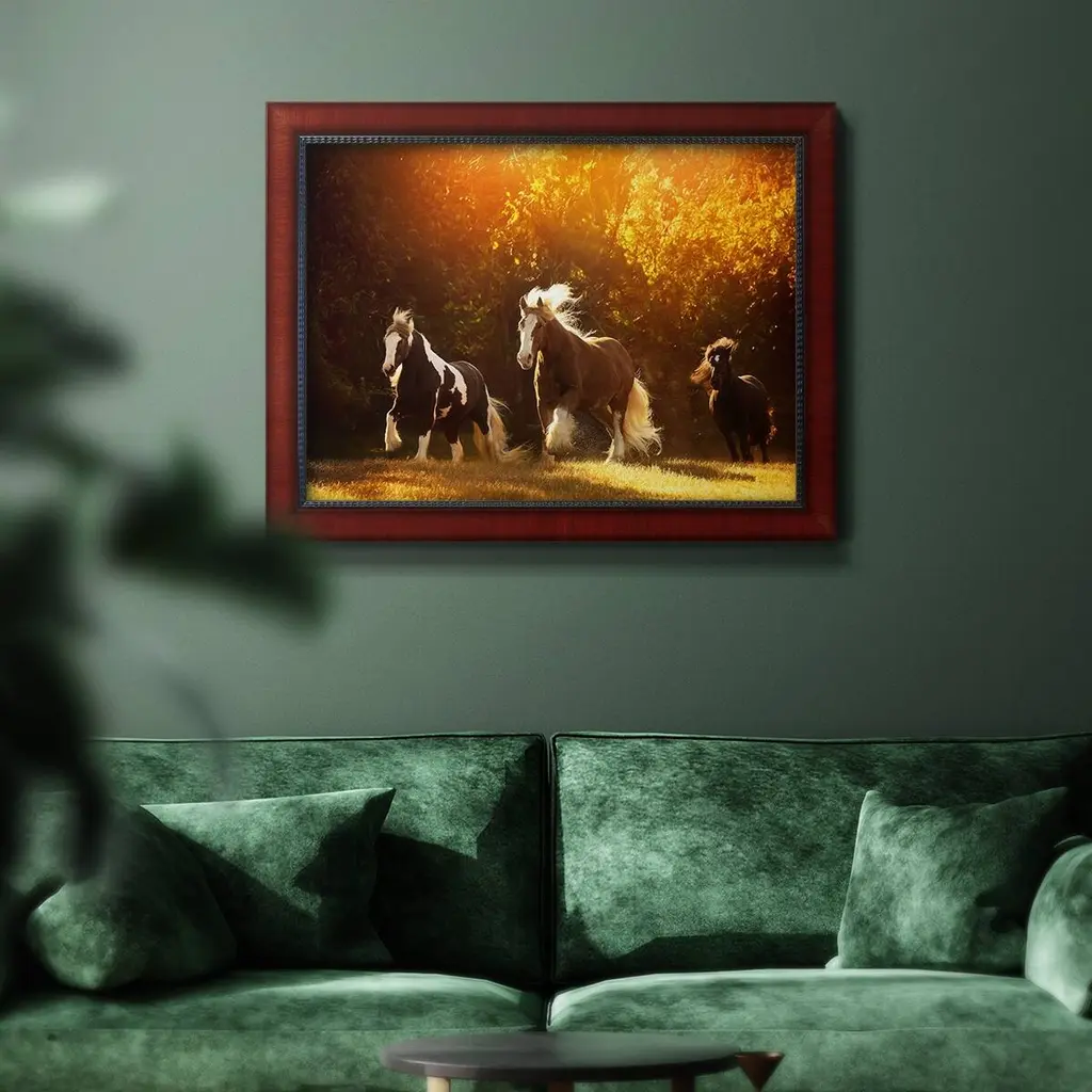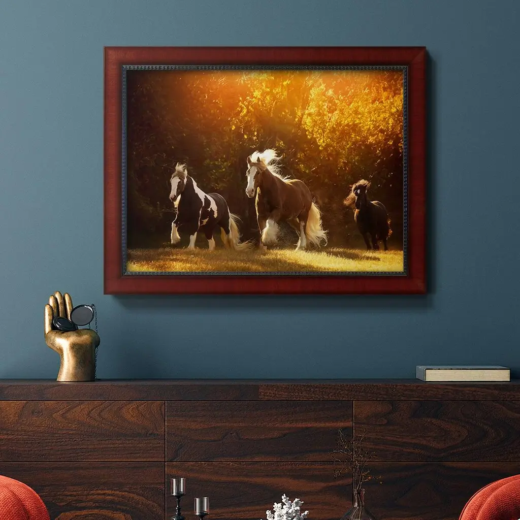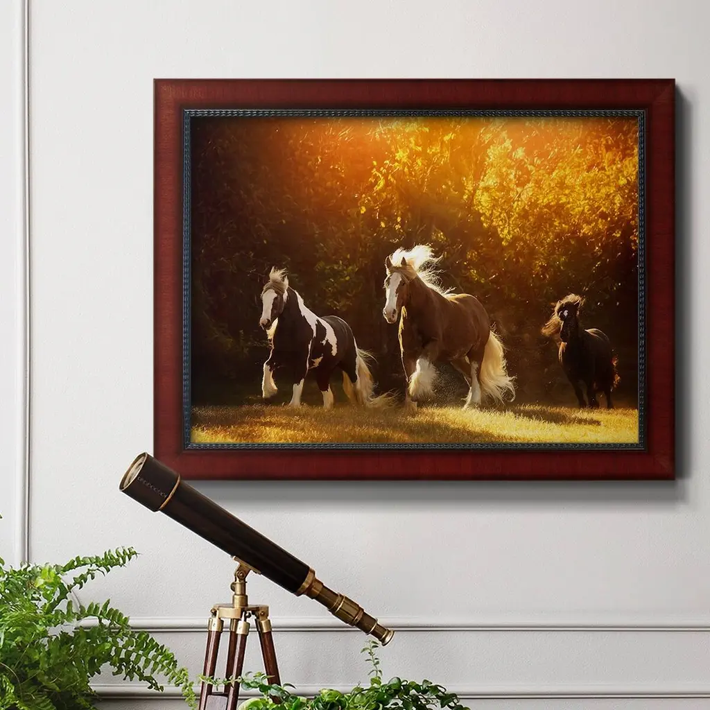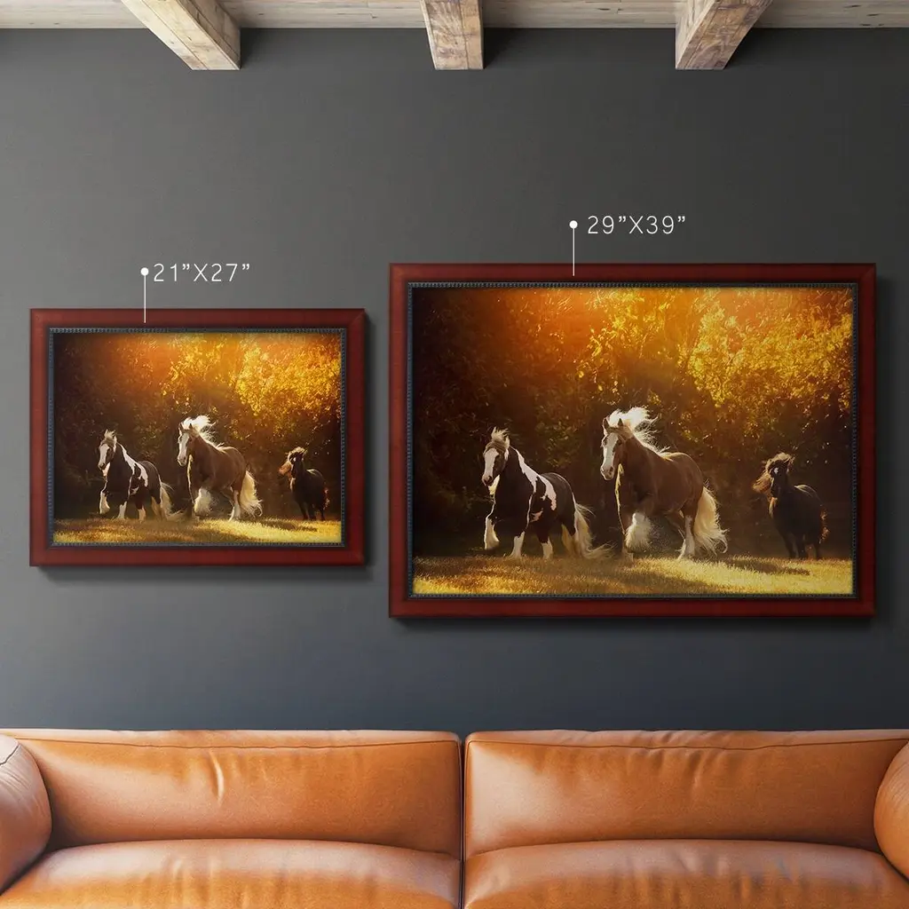 Horse Motion V Premium Framed Canvas- Ready to Hang A Premium Framed Canvas created to last. Framed in distressed wood and available in an array of sizes and colors Featuring a beveled a solid wood stretcher bar, each piece comes ready to hand 3 SIZES AVAILABLE 16''X20'' - Overall Size 18'X27'' - Overall Size 24''x36'' - Overall Size Each piece is made to order. Each piece comes with hanging hardware. Made in the USA Ready to Hang Giclee Paper Print Acrylic Glass Beveled Matt Board