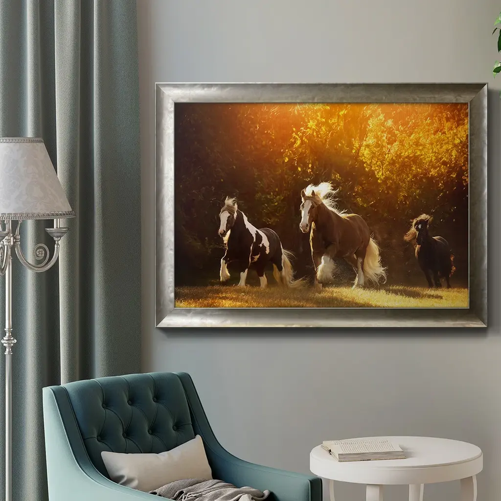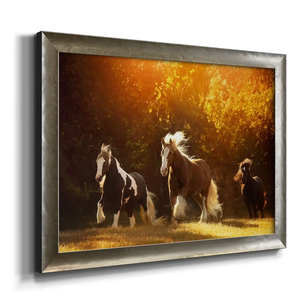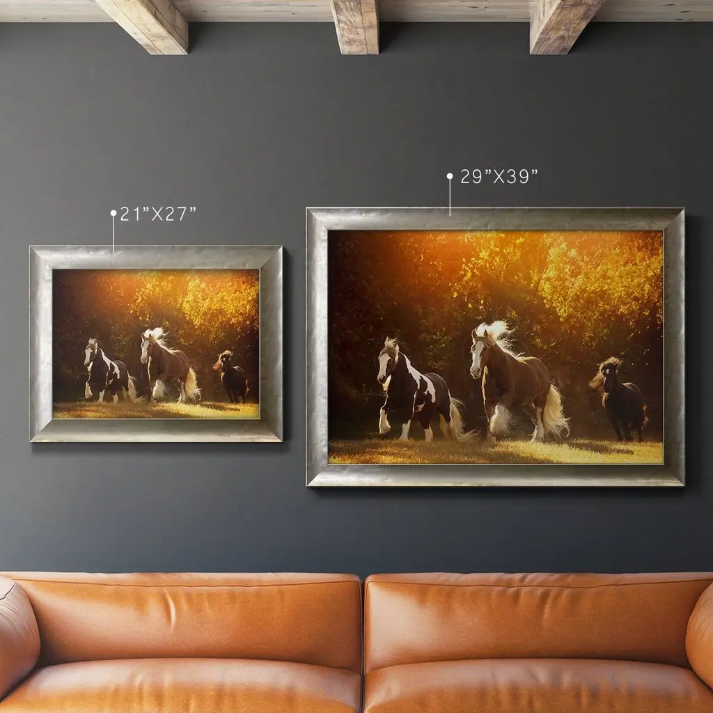 Horse Motion V Premium Framed Canvas- Ready to Hang A Premium Framed Canvas created to last. Framed in distressed wood and available in an array of sizes and colors Featuring a beveled a solid wood stretcher bar, each piece comes ready to hand 3 SIZES AVAILABLE 16''X20'' - Overall Size 18'X27'' - Overall Size 24''x36'' - Overall Size Each piece is made to order. Each piece comes with hanging hardware. Made in the USA Ready to Hang Giclee Paper Print Acrylic Glass Beveled Matt Board