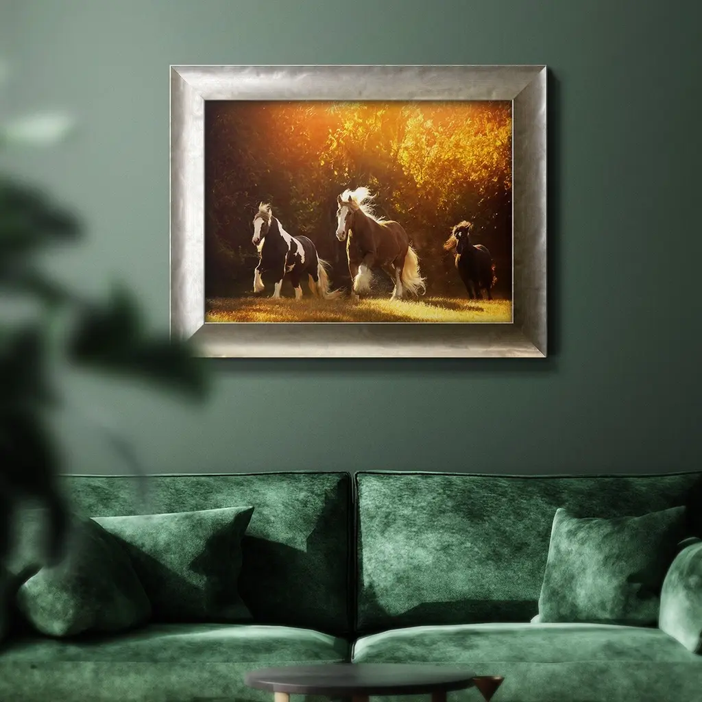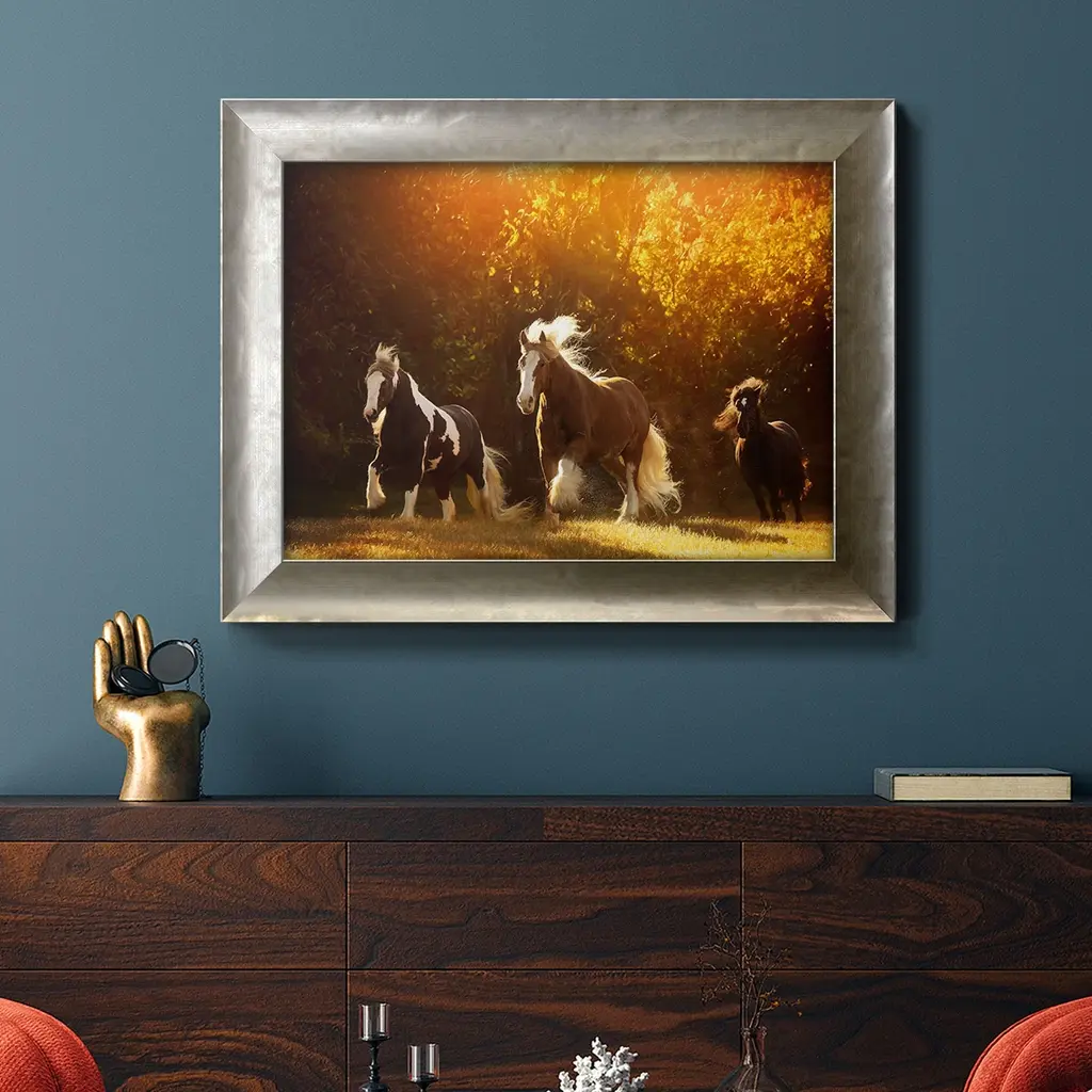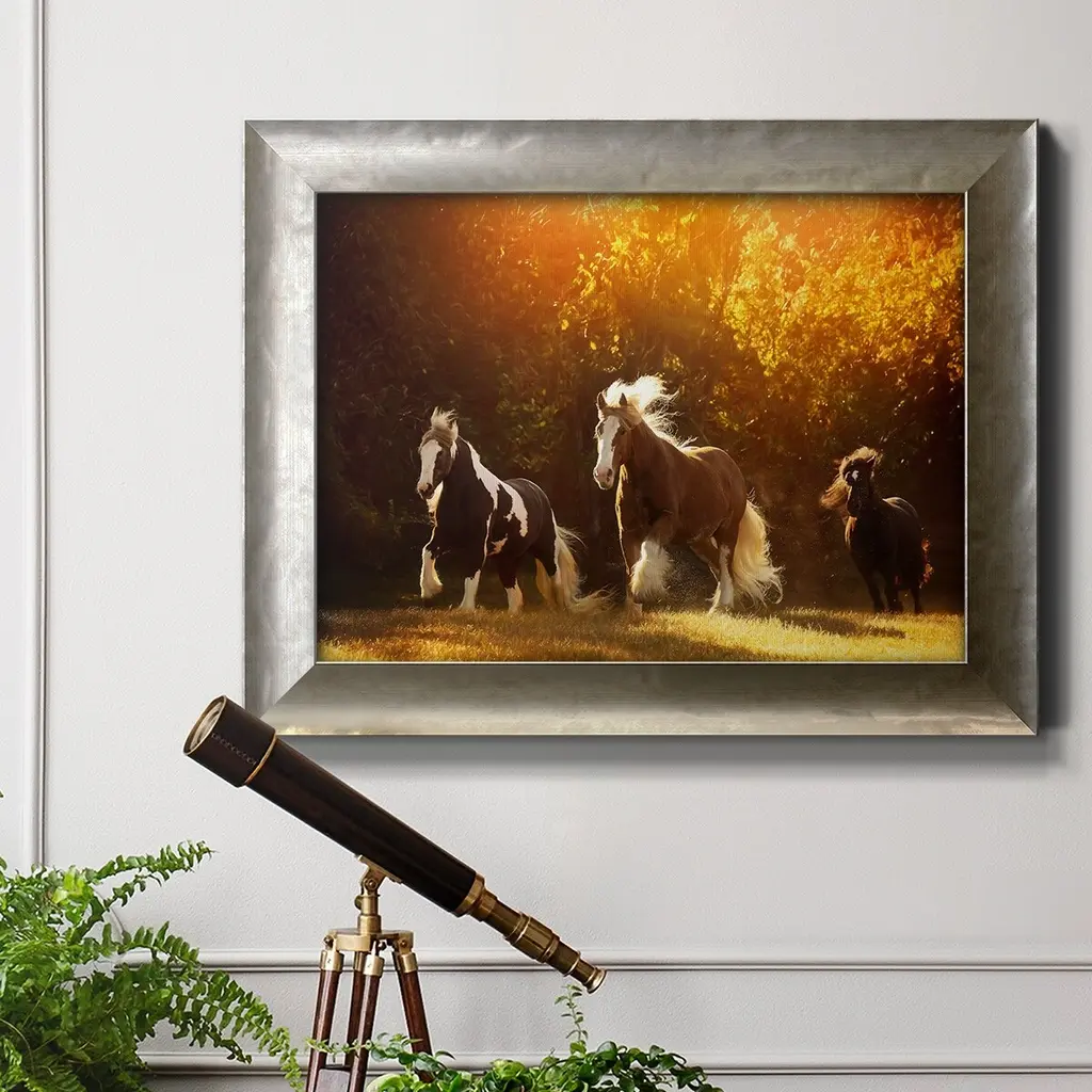 Horse Motion V Premium Framed Canvas- Ready to Hang A Premium Framed Canvas created to last. Framed in distressed wood and available in an array of sizes and colors Featuring a beveled a solid wood stretcher bar, each piece comes ready to hand 3 SIZES AVAILABLE 16''X20'' - Overall Size 18'X27'' - Overall Size 24''x36'' - Overall Size Each piece is made to order. Each piece comes with hanging hardware. Made in the USA Ready to Hang Giclee Paper Print Acrylic Glass Beveled Matt Board