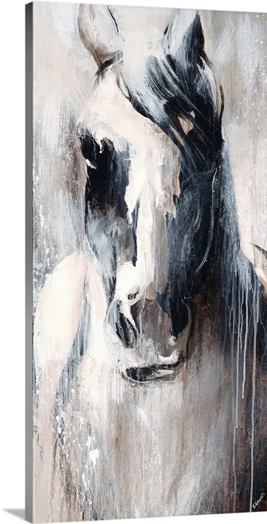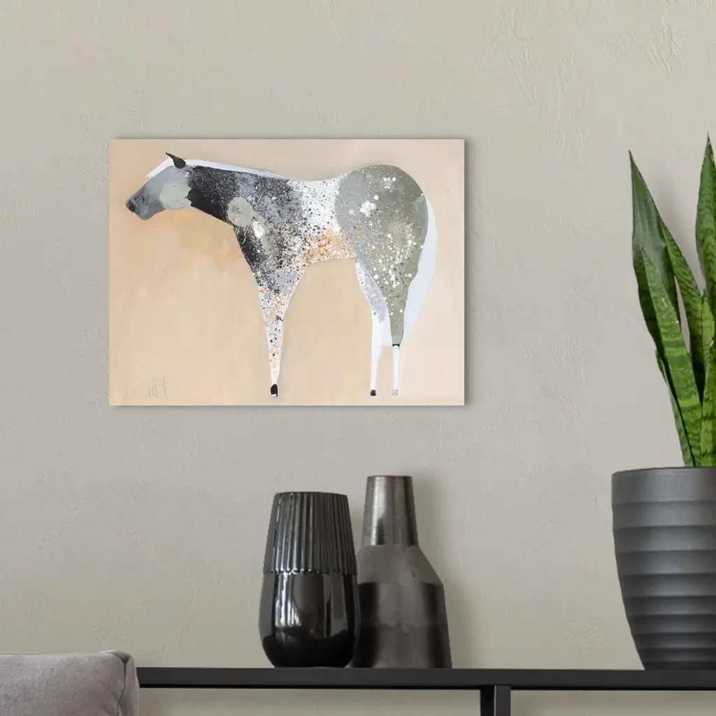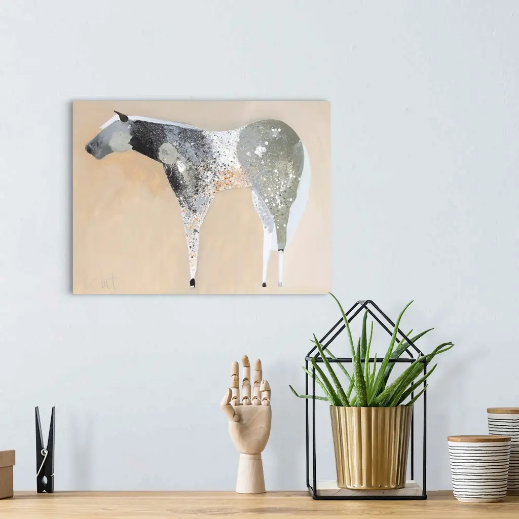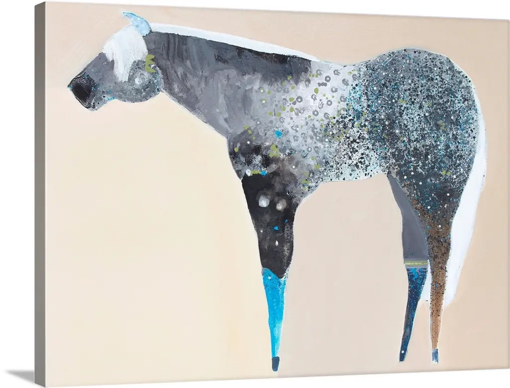 A contemporary painting of a gray horse against a neutral background.