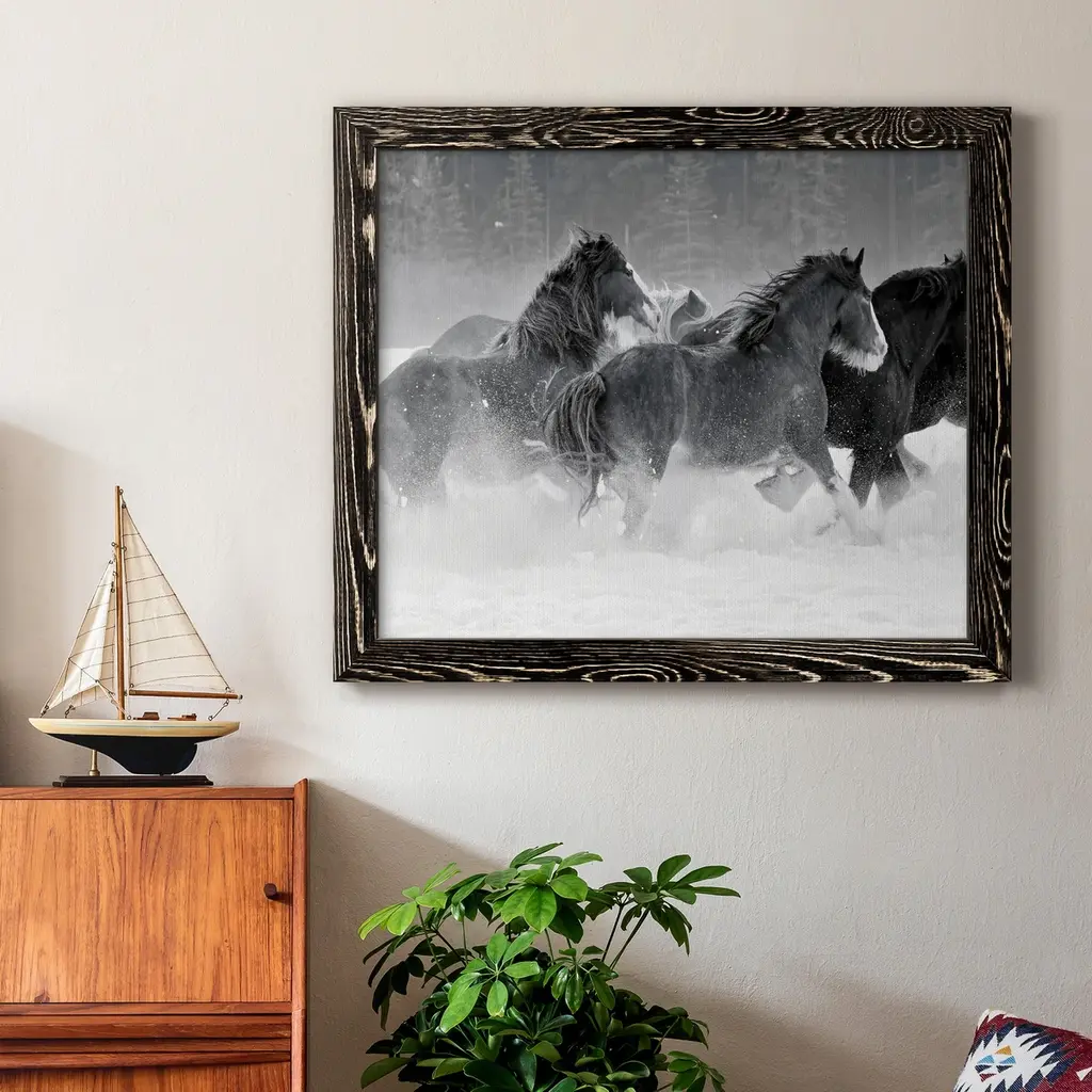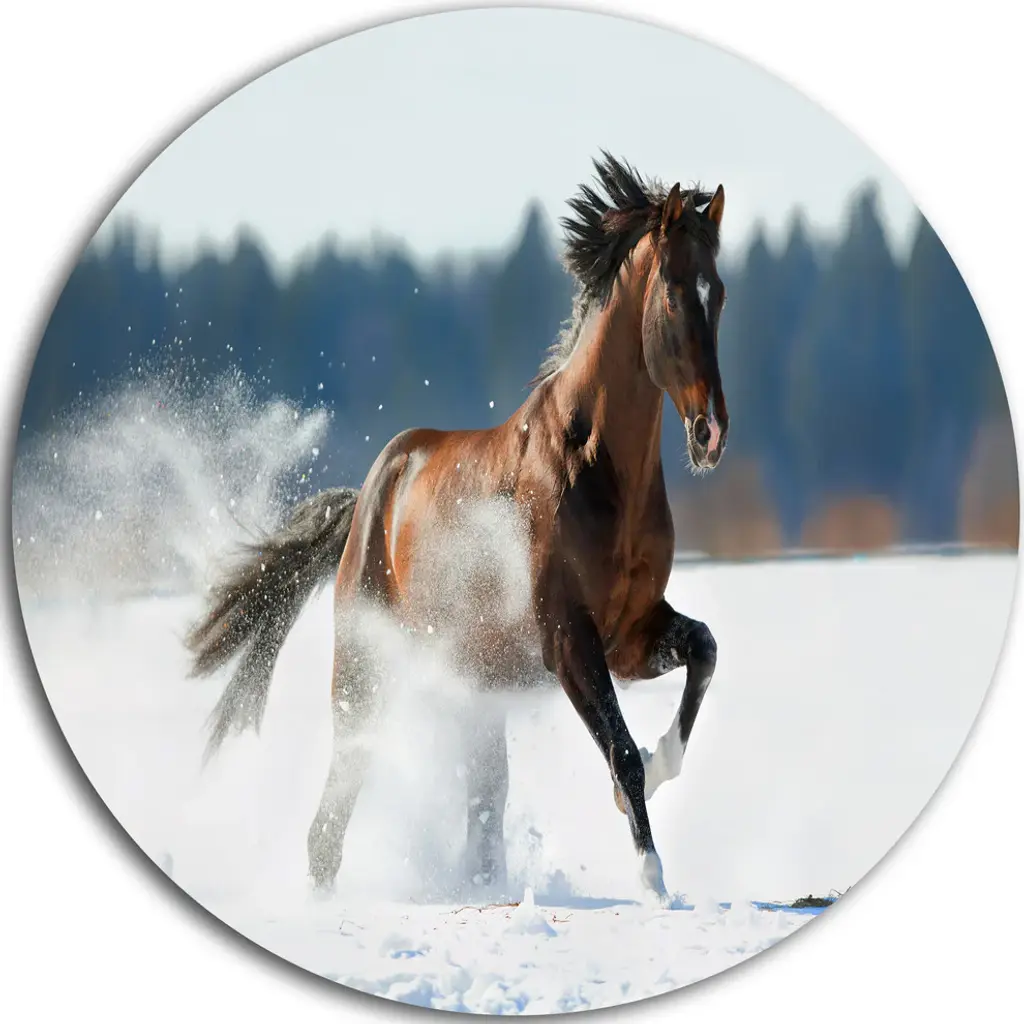 Bring contemporary abstraction to your home with this large 36W x 28H Metal Wall Art. This Horse Running in Winter Metal Artwork makes it the focal point of any room or office. - White gloss coating ensures colors are extra vibrant with light reflection.- Aluminum grade sheet metal with 1-inch mounting frame on the back giving the illusion that the artwork is floating on the wall.- Mounting brackets are included along with instructions.- High quality digital images are created directly into a glossy aluminum panel producing a stunning and captivating print into the glossy finish of the metal.- Water, fire and scratch resistant HD aluminum panels.- Looks better than any photo paper and guaranteed to last at least 20 years- Easy to clean with a microfiber cloth. Colors are far superior to regular canvas art. - Easy to hang