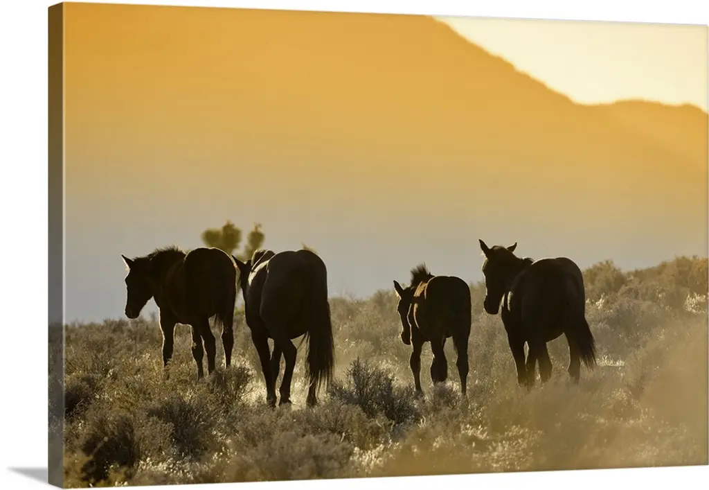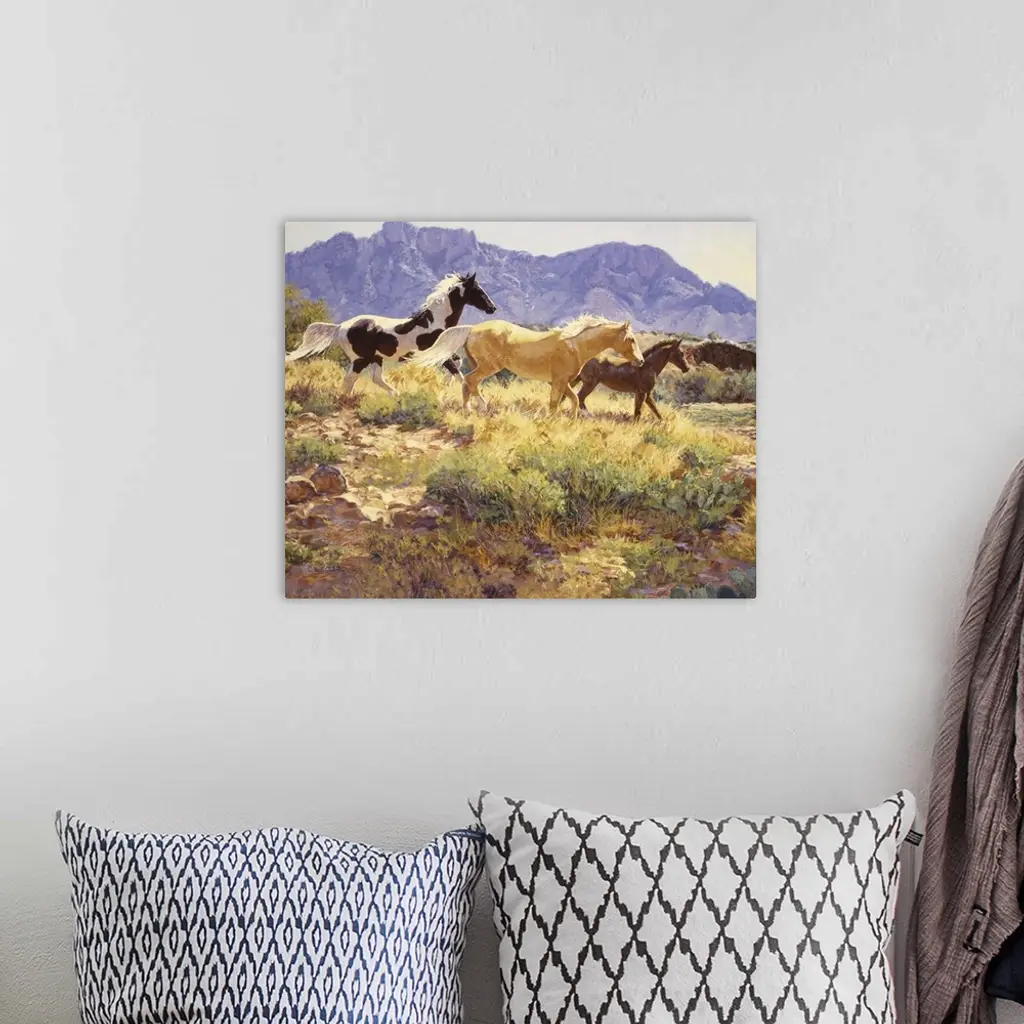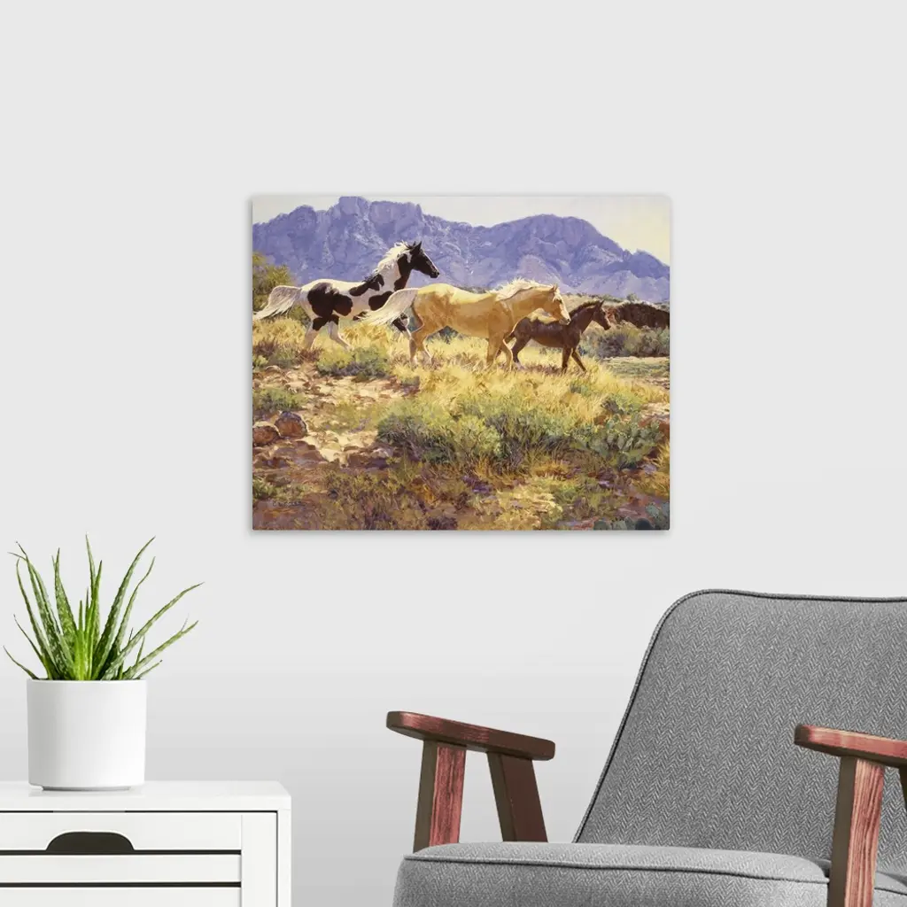 Contemporary colorful painting of a herd of horses running through a desert landscape.