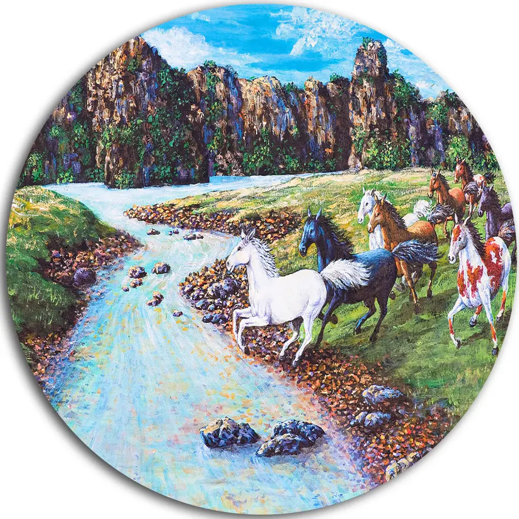 Bring contemporary abstraction to your home with this large 36W x 28H Metal Wall Art. This Horses Crossing the Stream Metal Artwork makes it the focal point of any room or office. - White gloss coating ensures colors are extra vibrant with light reflection.- Aluminum grade sheet metal with 1-inch mounting frame on the back giving the illusion that the artwork is floating on the wall.- Mounting brackets are included along with instructions.- High quality digital images are created directly into a glossy aluminum panel producing a stunning and captivating print into the glossy finish of the metal.- Water, fire and scratch resistant HD aluminum panels.- Looks better than any photo paper and guaranteed to last at least 20 years- Easy to clean with a microfiber cloth. Colors are far superior to regular canvas art. - Easy to hang