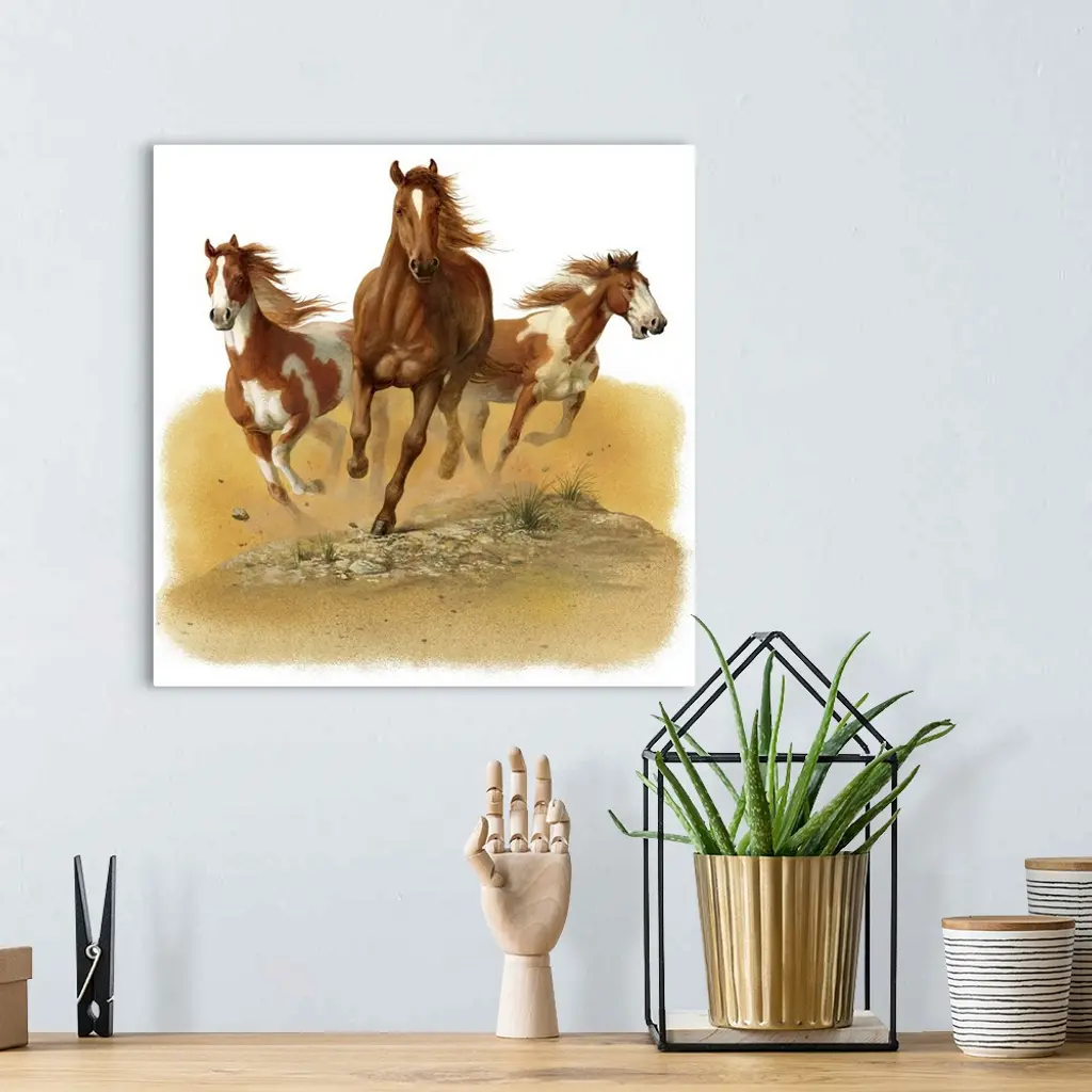 Contemporary painting of three horse in a gallop kicking up dust and dirt.