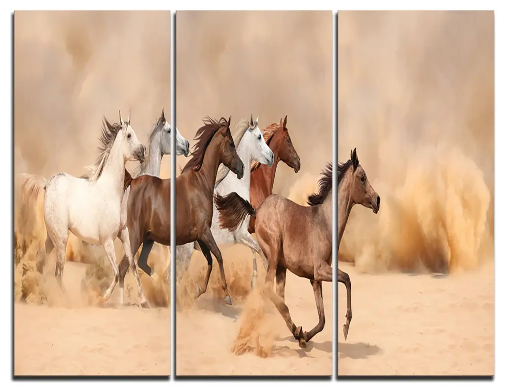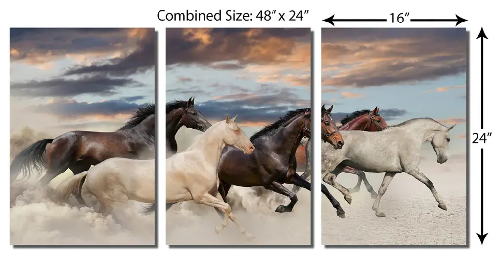 48"œ x 24"œ total size. Ready To Hang! (3 pieces - 16"œ x 24"œ each). 3 Panel Split (Triptych) Metal Print of wild Horses galloping in desert. Modern metal wall art for home or office wall decor & interior design. Printed on Luxurious, HD aluminum glossy metal panels. Multi panel art.. HD aluminum panels. Metal print wall art. Includes Shadow Wall Mount on the back.• Aluminum Metal Wall Art• Made in USA• Ready to hang - No assembly required• Shadow mount hardware on the back• 0.045"œ thick HD Aluminum Panels• Scratch resistant, glossy finish• Superb color clarity, luxurious prints• Epson printing process• For indoor or moisture rich environment use• Easy to clean. Gently wipe with microfiber cloth.
