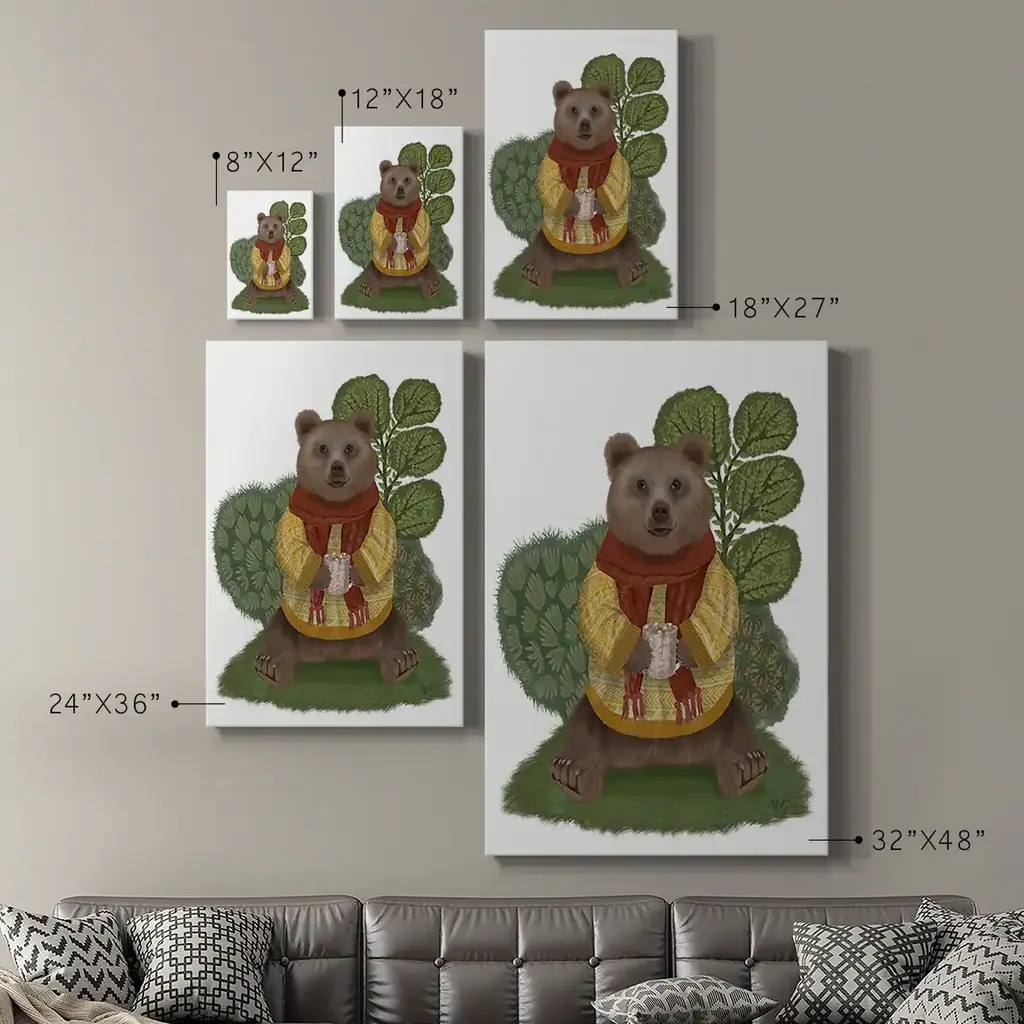 Hot Chocolate Bear Premium Gallery Wrapped Canvas - Ready to Hang A premium hand stretched gallery wrapped canvas print created to last. Featuring a beveled a solid wood stretcher bar, each piece comes ready to hand 6 SIZES AVAILABLE 8''X12'' - Overall Size 12''X18'' - Overall Size 18''X27'' - Overall Size 24''x36'' - Overall Size 32''x48'' - Overall Size 40''x60'' - Overall Size Each piece is made to order. Built to Last Each piece comes ready to hang Solid wood stretcher Fade and Water resistant Made domestically
