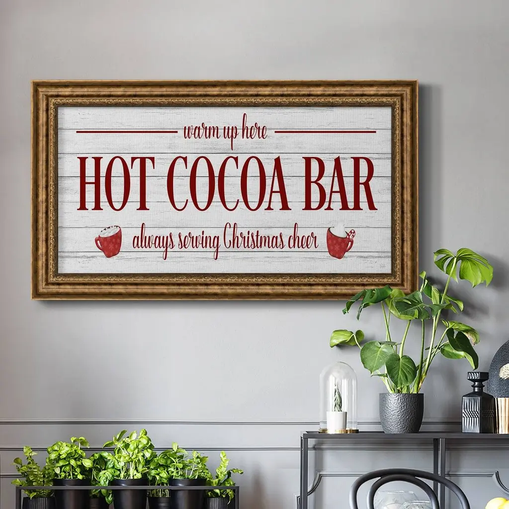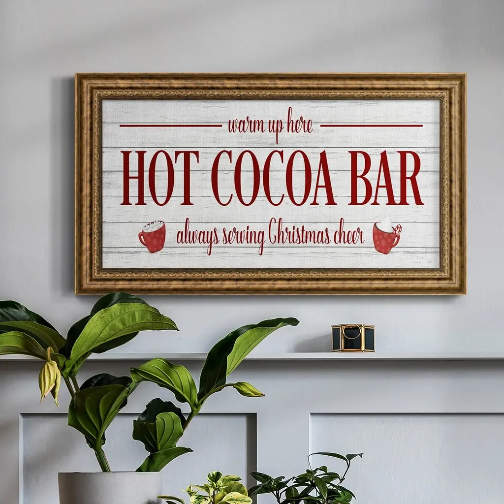 Hot Cocoa Bar Premium Framed Canvas- Ready to Hang A Premium Framed Canvas created to last. Framed in distressed wood and available in an array of sizes and colors Featuring a beveled a solid wood stretcher bar, each piece comes ready to hand 3 SIZES AVAILABLE 21''X37'' - Overall Size 25''X45'' - Overall Size 29''x53'' - Overall Size Each piece is made to order. Each piece comes with hanging hardware. Made in the USA Ready to Hang Giclee Paper Print Acrylic Glass Beveled Matt Board