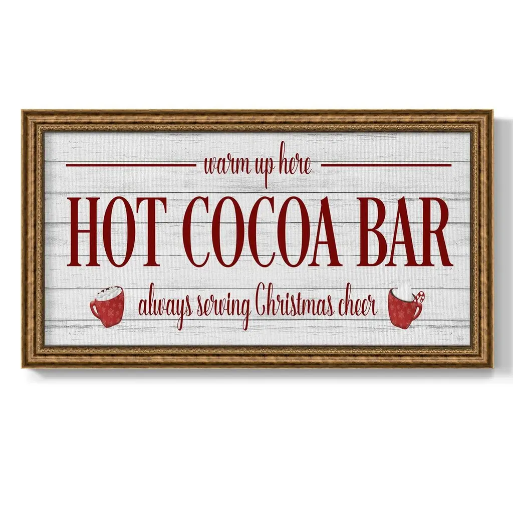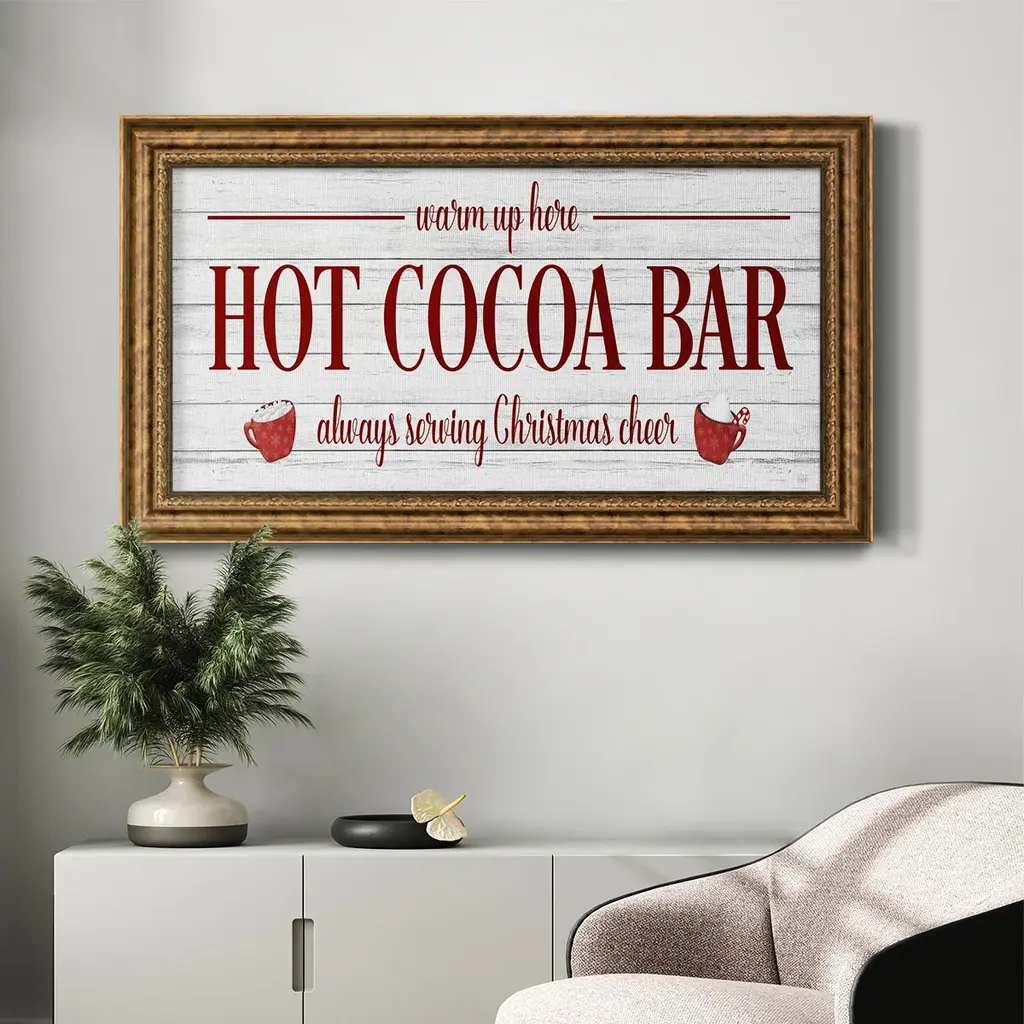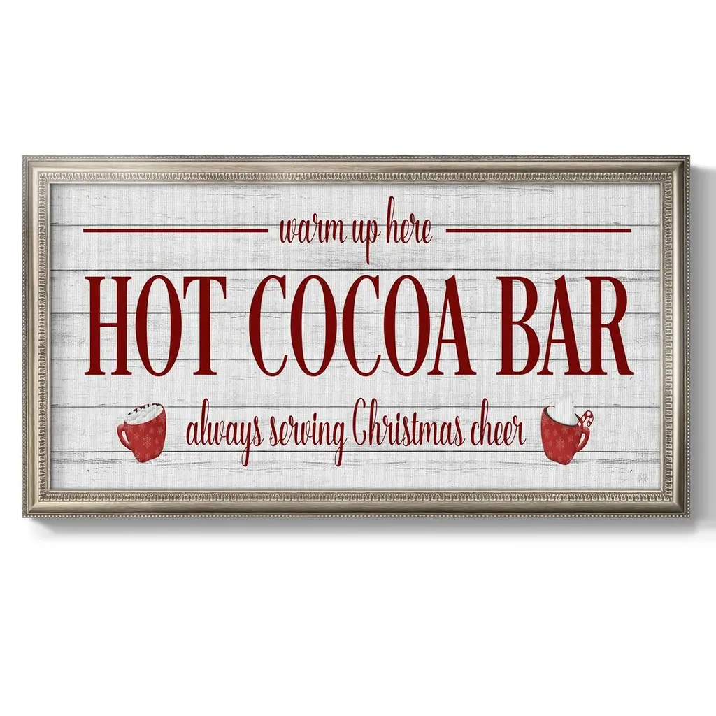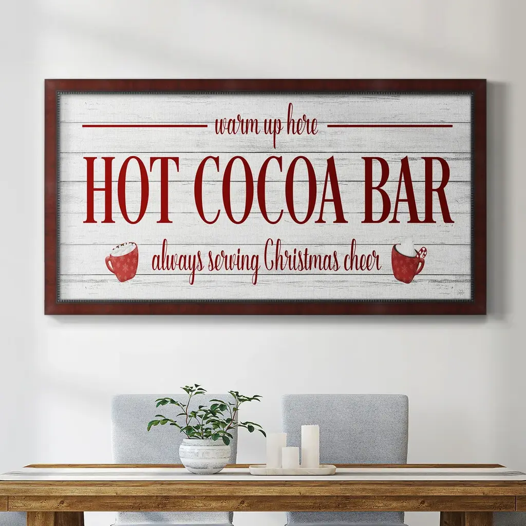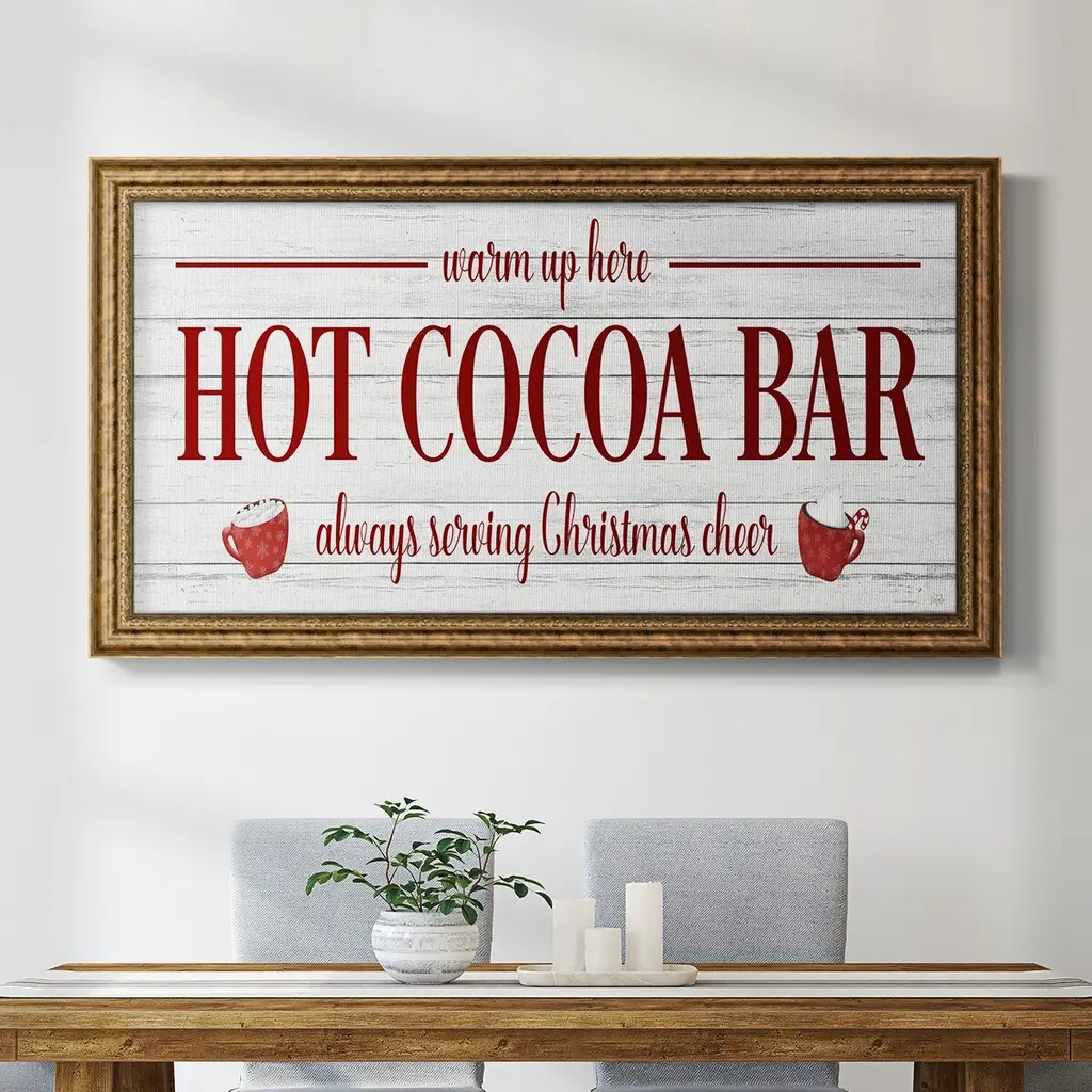 Hot Cocoa Bar Premium Framed Canvas- Ready to Hang A Premium Framed Canvas created to last. Framed in distressed wood and available in an array of sizes and colors Featuring a beveled a solid wood stretcher bar, each piece comes ready to hand 3 SIZES AVAILABLE 21''X37'' - Overall Size 25''X45'' - Overall Size 29''x53'' - Overall Size Each piece is made to order. Each piece comes with hanging hardware. Made in the USA Ready to Hang Giclee Paper Print Acrylic Glass Beveled Matt Board