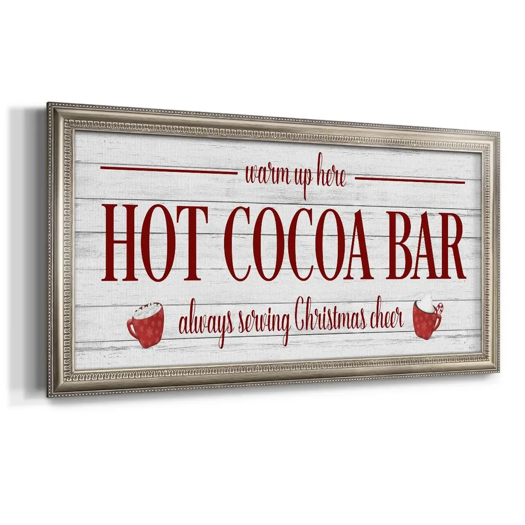 Hot Cocoa Bar Premium Framed Canvas- Ready to Hang A Premium Framed Canvas created to last. Framed in distressed wood and available in an array of sizes and colors Featuring a beveled a solid wood stretcher bar, each piece comes ready to hand 3 SIZES AVAILABLE 21''X37'' - Overall Size 25''X45'' - Overall Size 29''x53'' - Overall Size Each piece is made to order. Each piece comes with hanging hardware. Made in the USA Ready to Hang Giclee Paper Print Acrylic Glass Beveled Matt Board