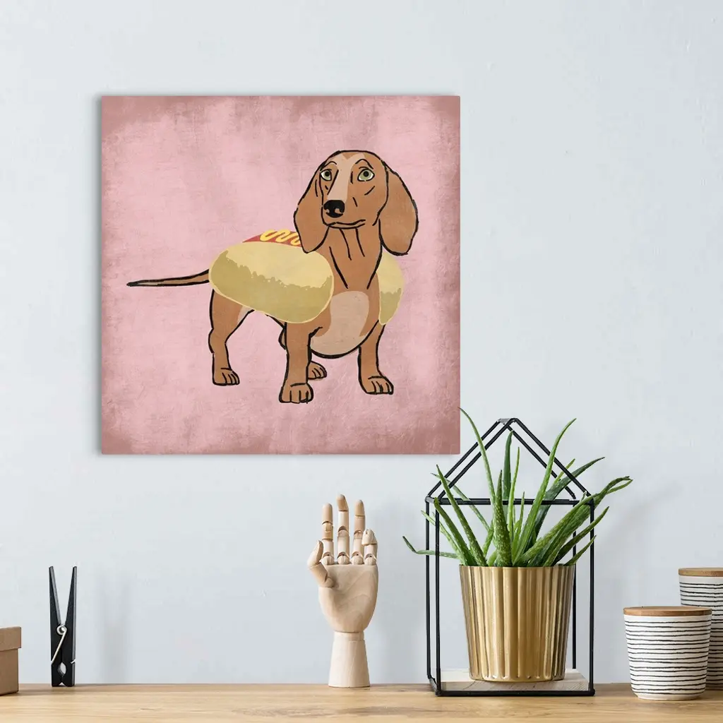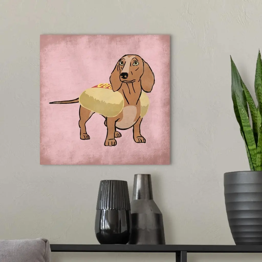 A painting of a doxen wearing a hot dog costume.